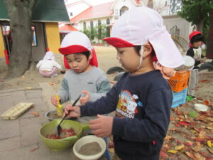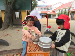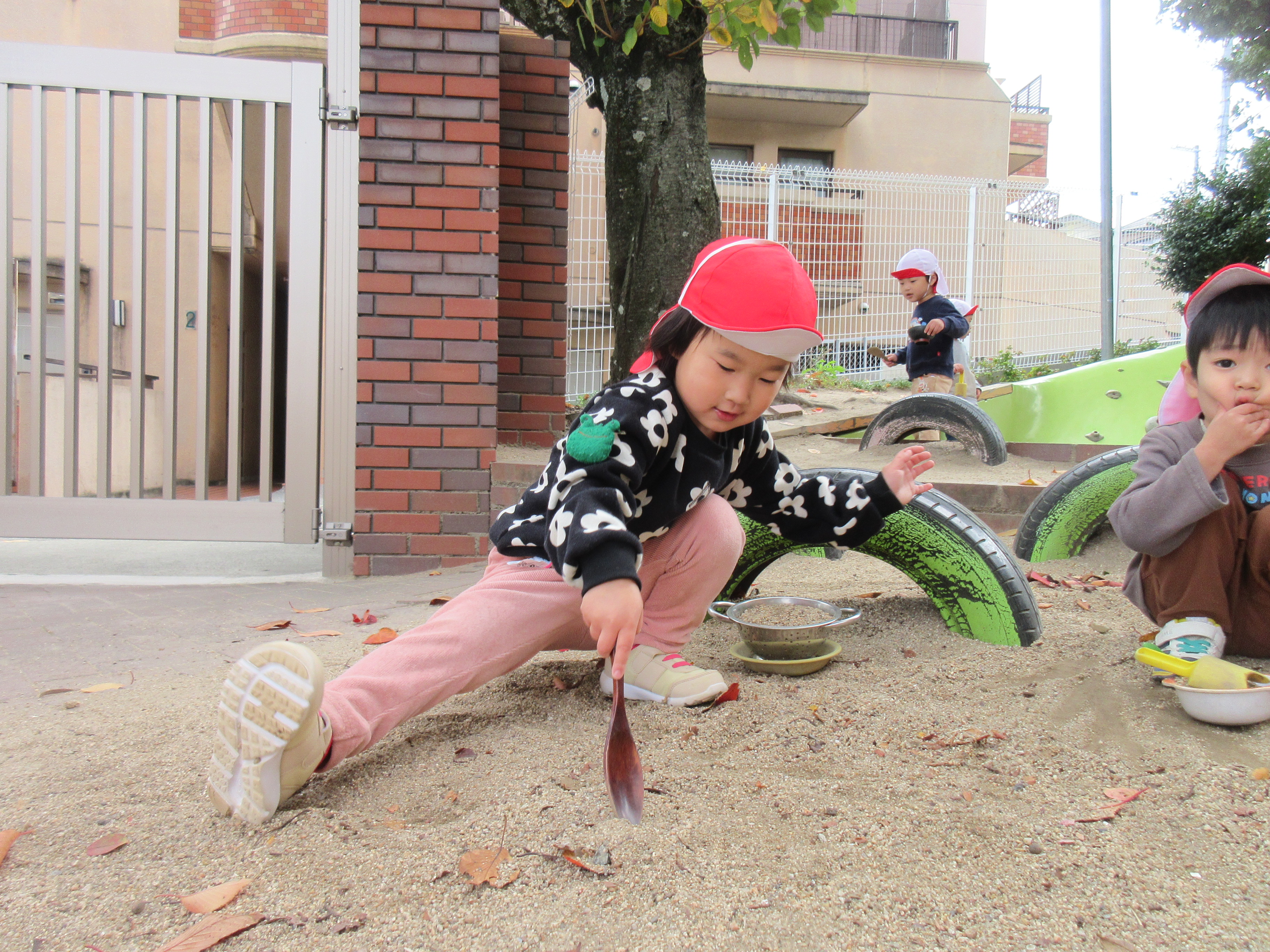 寒さに負けずお外でも沢山遊びました(^^)/落ち葉を拾いお料理をしたり、どんぐりを拾ったりと秋ならではの遊びを楽しんでいます♡