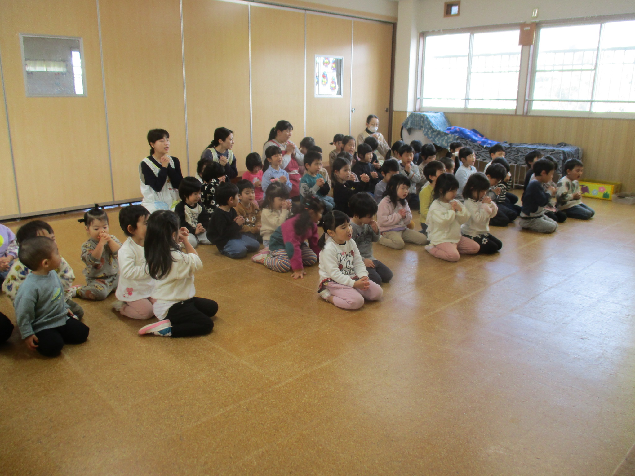 イム先生のお話聞いてお祈りをしたり讃美歌をみんなで歌ったりしました。