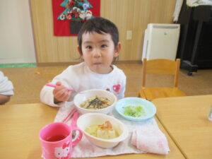 今日の給食は五目御飯・ゆかり和え・湯豆腐でした。