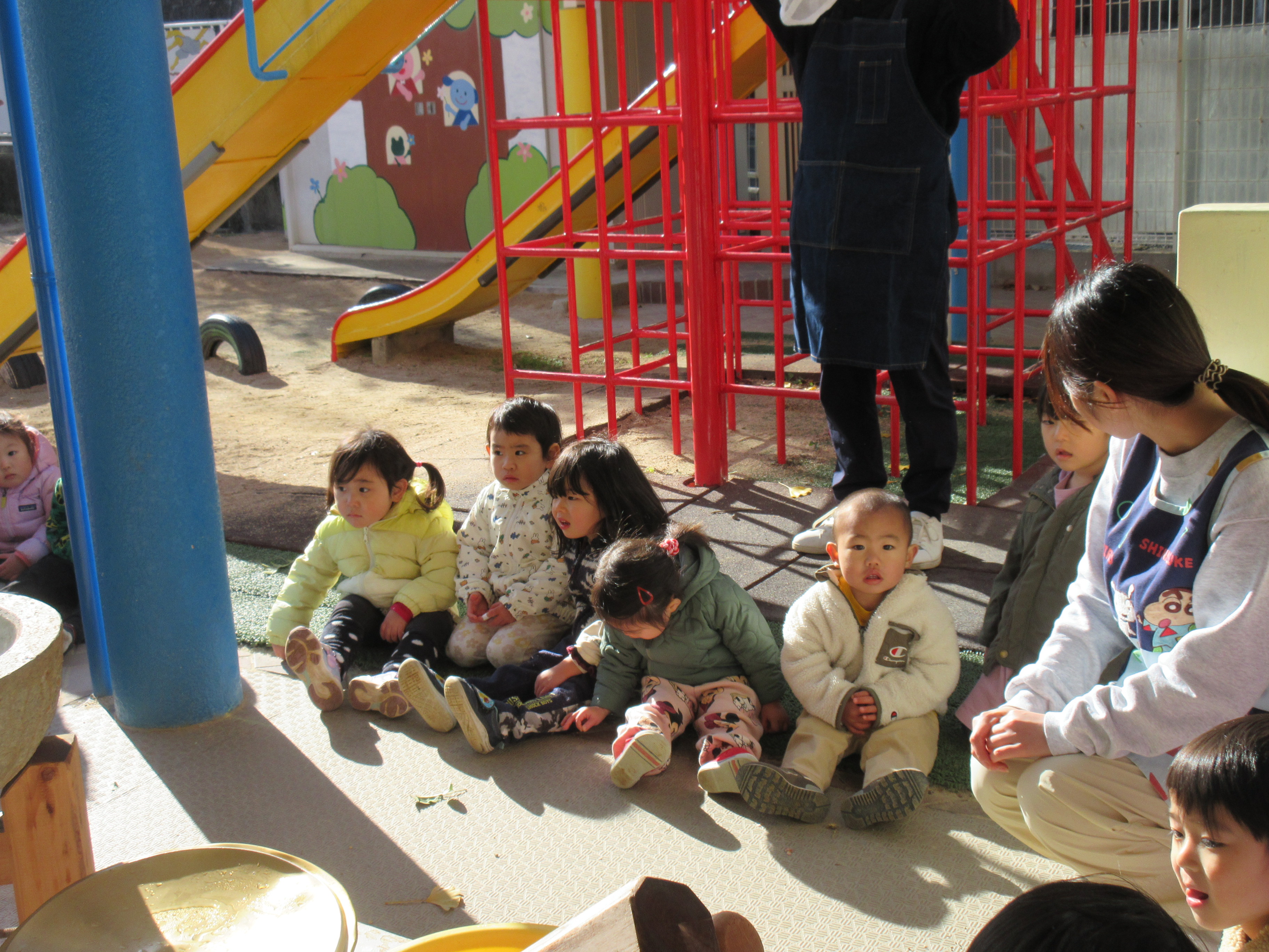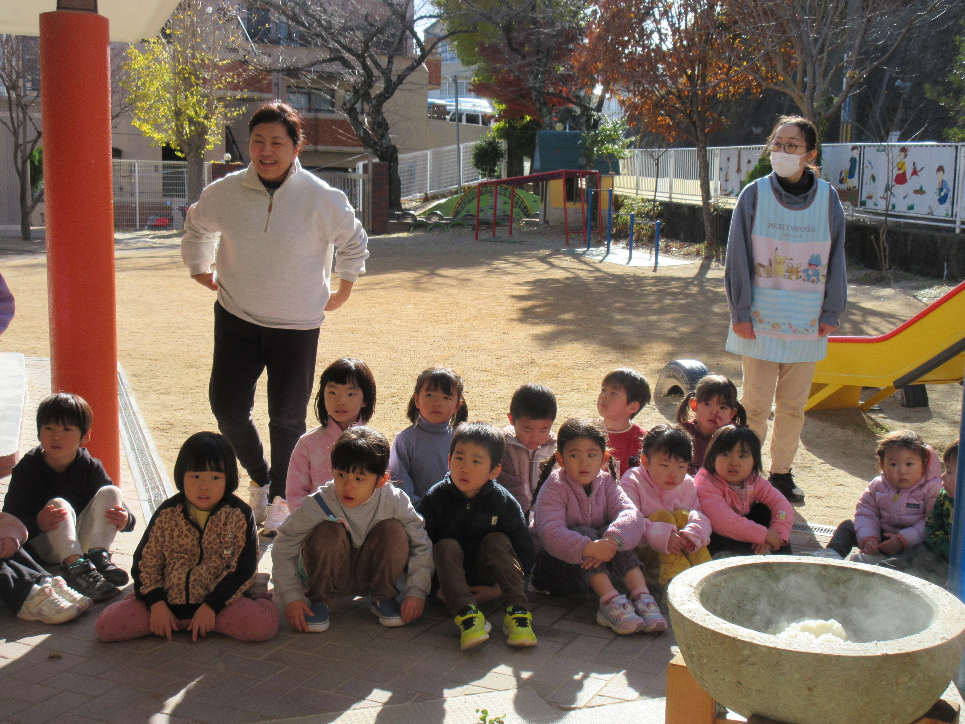 朝から杵と臼が出ていたので子どもたちも興味津々で、「これなぁに?」「お餅ぺったんするの?」とお餅つきを楽しみにしている様子でした♡