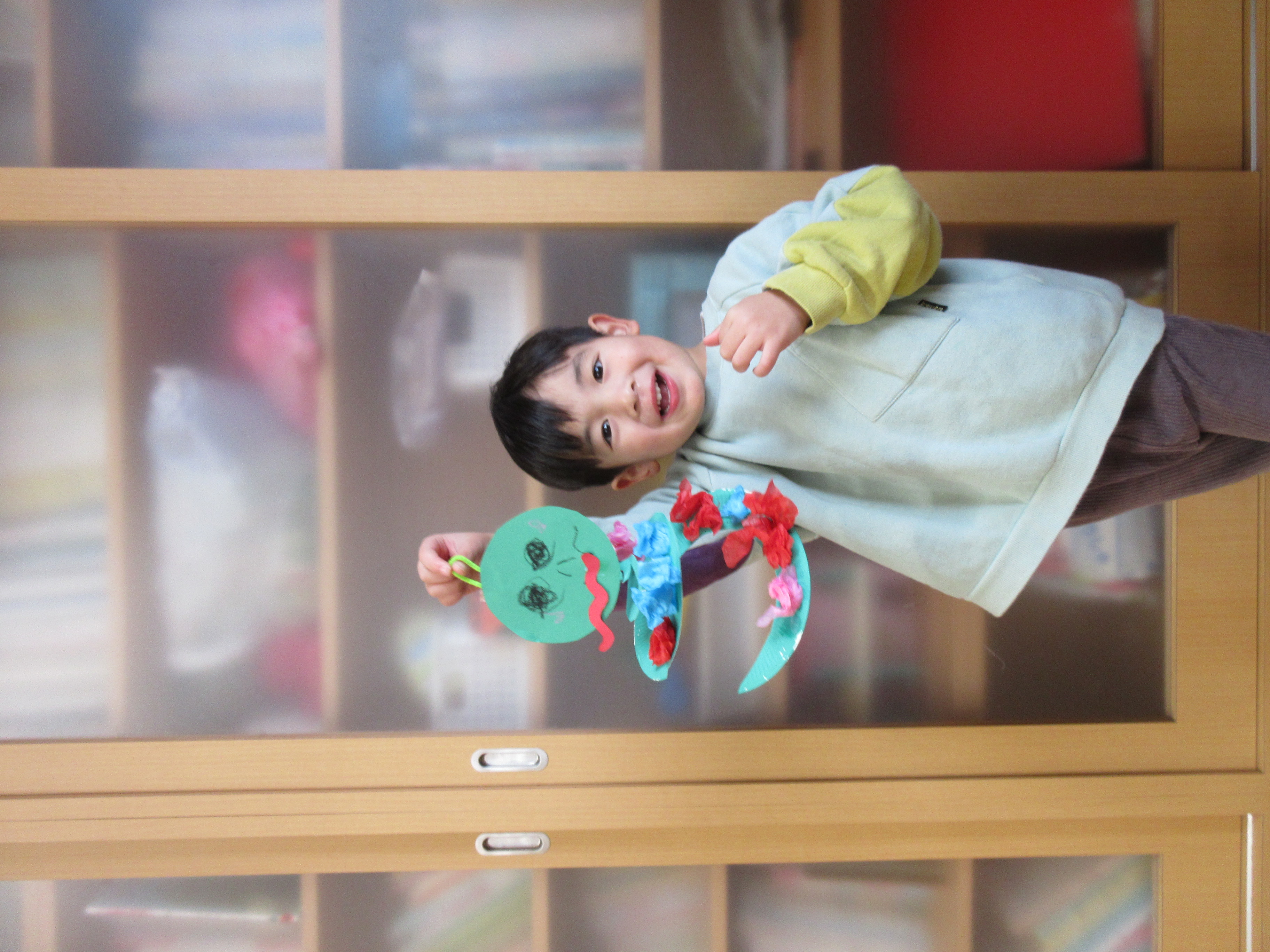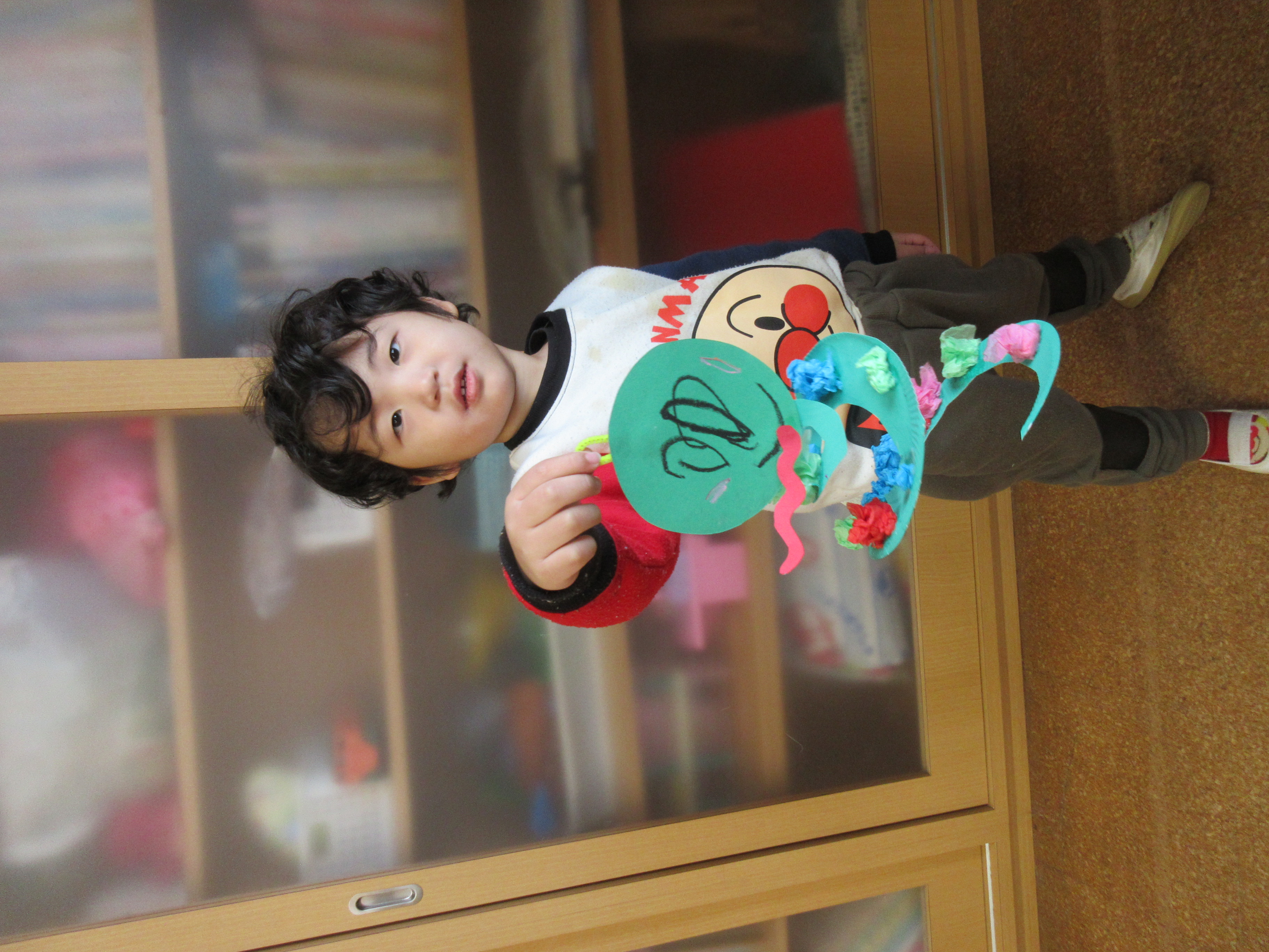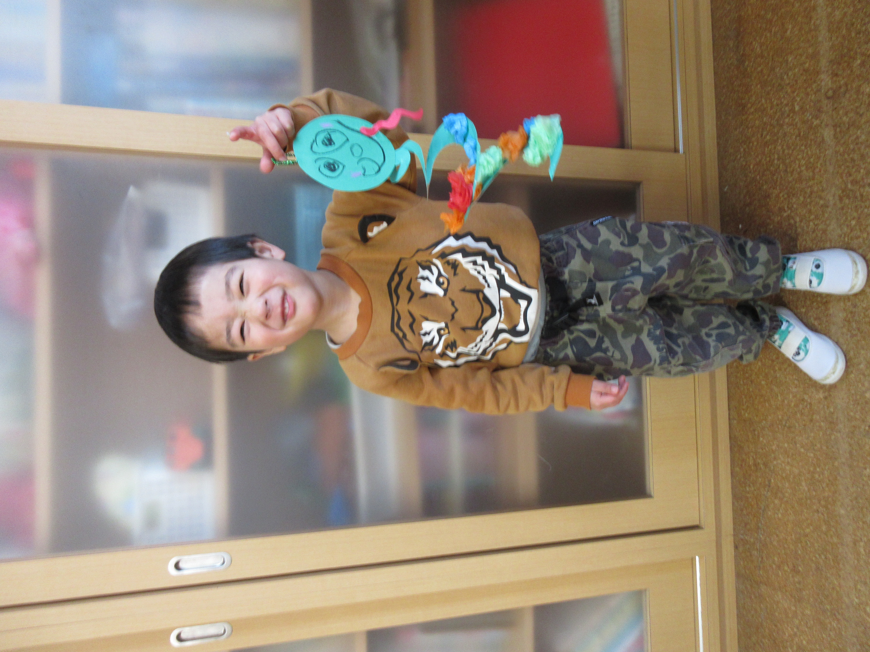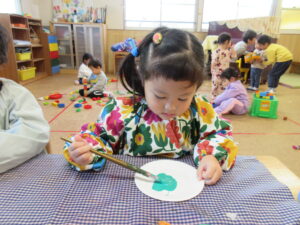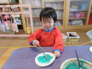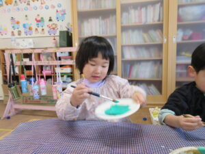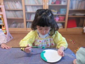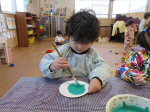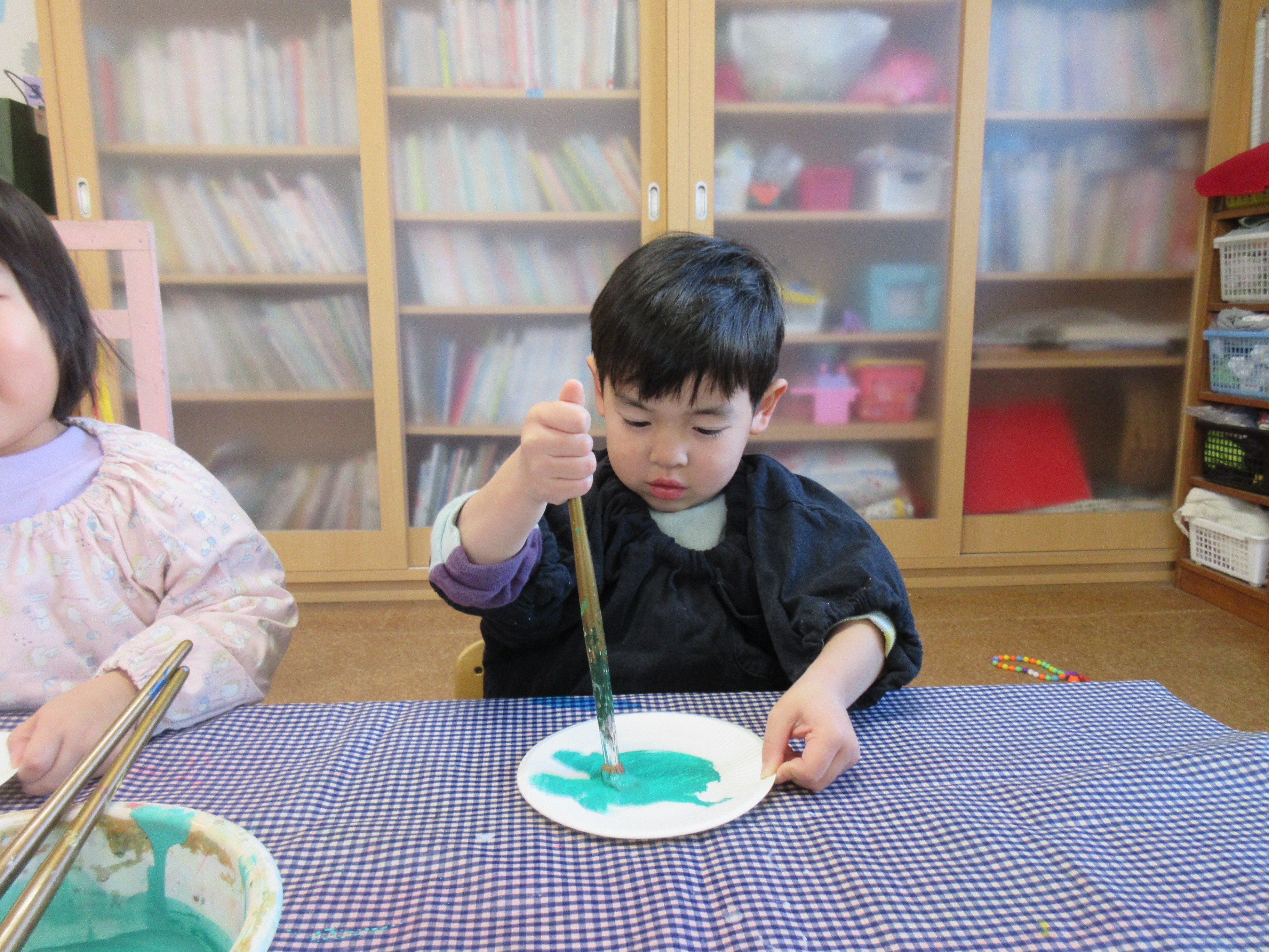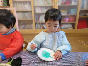 今年はへび年なので紙皿を絵の具で緑色に塗りへびを作りました!端っこまできれいに塗るのが難しかったようですが、集中して取り組む子どもたちでした♪