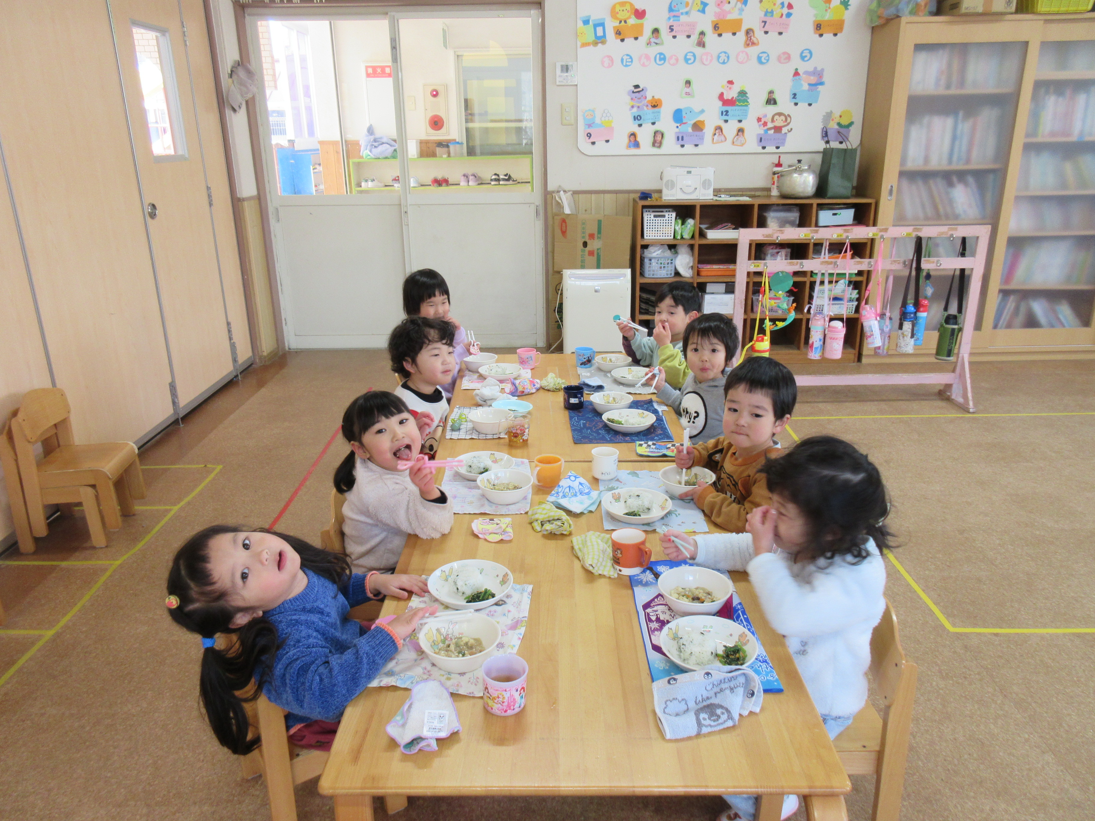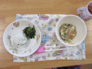 今日の給食は入り豆腐、おにぎり、胡麻和えでした(^^)/久しぶりの給食もモリモリ食べていました🌼