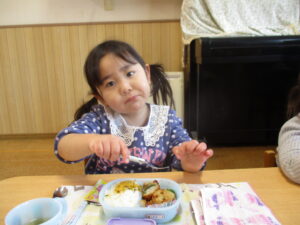 今日の給食(2号認定)はご飯・そぼろ味噌炒め・すまし汁・リンゴでした。