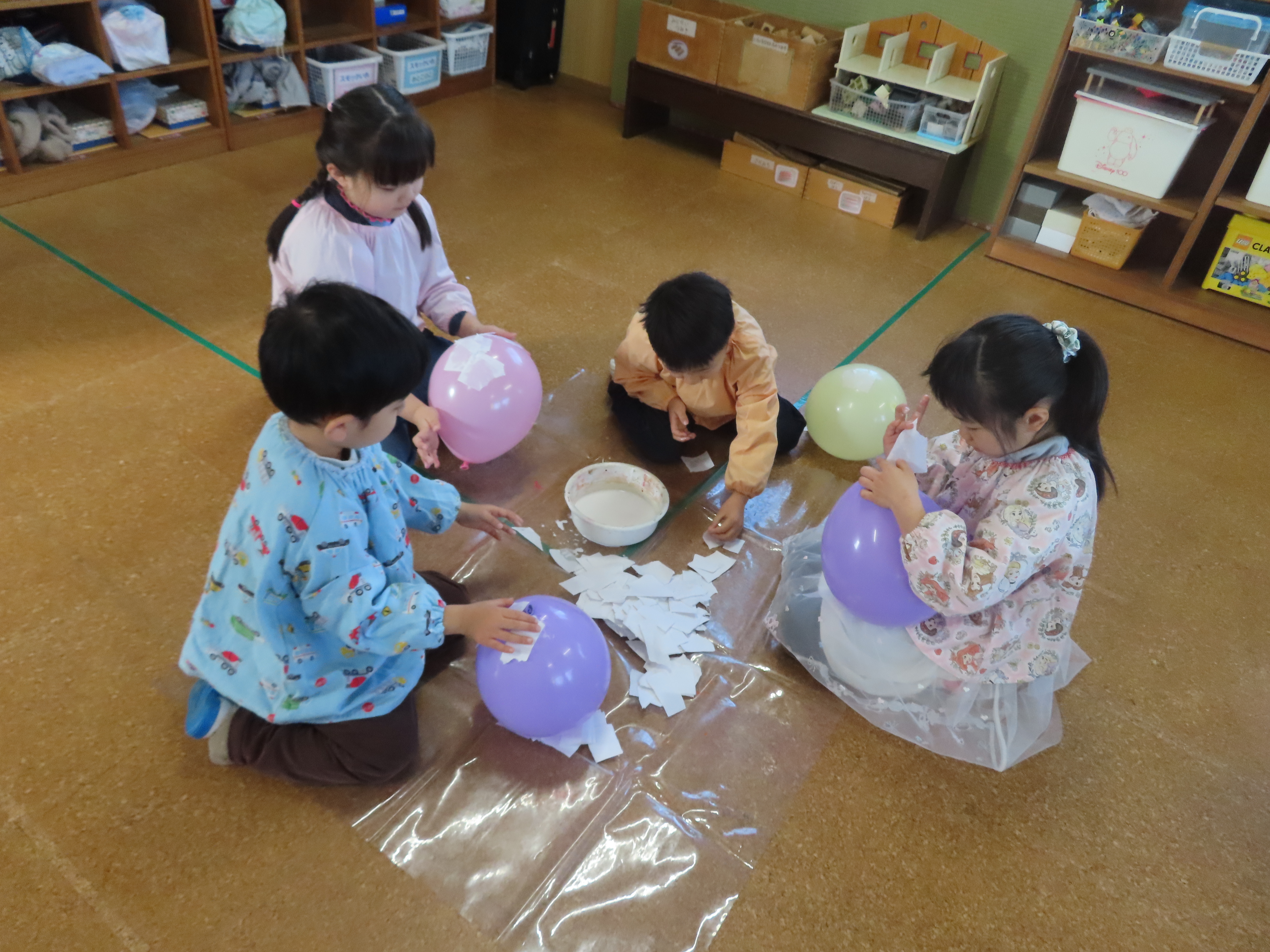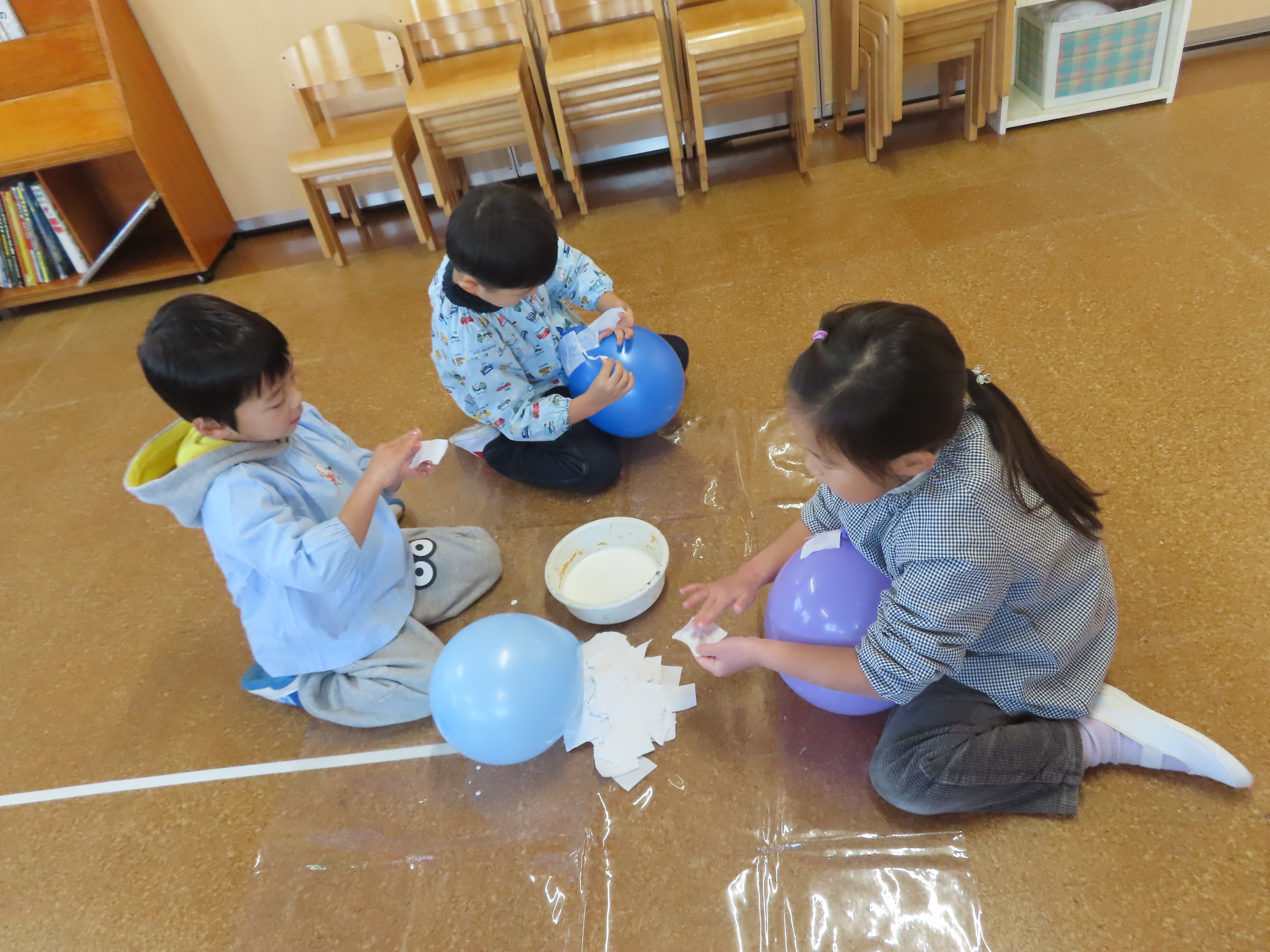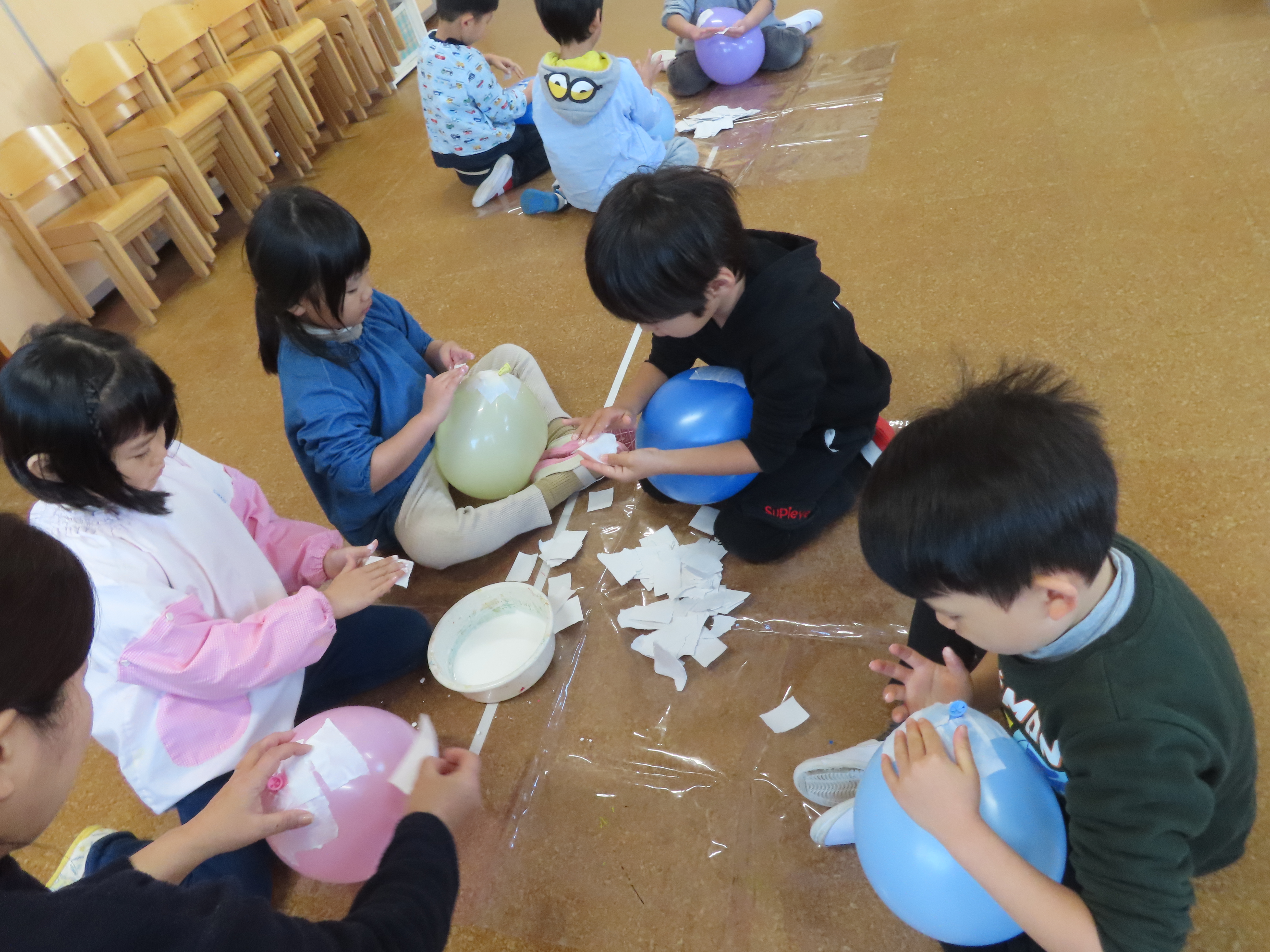 ボンドを半紙に塗って、ぺたぺた風船に貼っていきます。「飛んでいくー」というなか、股でおさえてみたり、足でおさえてみたり・・・