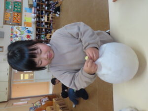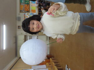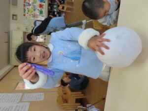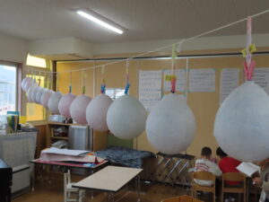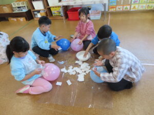 風船を切って、中から風船をとりだしました。大きな綿菓子みたい😊と嬉しそうな子供たち。