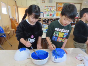 次は半分に切って、赤鬼・青鬼へ色塗りです。