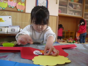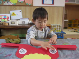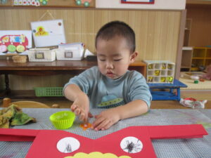 顔のどこに目・鼻・眉毛があるか考えながらする子どもたち。
