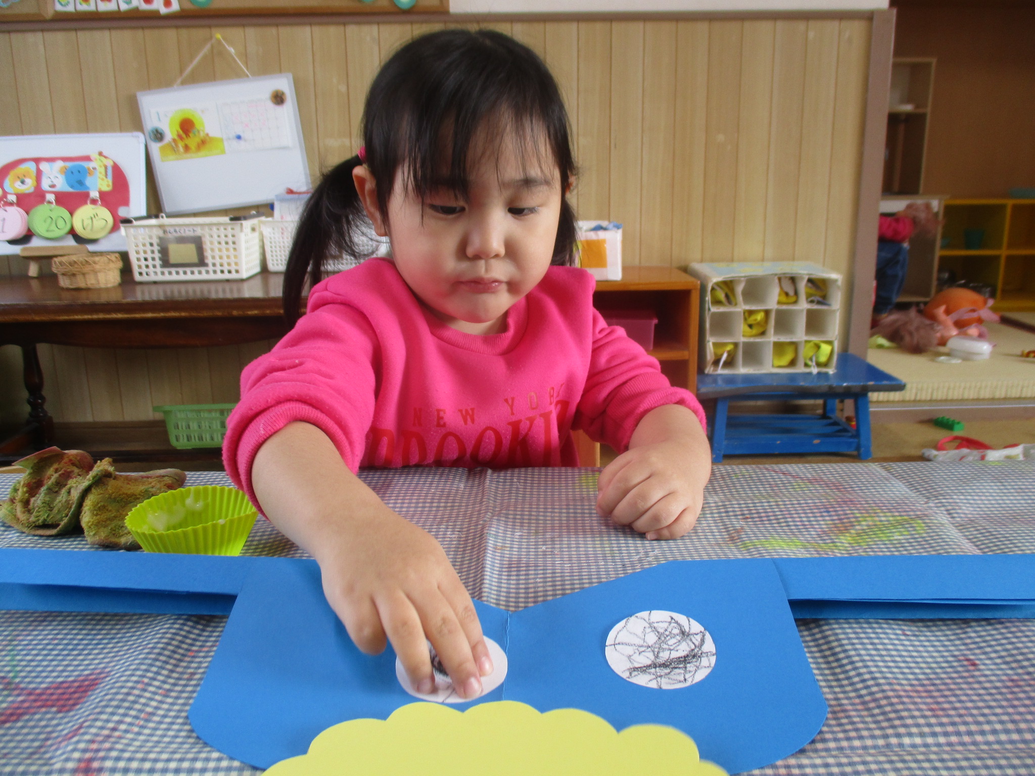 顔のどこに目・鼻・眉毛があるか考えながらする子どもたち。