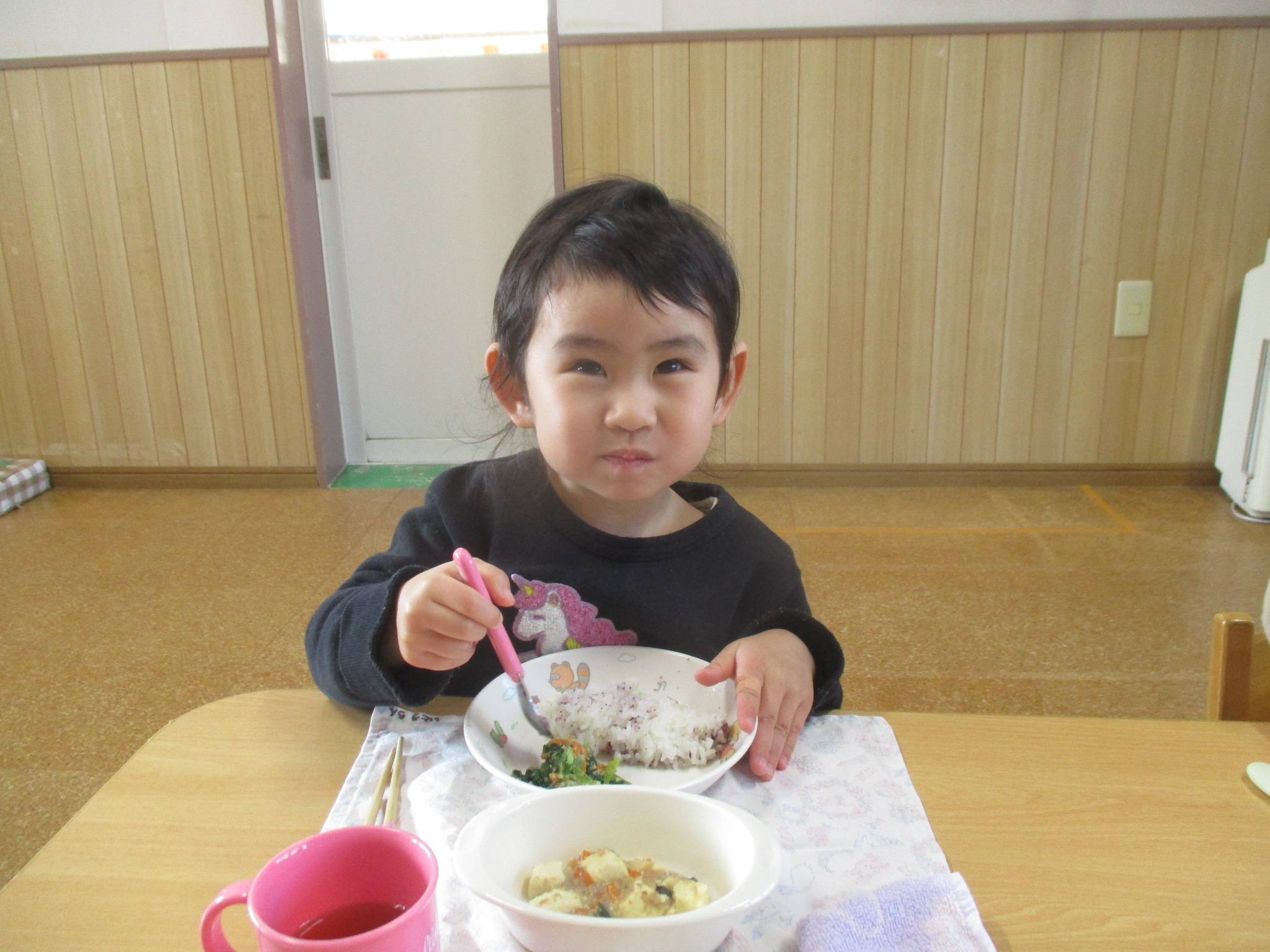 今日の給食はご飯・麻婆豆腐・胡麻和えでした。
