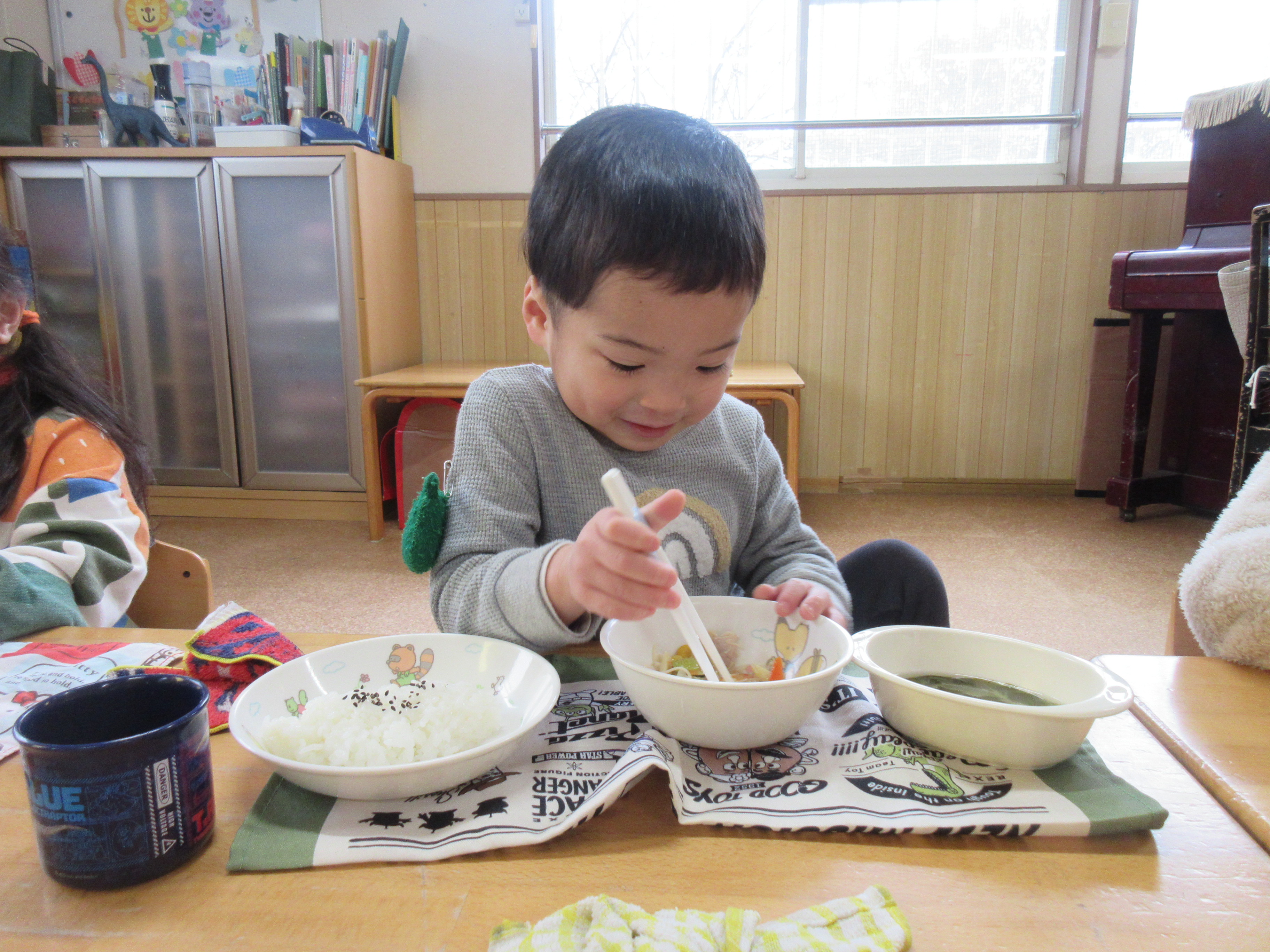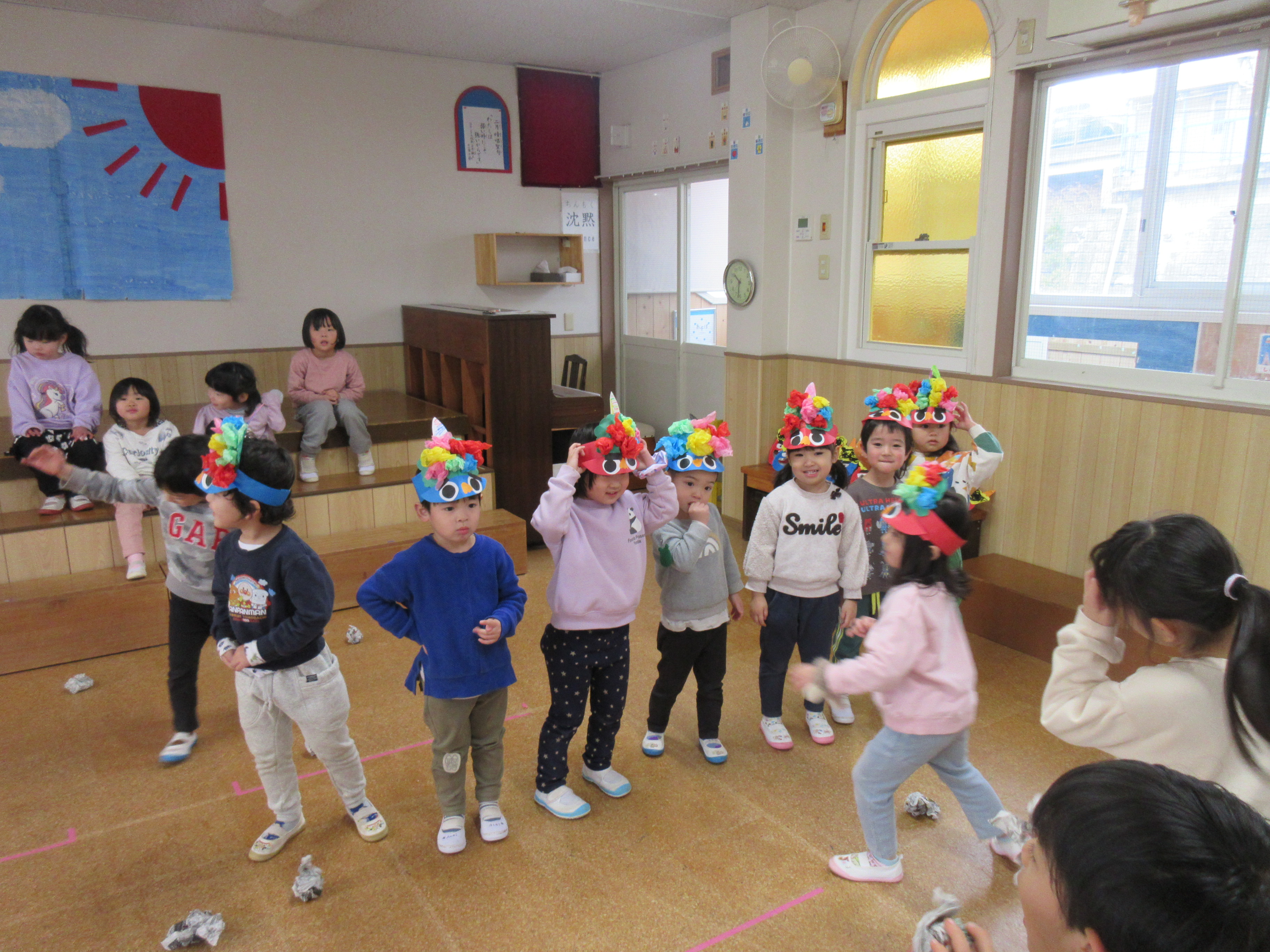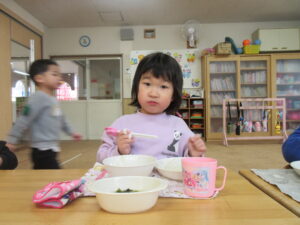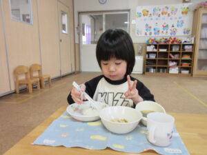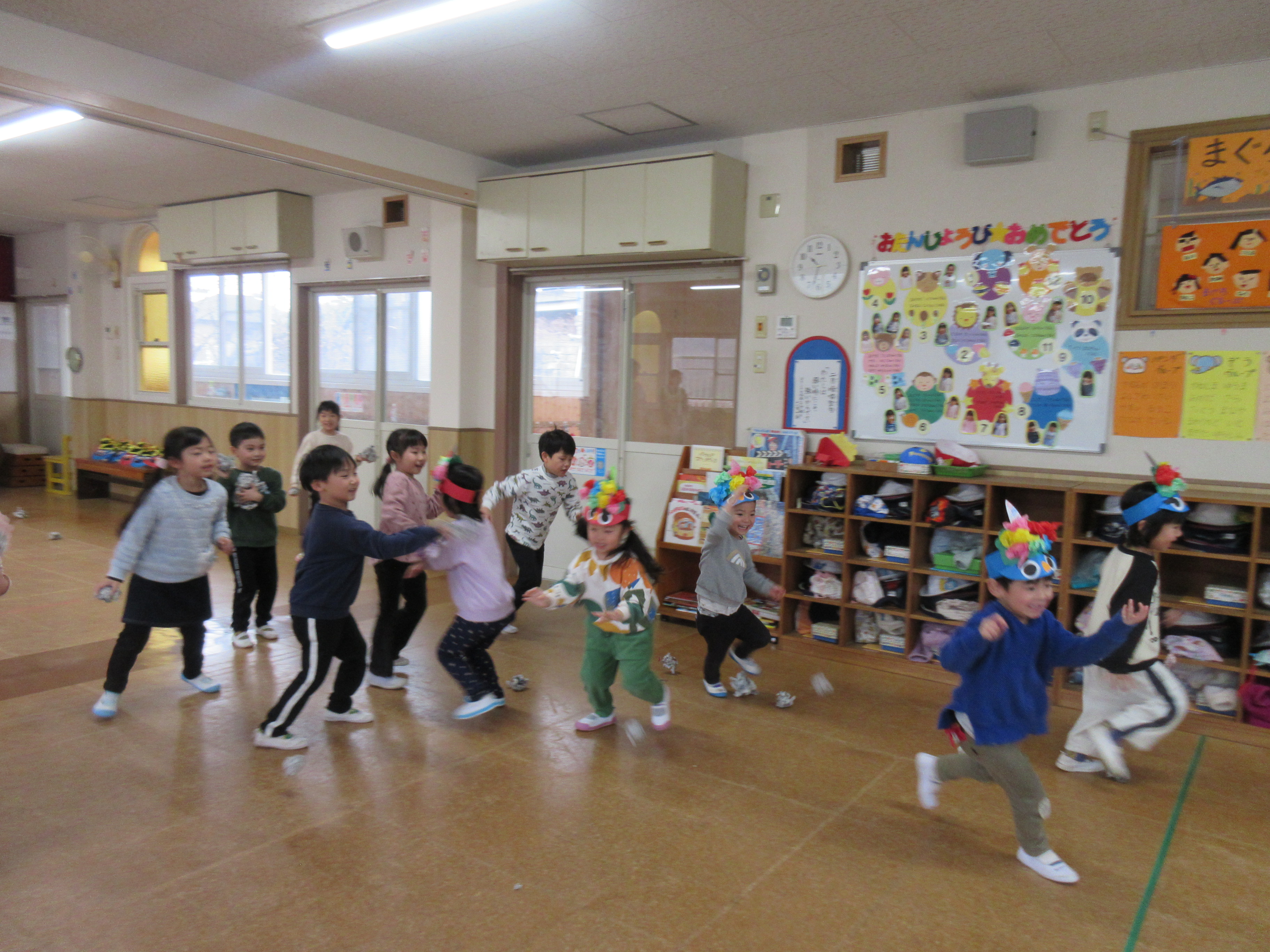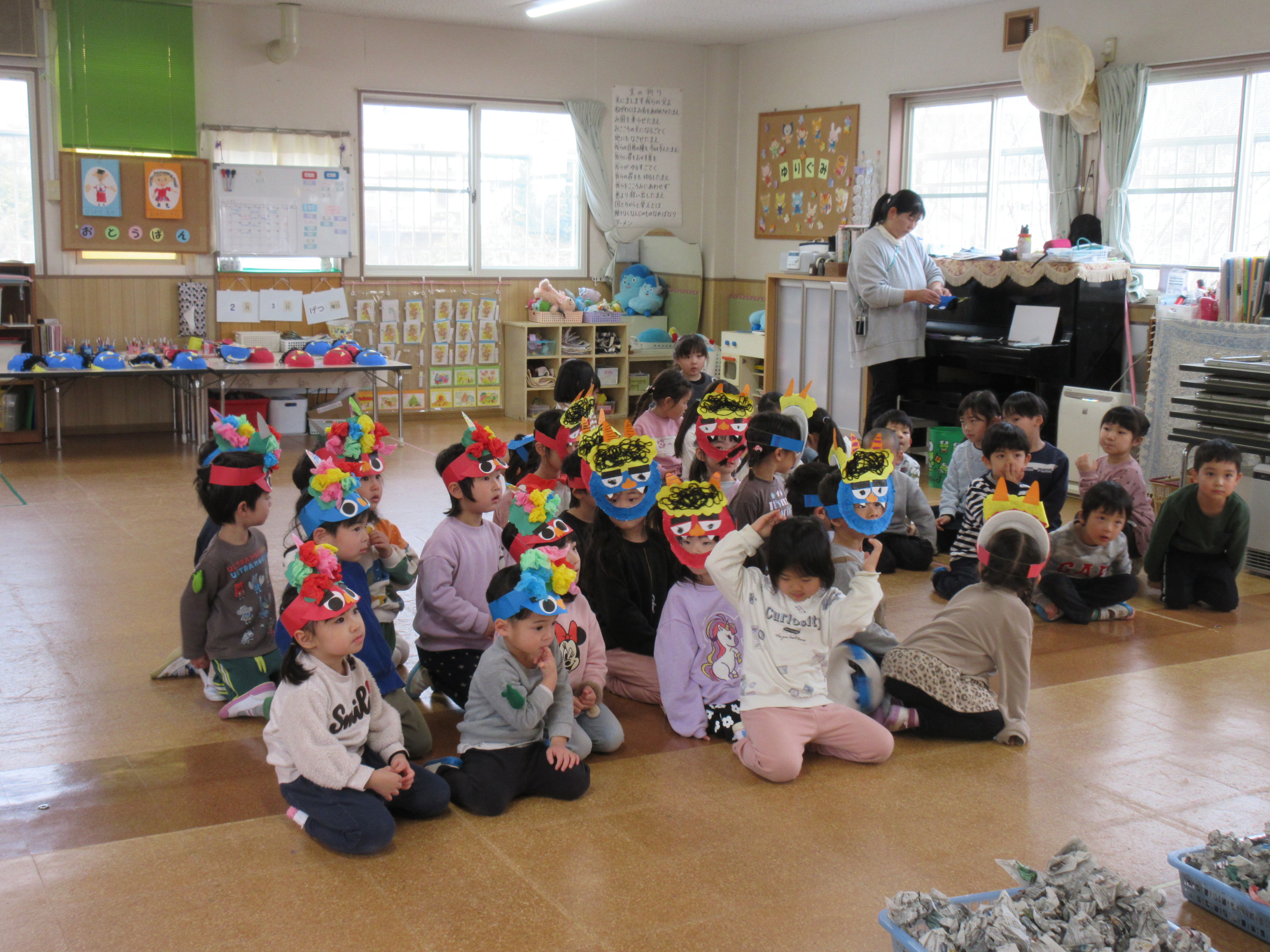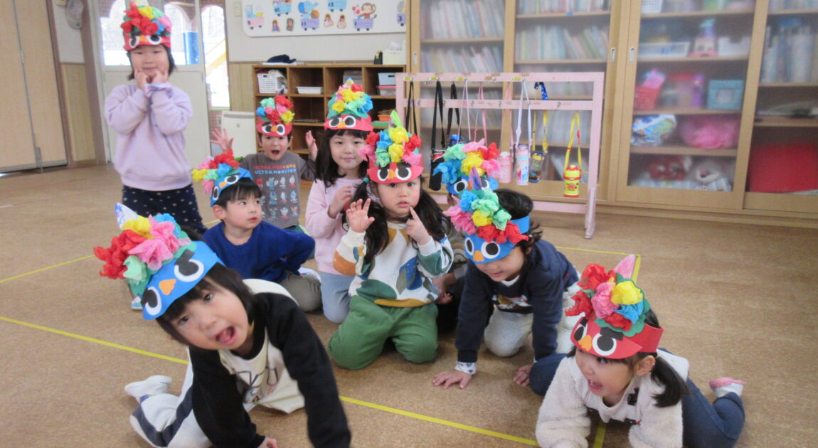 今日はみんなで鬼面をかぶって豆まきをしました!順番に鬼になって逃げたり、鬼を追いかけたりとっても楽しそうな姿が見られました(^^)/それぞれ個性あふれる鬼が沢山で可愛らしかったです♡豆まきを通して悪い鬼を追い払い良い福を呼び込んだのでいい年になりますように、、、