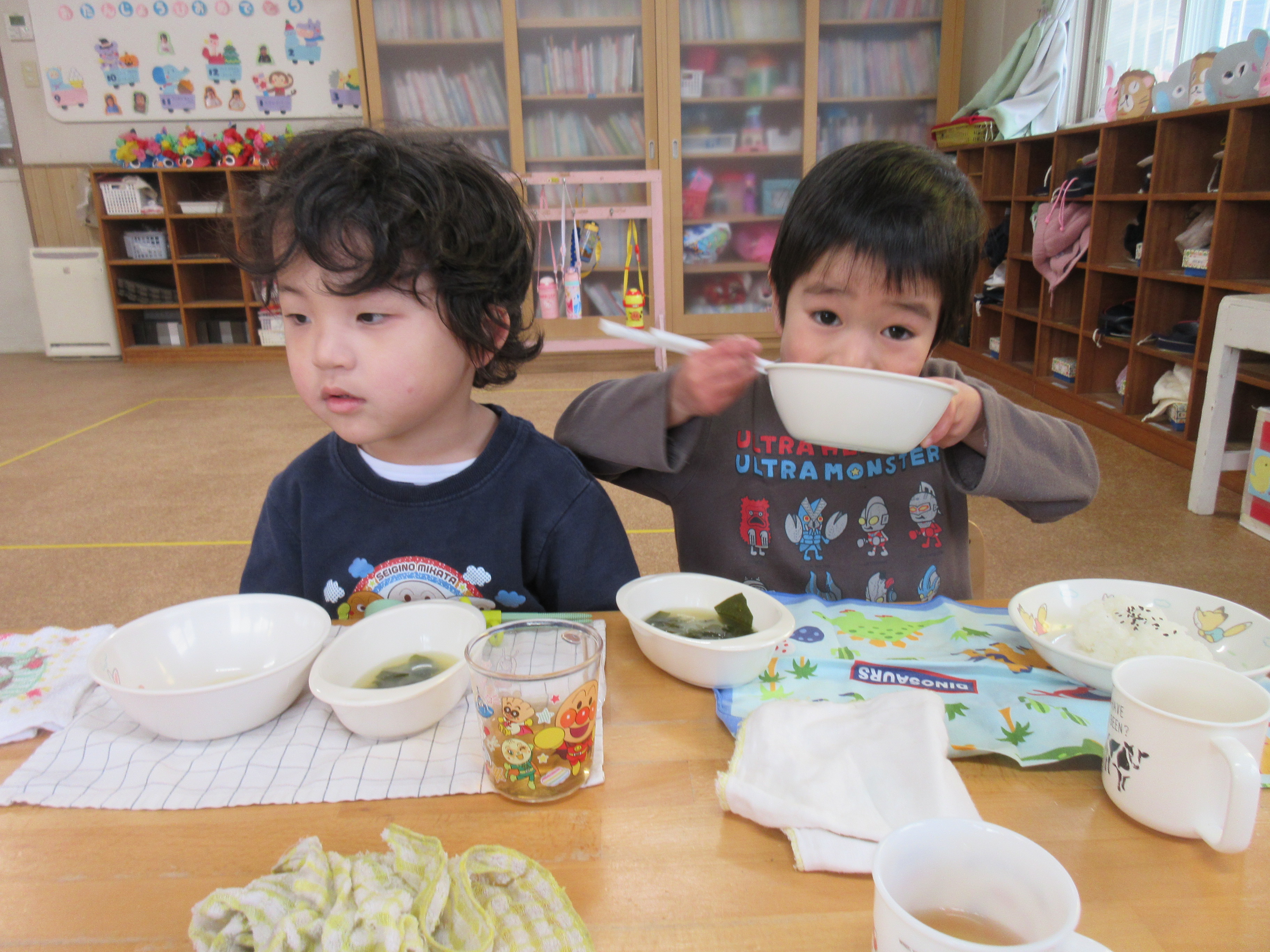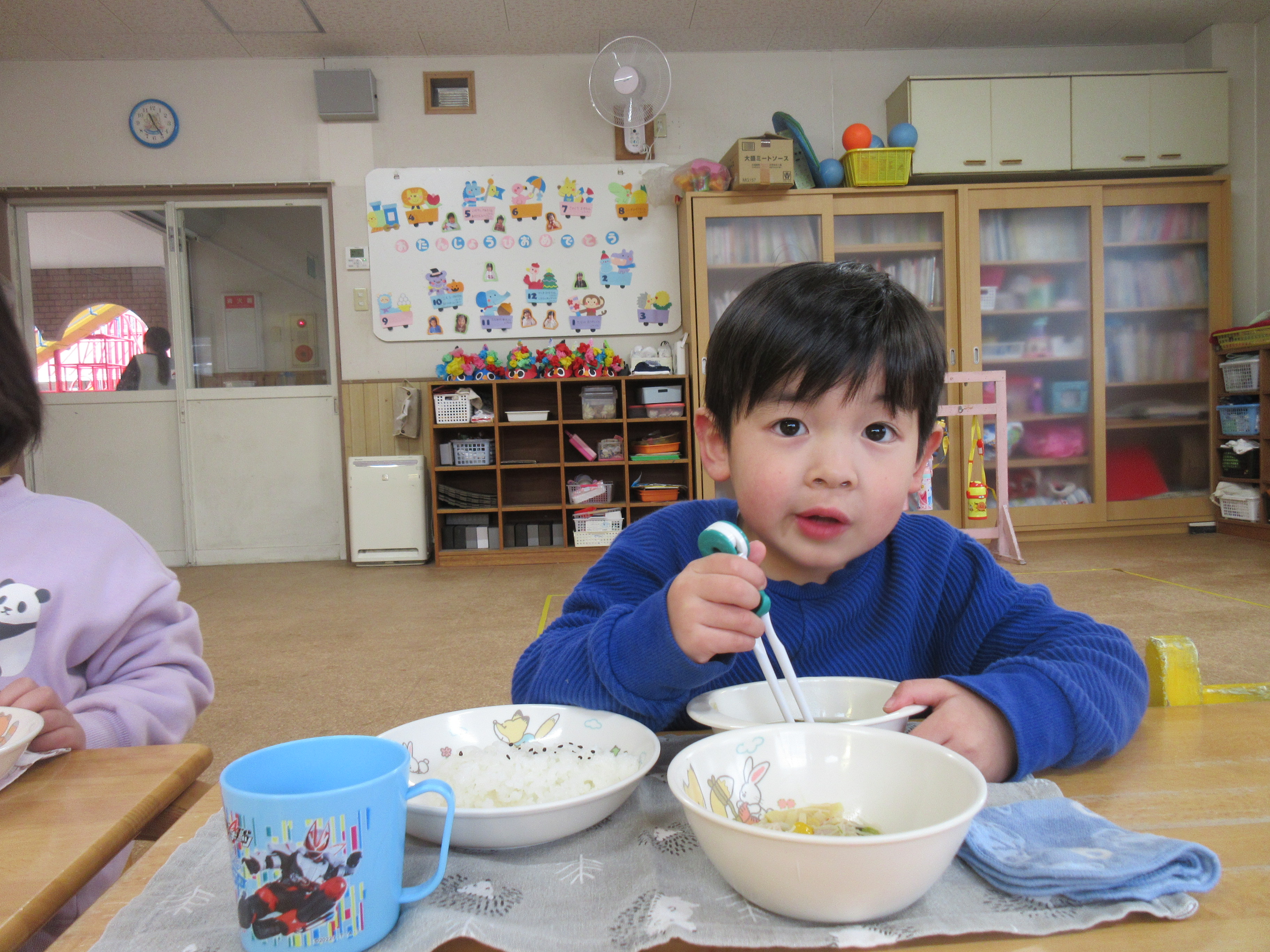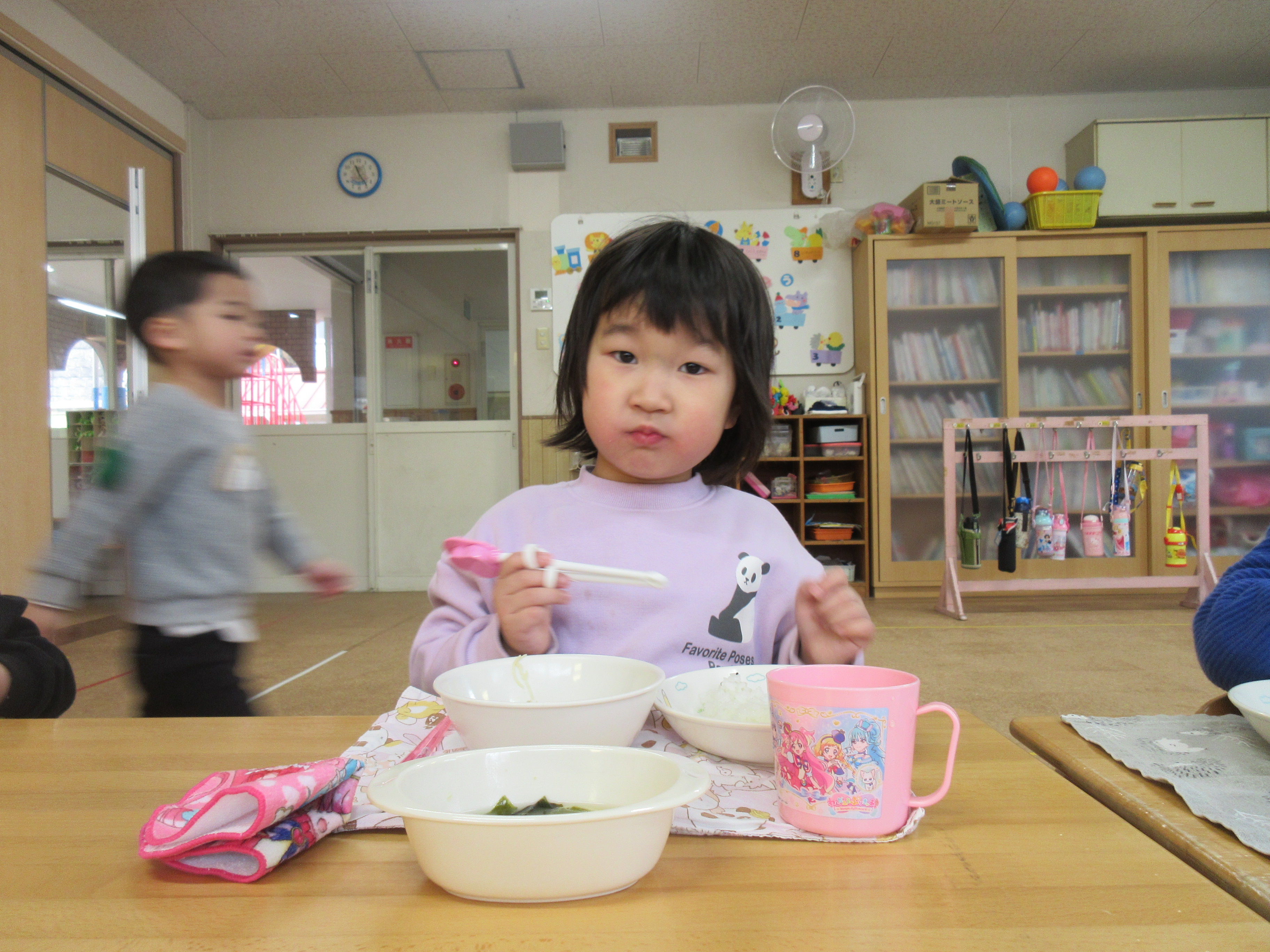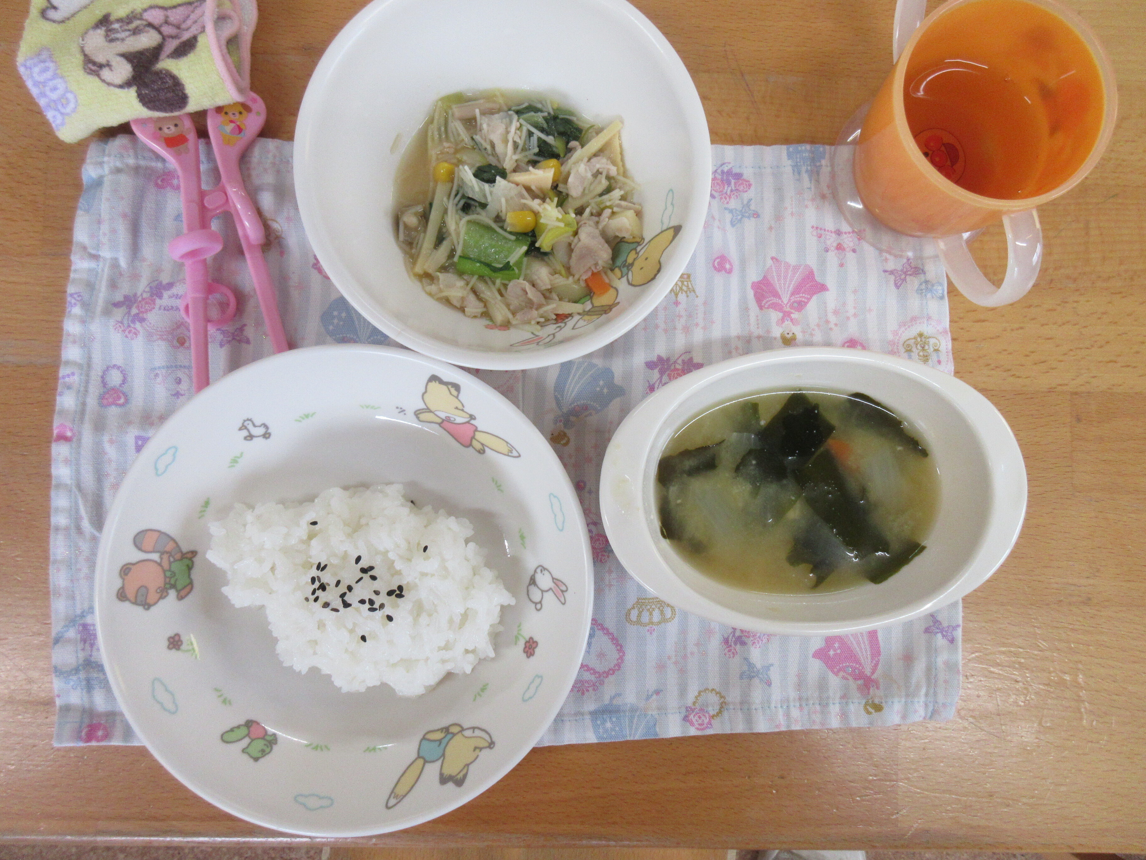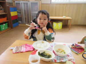 今日の給食です♪お野菜もモリモリ食べてお代わりに行く子どもたちでした!美味しかったね♡