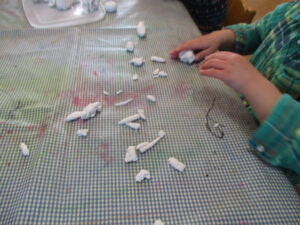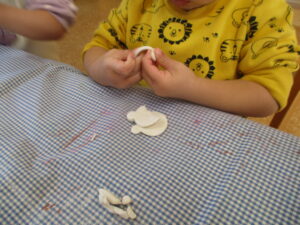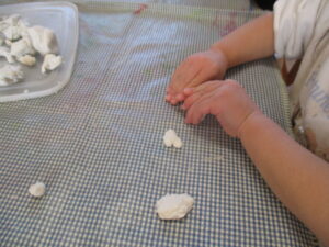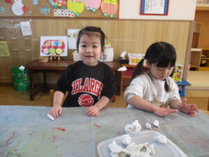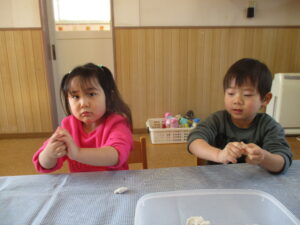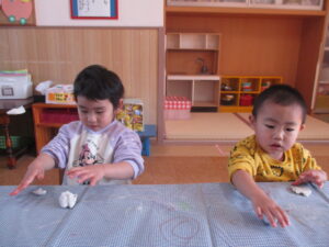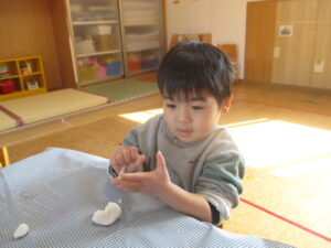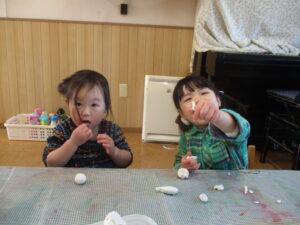 粘土をこねて丸やちぎってみたり、細く伸ばしてみたりしました。子どもたちは小さな丸を作っている子が多かったです。またできた粘土をお友達に「どうぞ!」とあげているなどして交換も楽しんでいました。