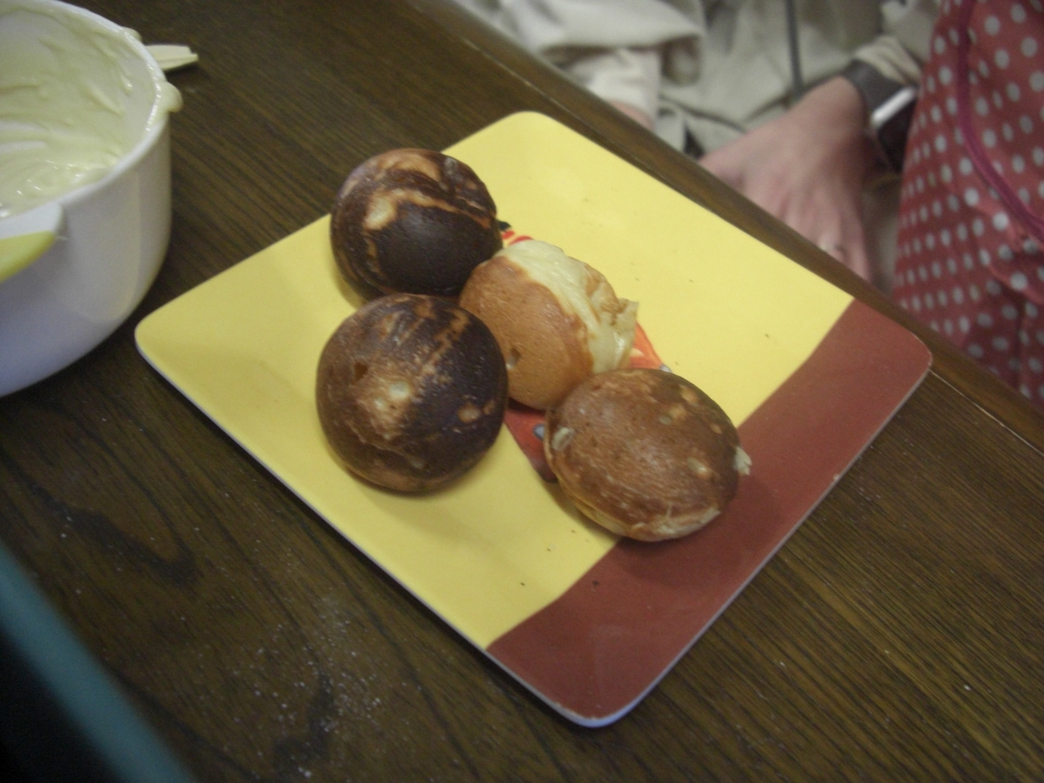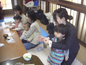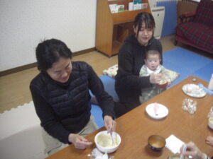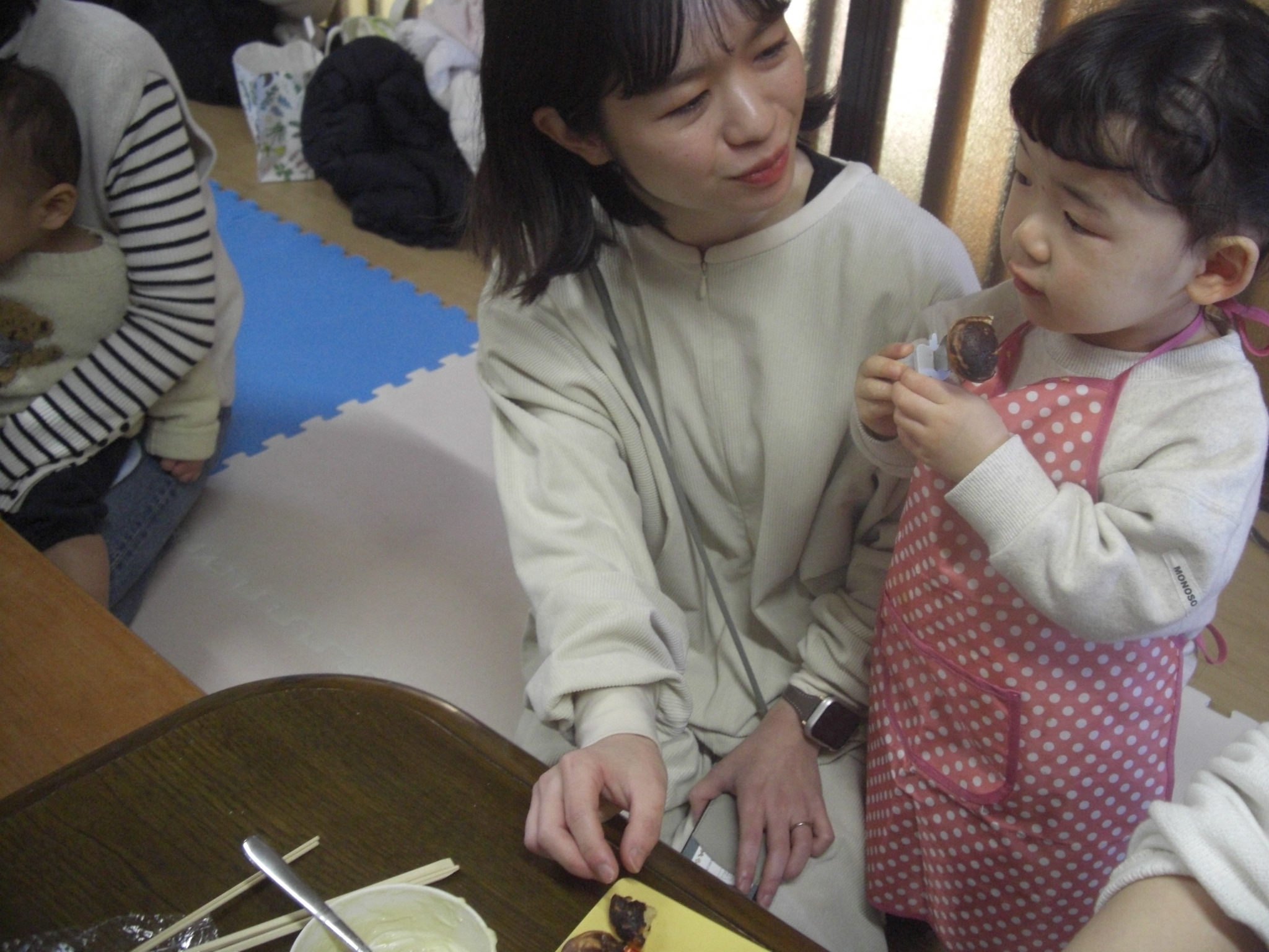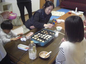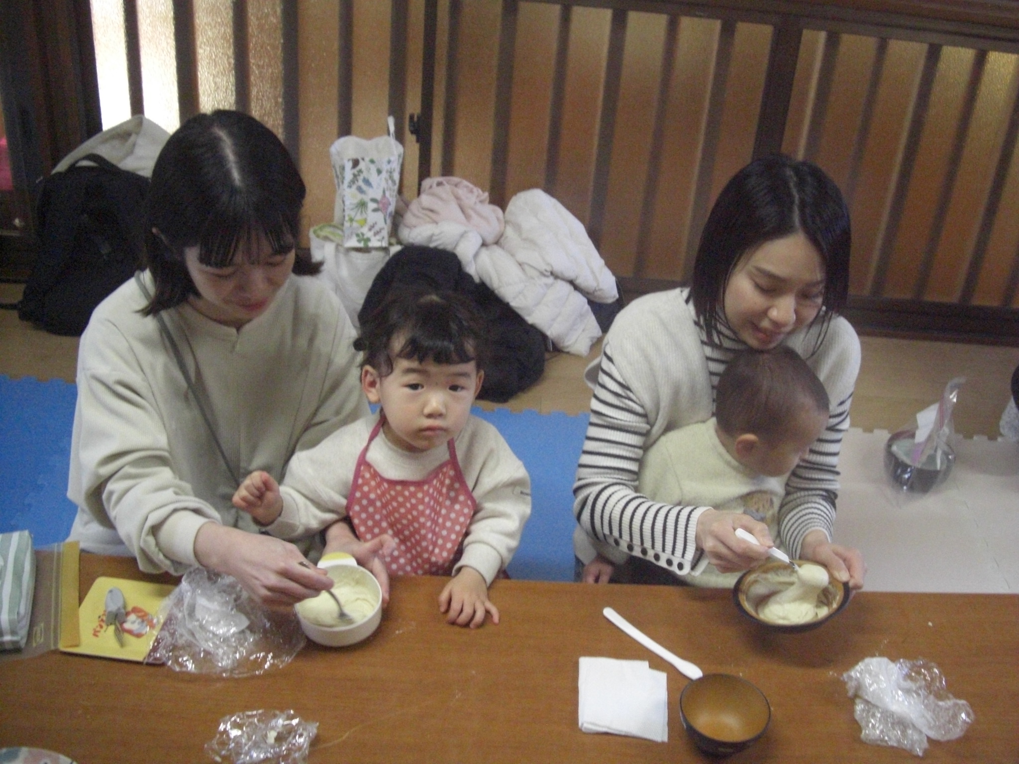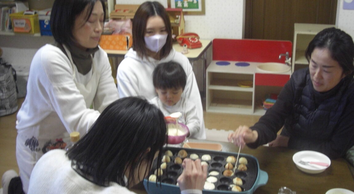 今日は、バレンタインにちなんで、スイーツを作りました♡ホットケーキミックス&絹豆腐&リンゴ味の豆乳&きび砂糖を、まぜまぜ♡可愛いエプロン姿で、小さなパティシエたちが、上手にまぜまぜしてくれました♡生地ができたら、たこ焼き器で、ママたちが、とっても上手に焼いてくれて♡お豆腐ベビーカステラの完成♡おいし~♡と、みんなとってもいい表情で、美味しそうに完食♡ママたちも、美味しいね♡お豆腐だからヘルシー♡また家でします~♡と嬉しい感想がいっぱいでした♡