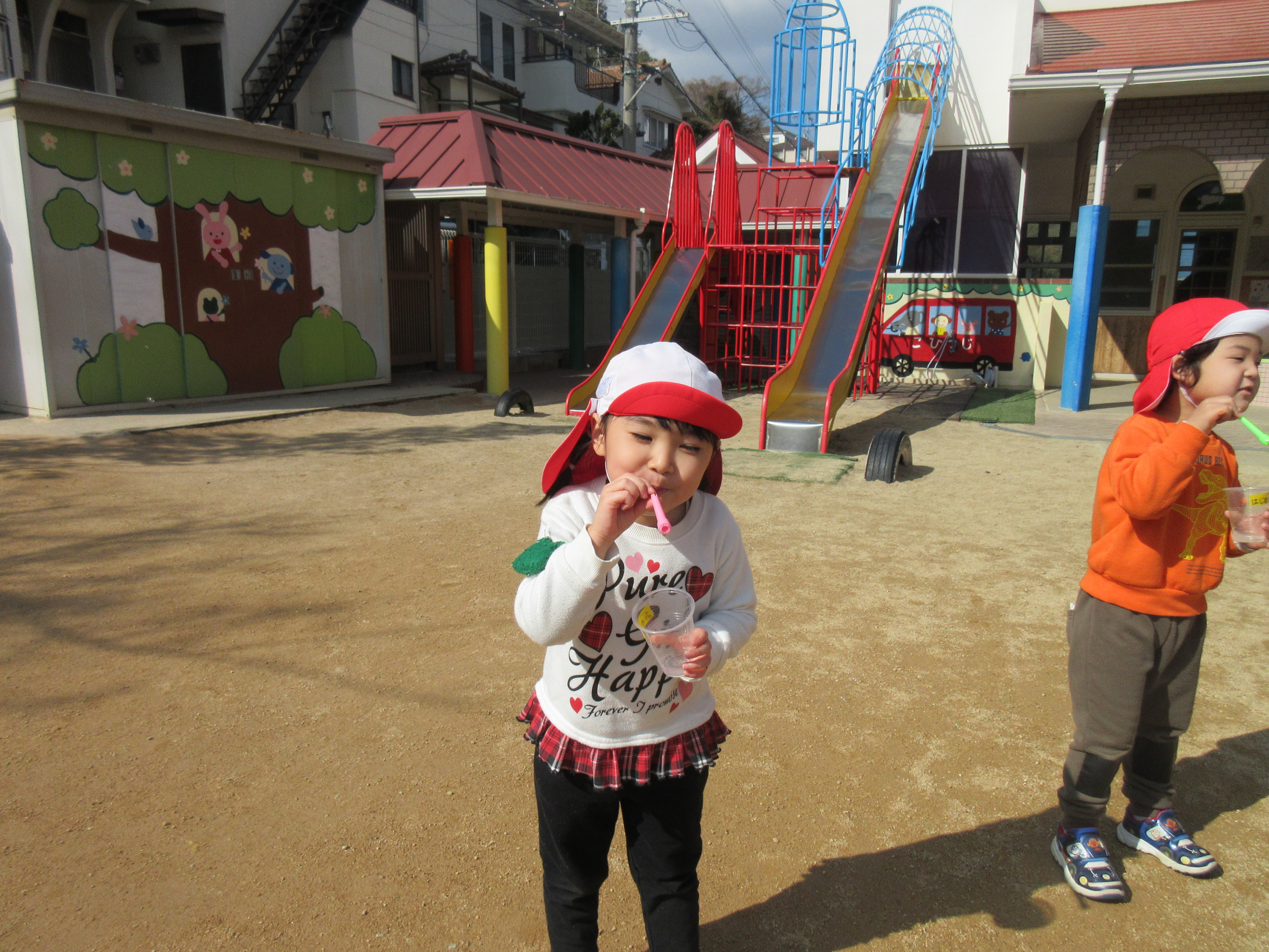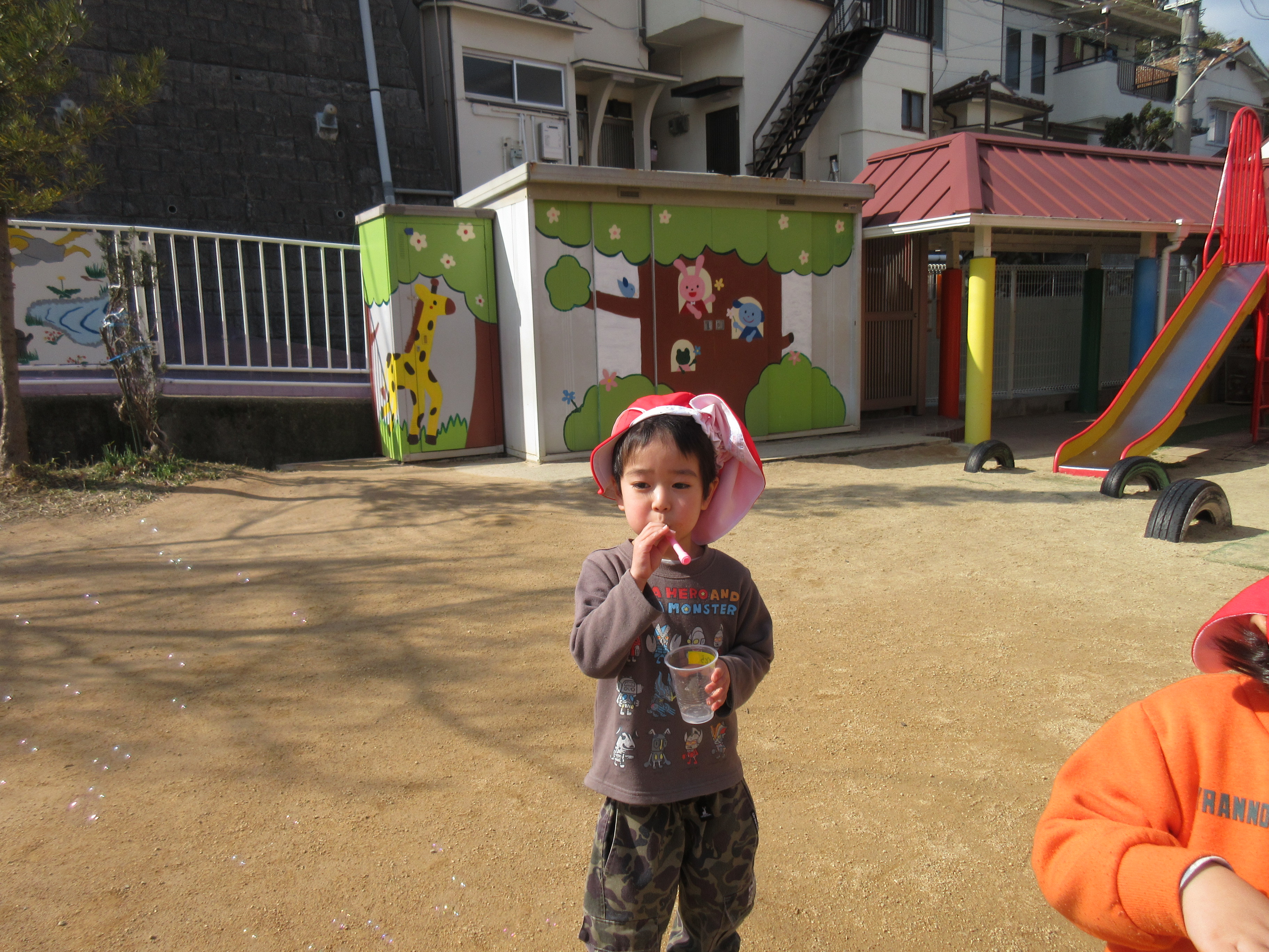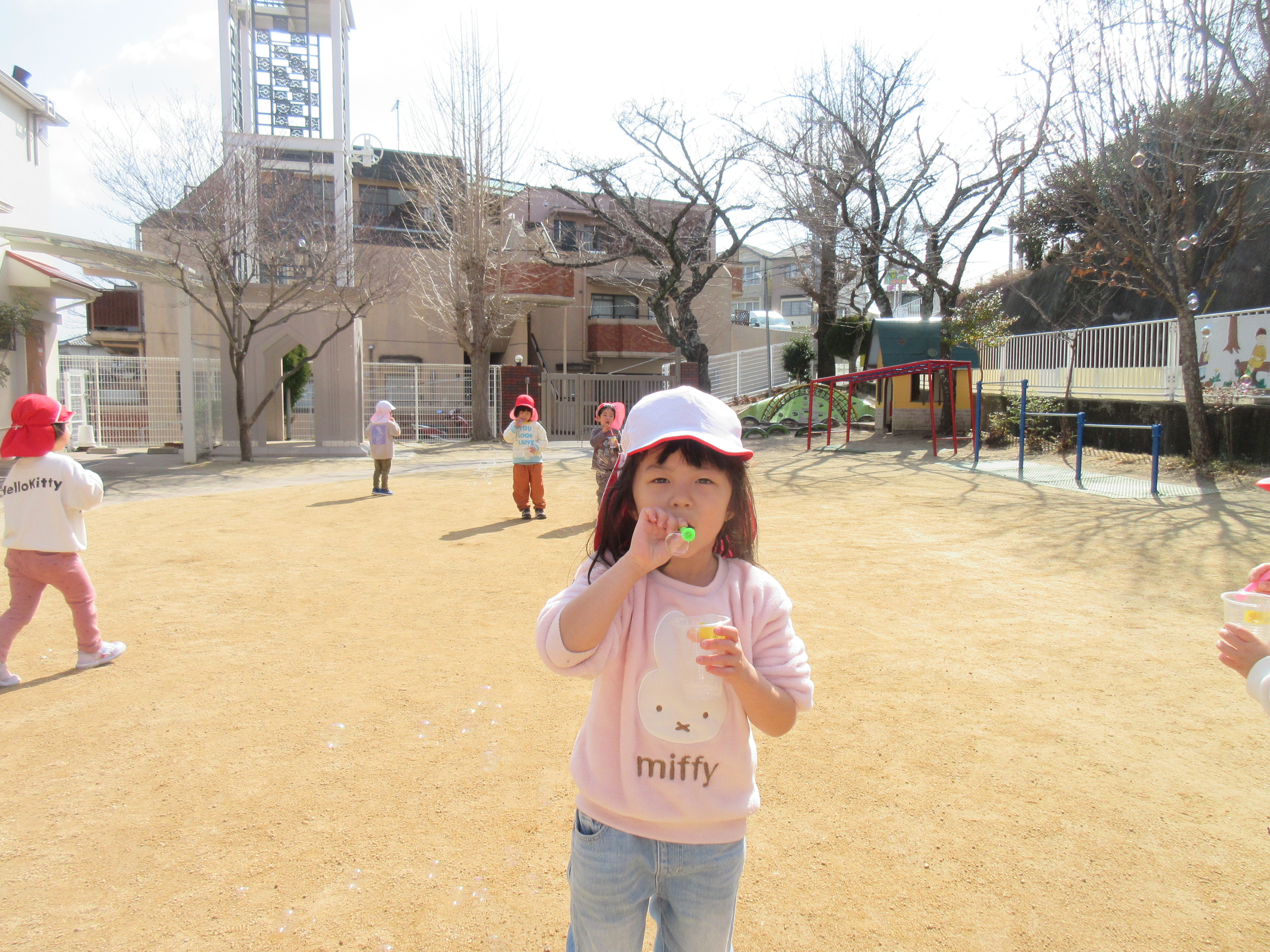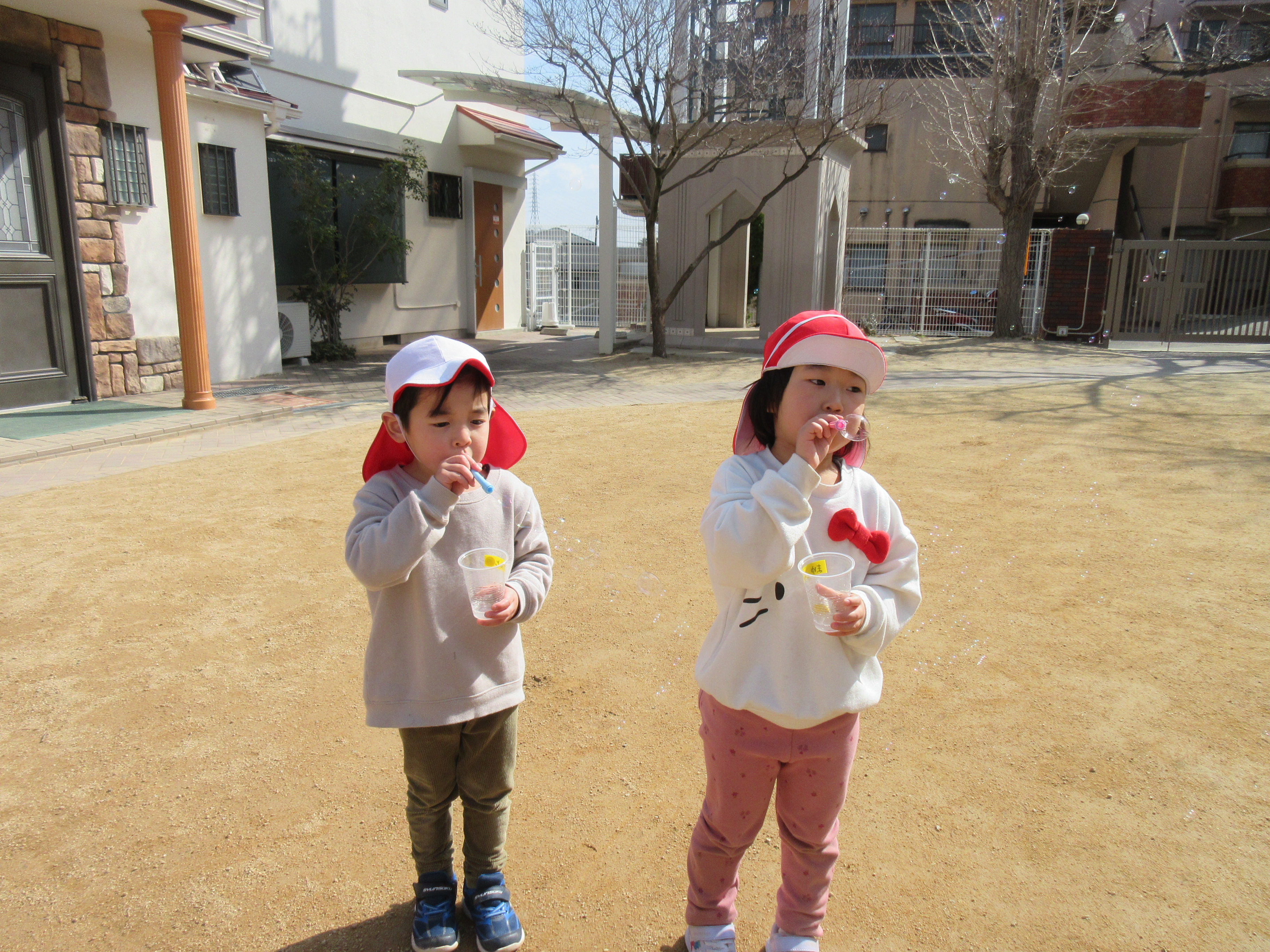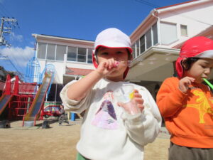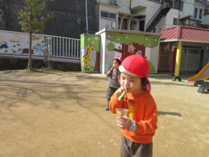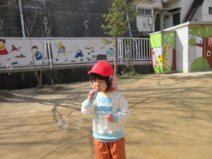 昨日は子どもたちのリクエストでシャボン玉をして遊びました♪お天気も良く暖かかったので青空に綺麗なシャボン玉が見えました(^^)/シャボン玉を追いかけたり、大きなシャボン玉を作ろうと頑張っていたり様々な様子で楽しむ子どもたちでした🌼