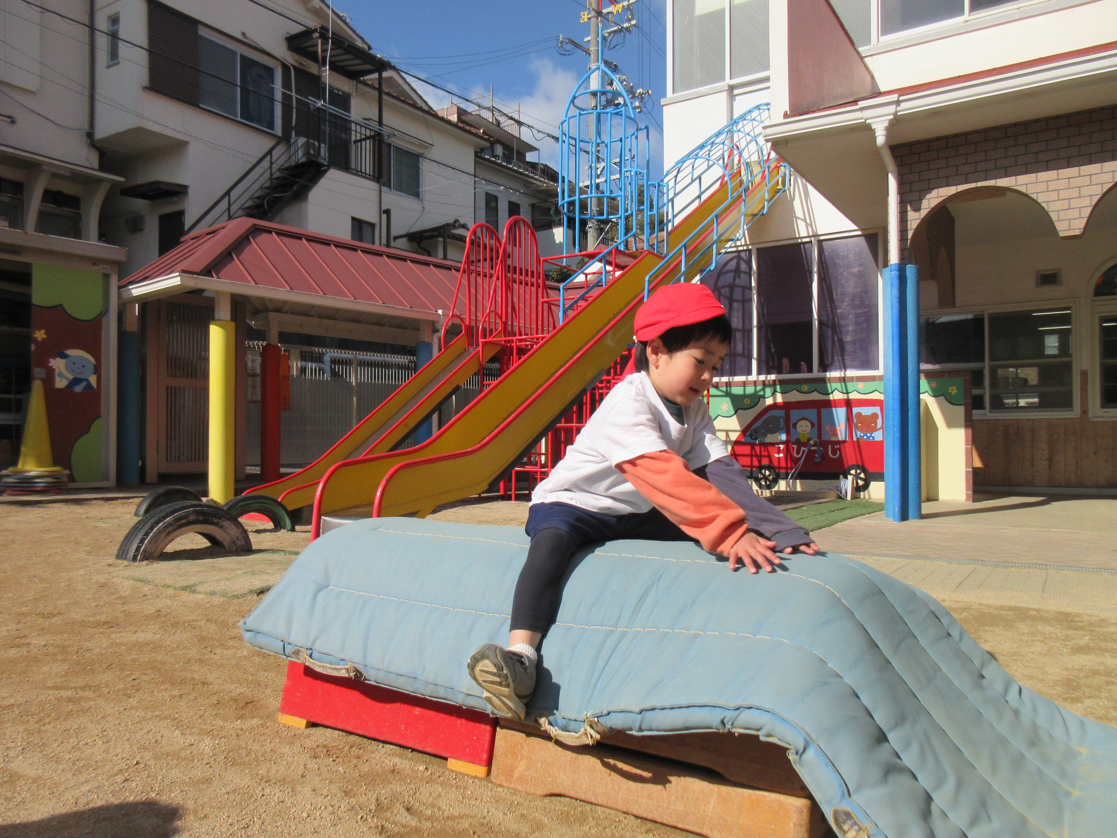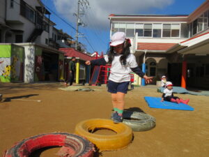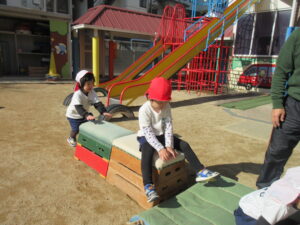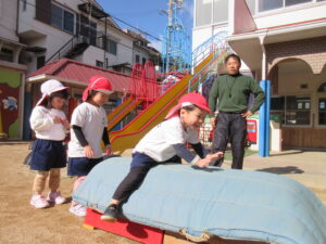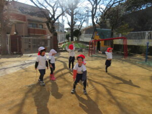 今日は雪が少し積もっていて朝から、「お家の車にも積もったよー」「雪触ったよ」と嬉しそうな子どもたちでした❄⛄寒さに負けず元気にお外で体育あそびをしました(^^♪