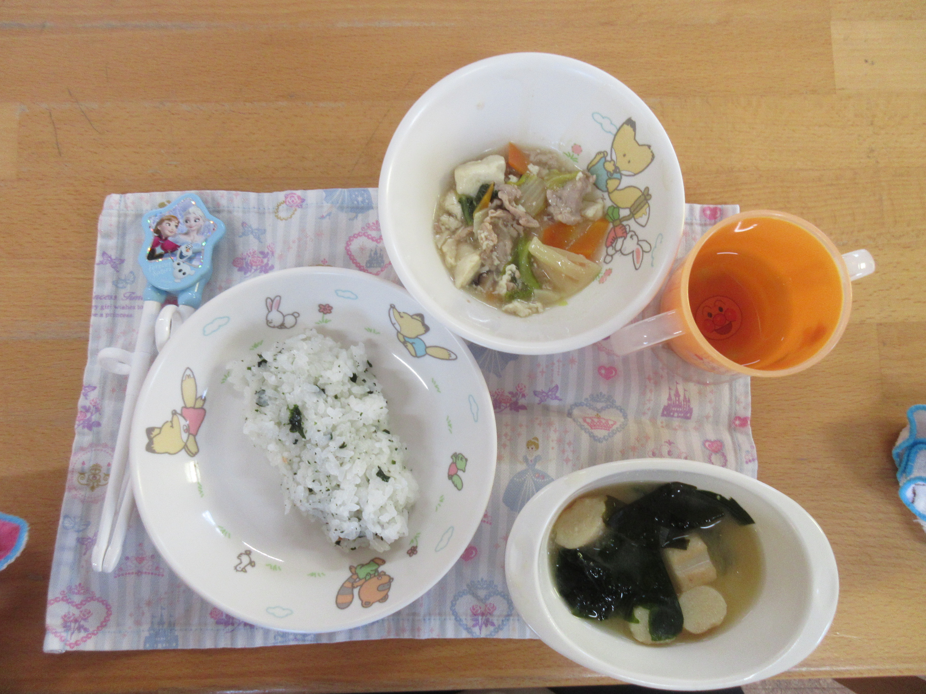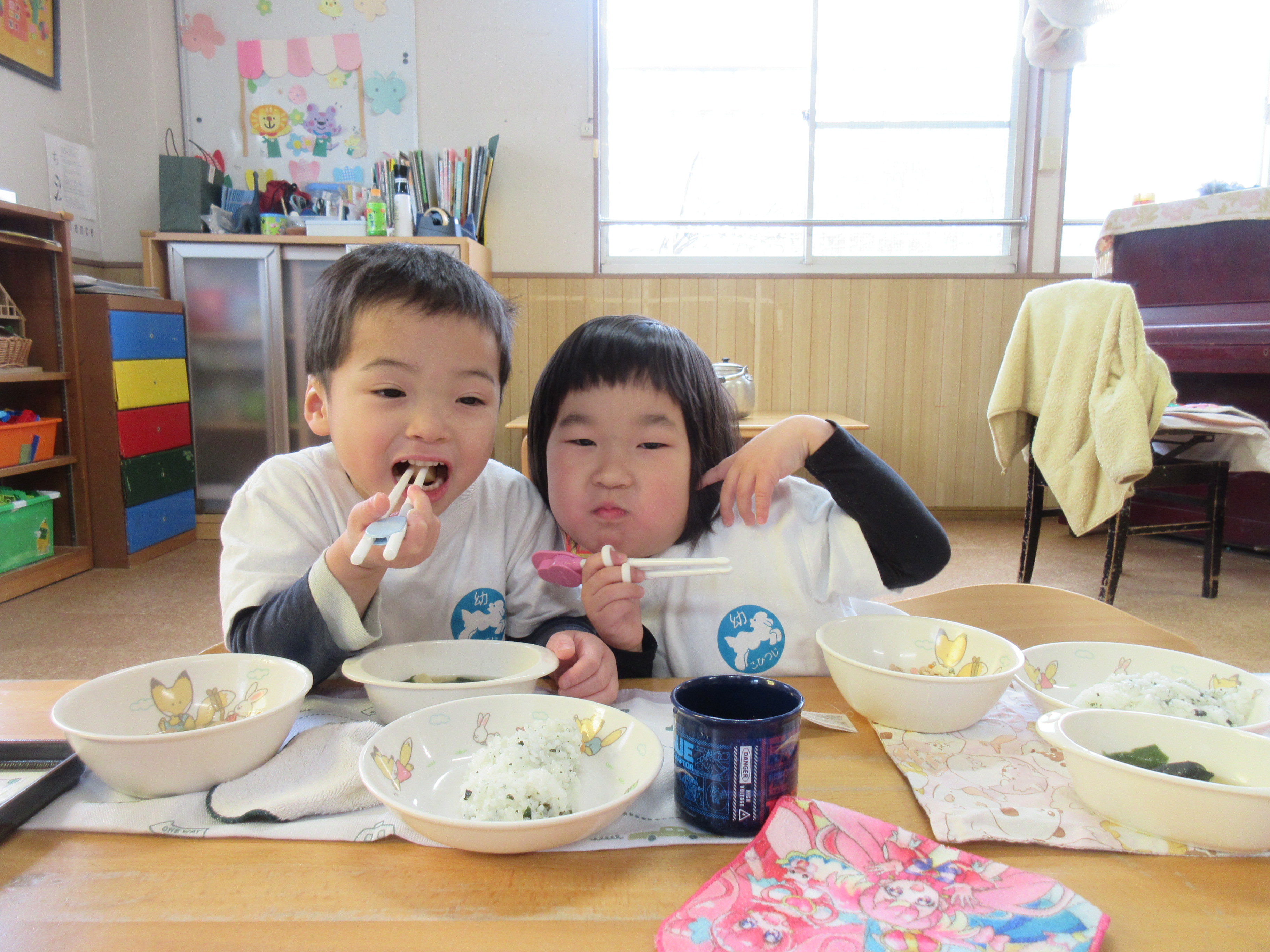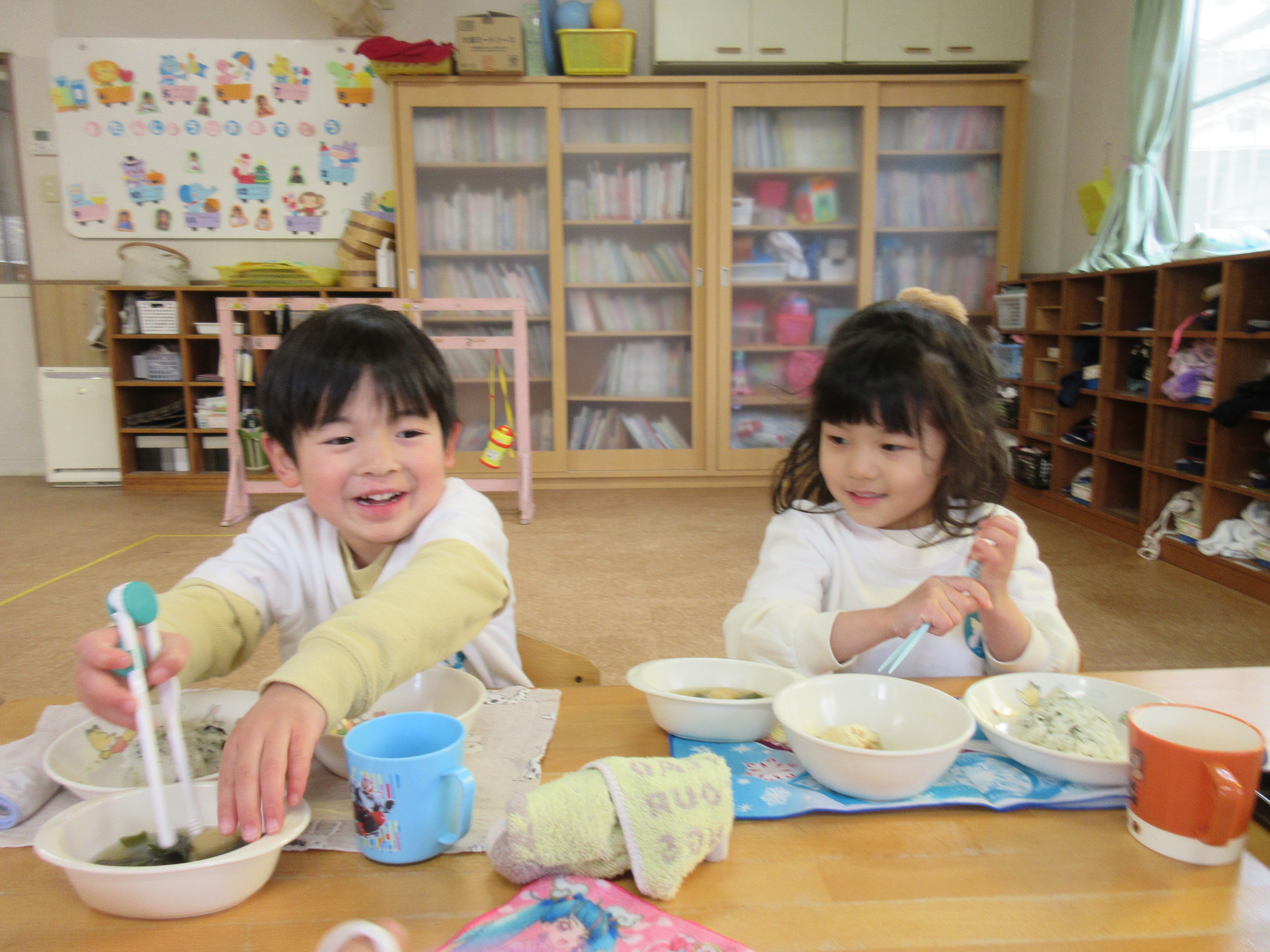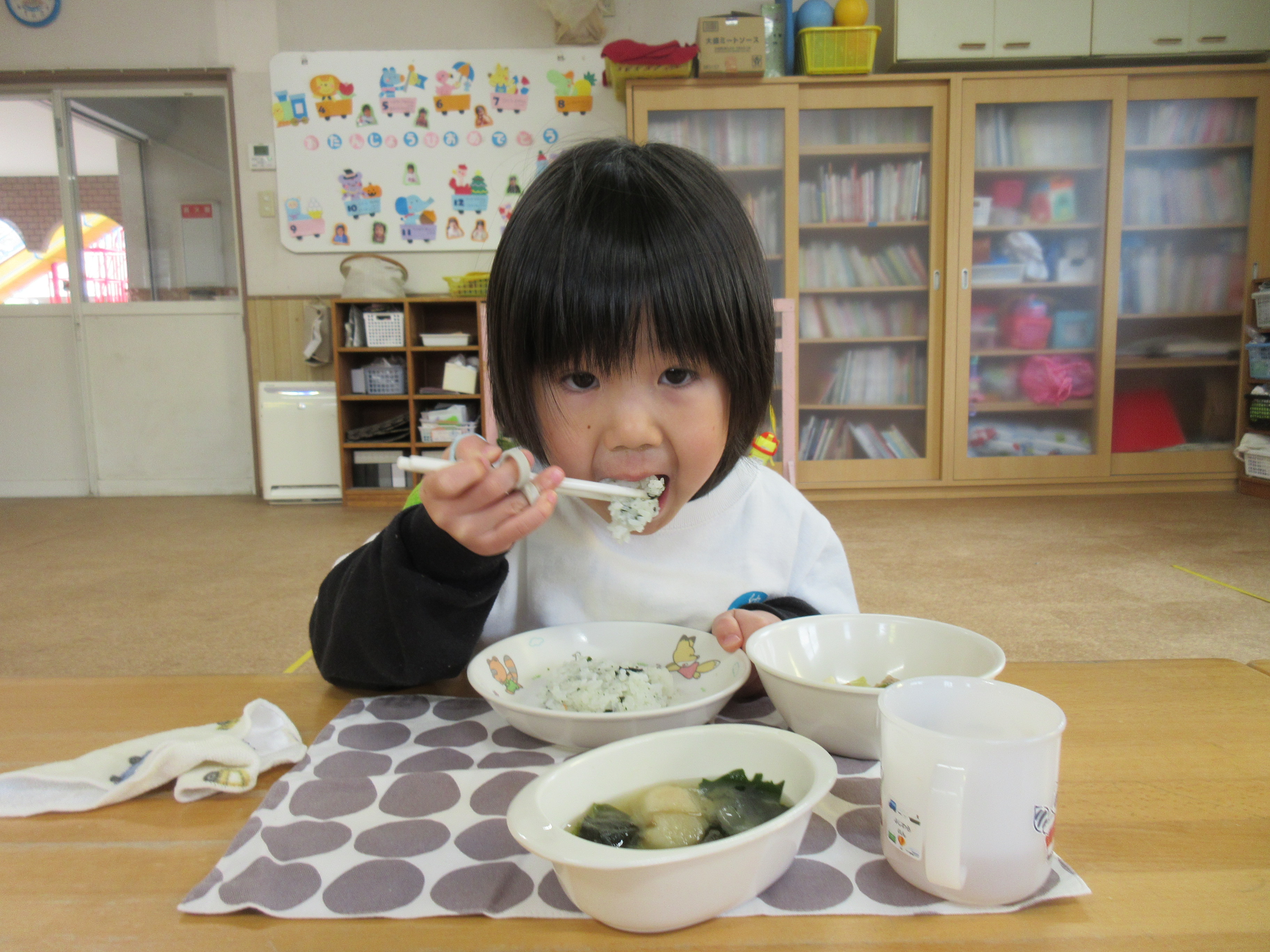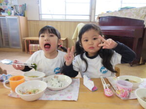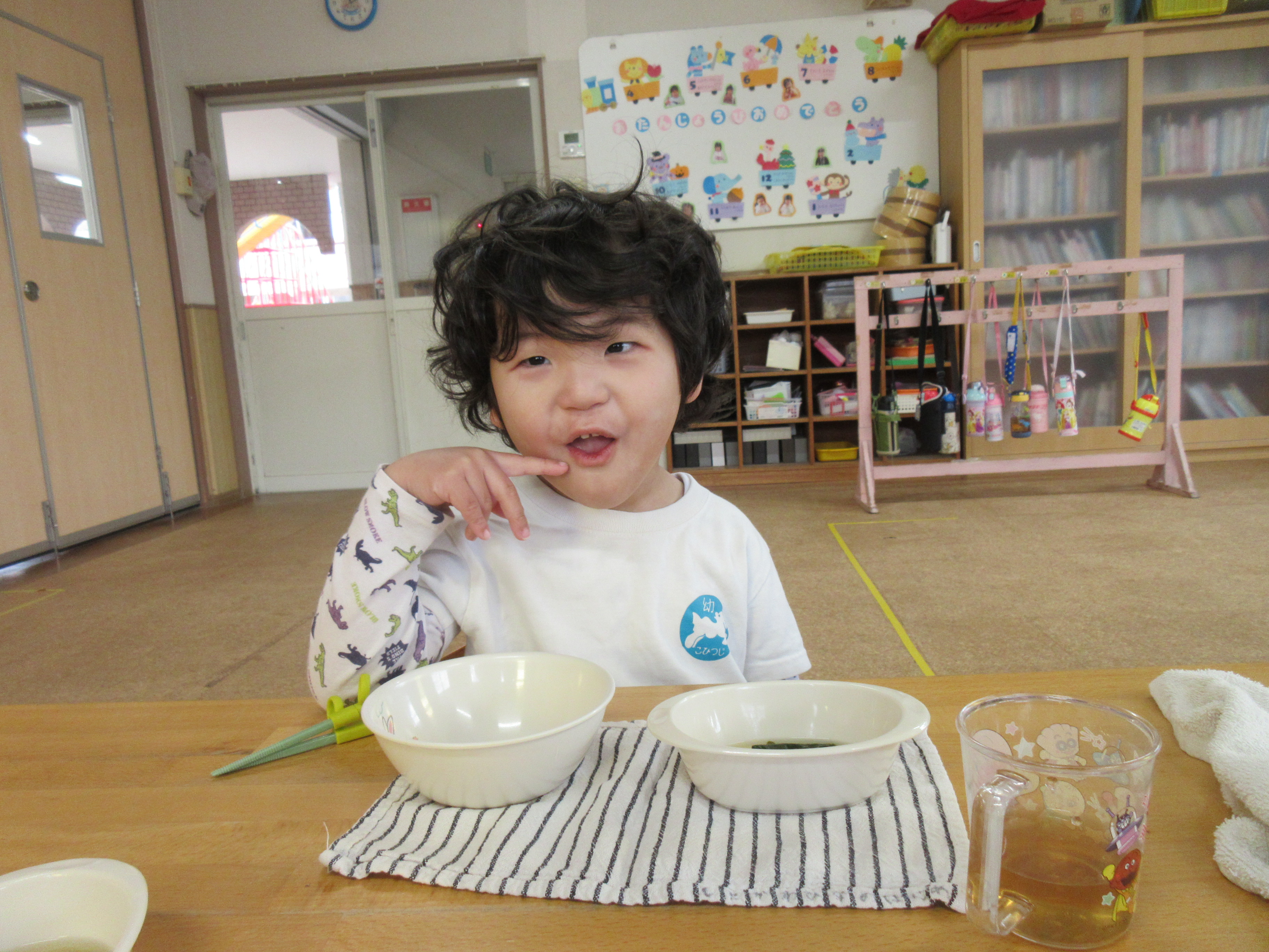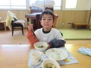 給食は温かいお味噌汁に「あったかいね~♡」ほっこりする子どもたちでした♡美味しかったね!