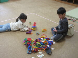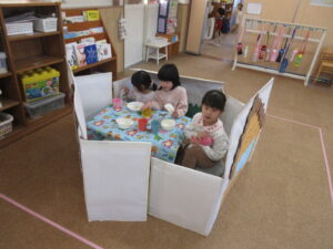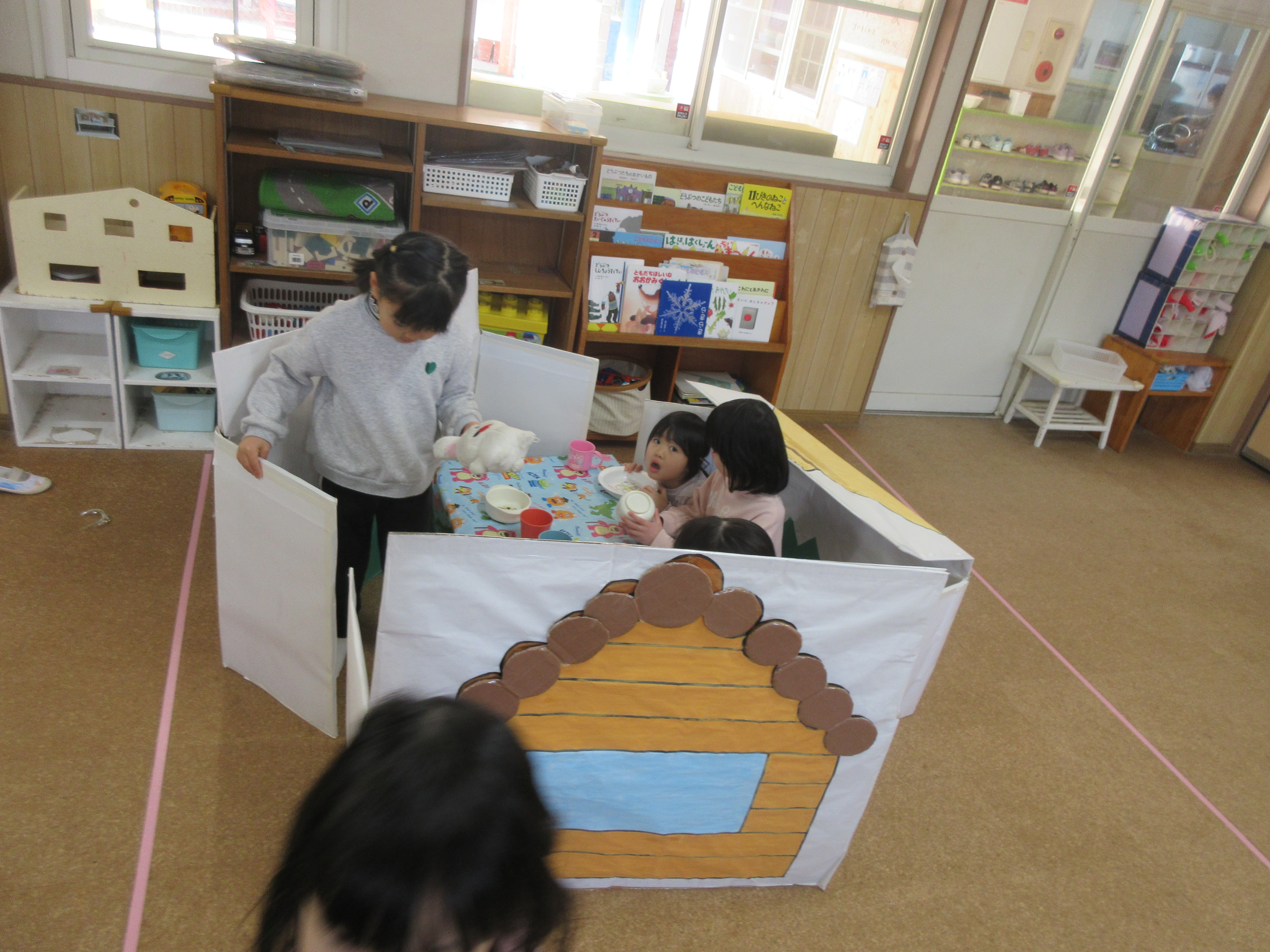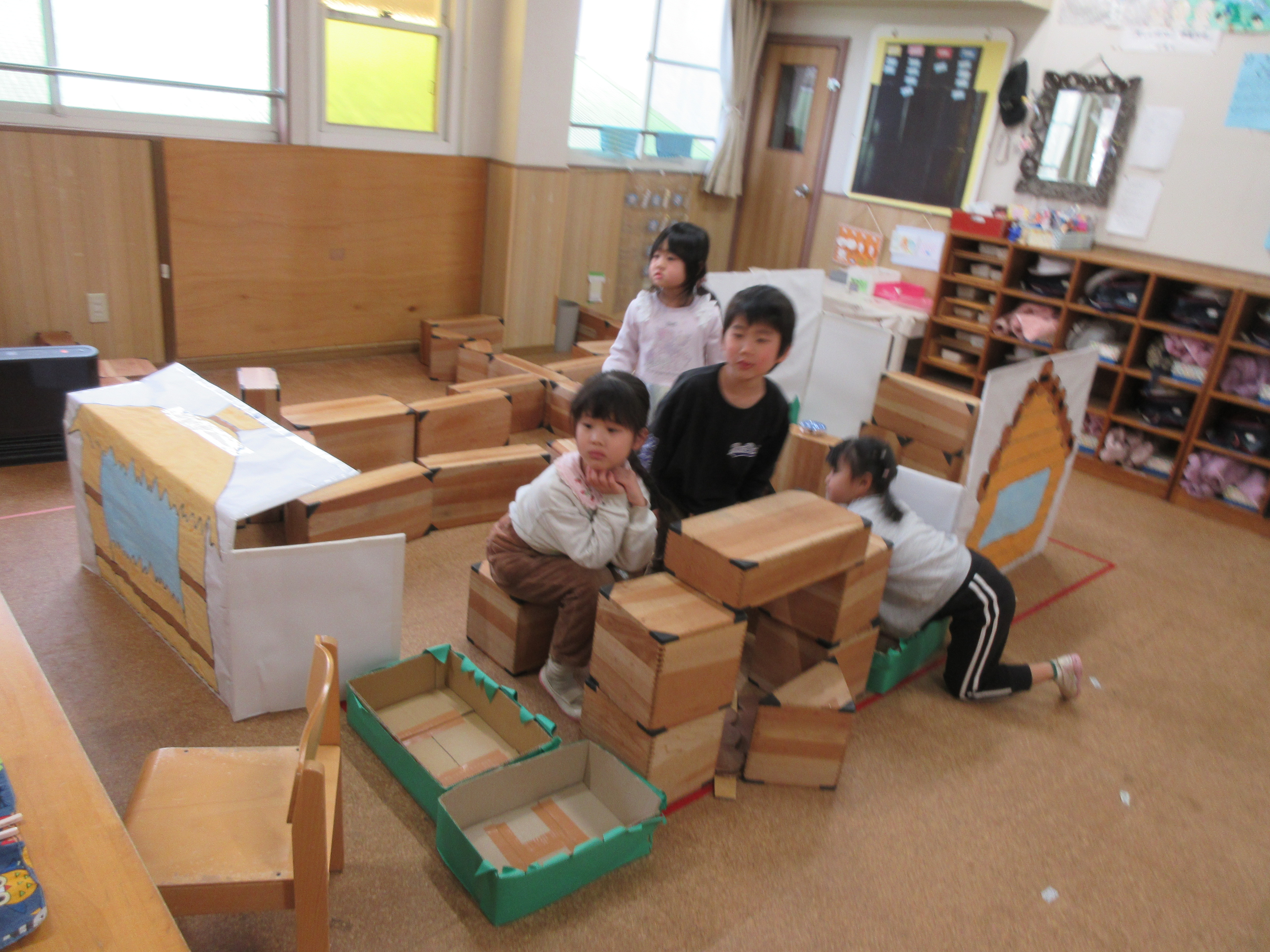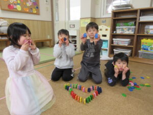 最近は劇で使った3匹の子ぶたの家を使ってごっこ遊びをしたり、ドミノをみんなで並べてみたりと、5~6人やクラス全員で仲良く遊んでいるすみれさん!