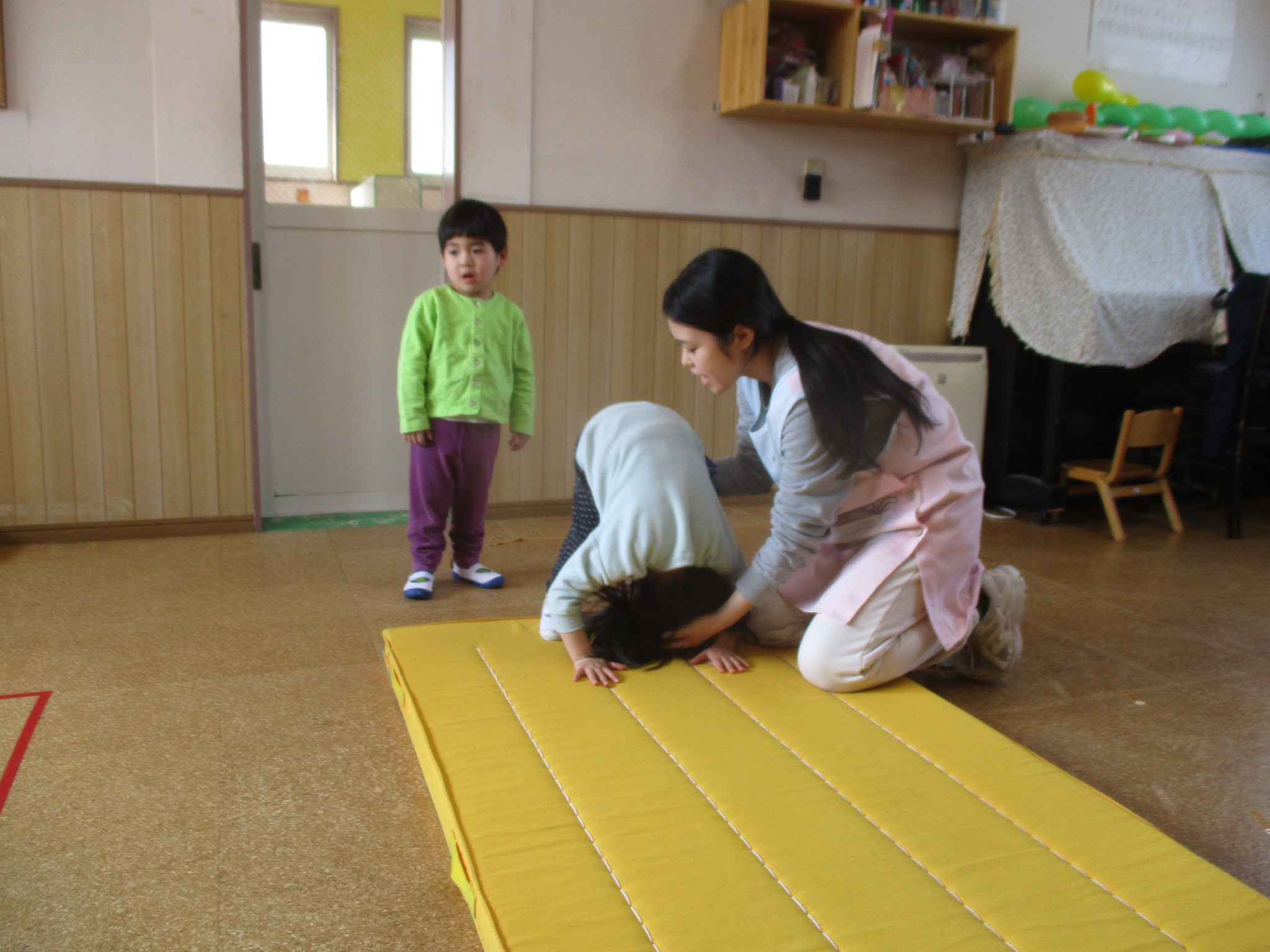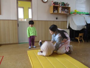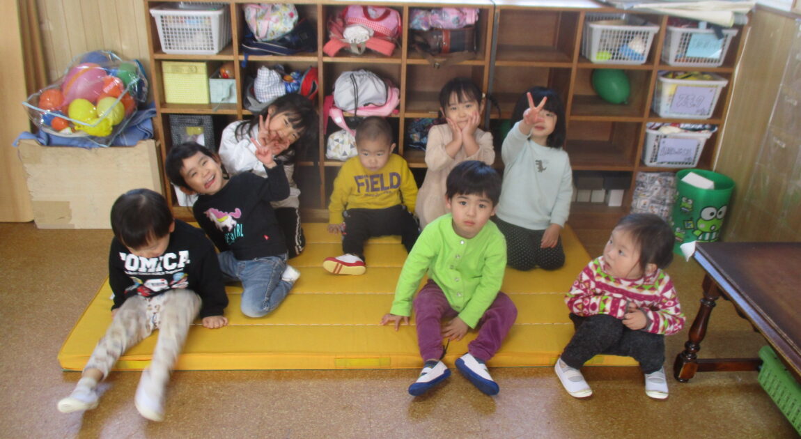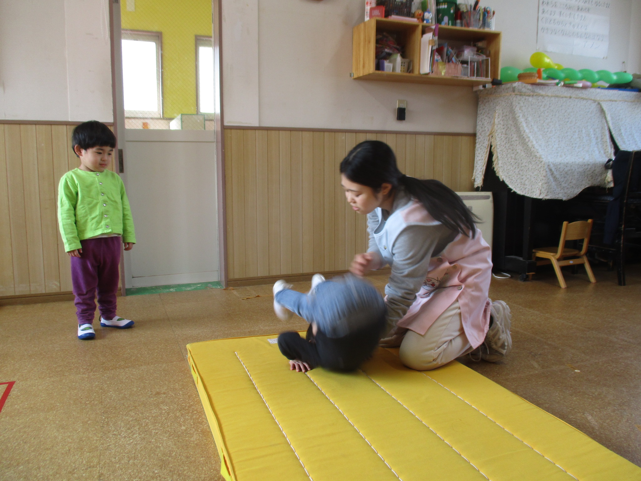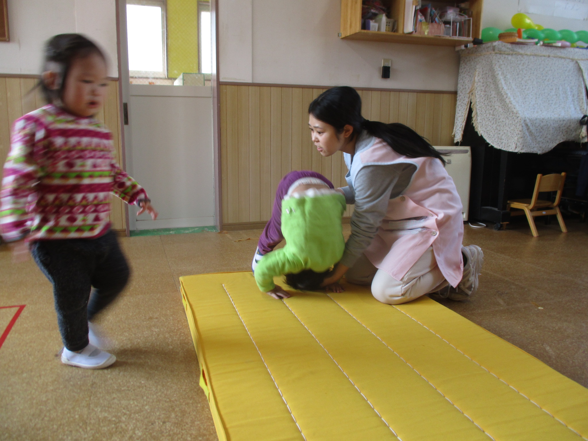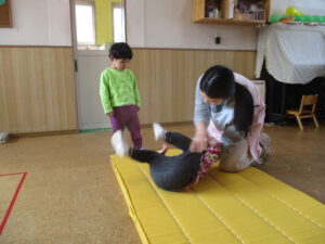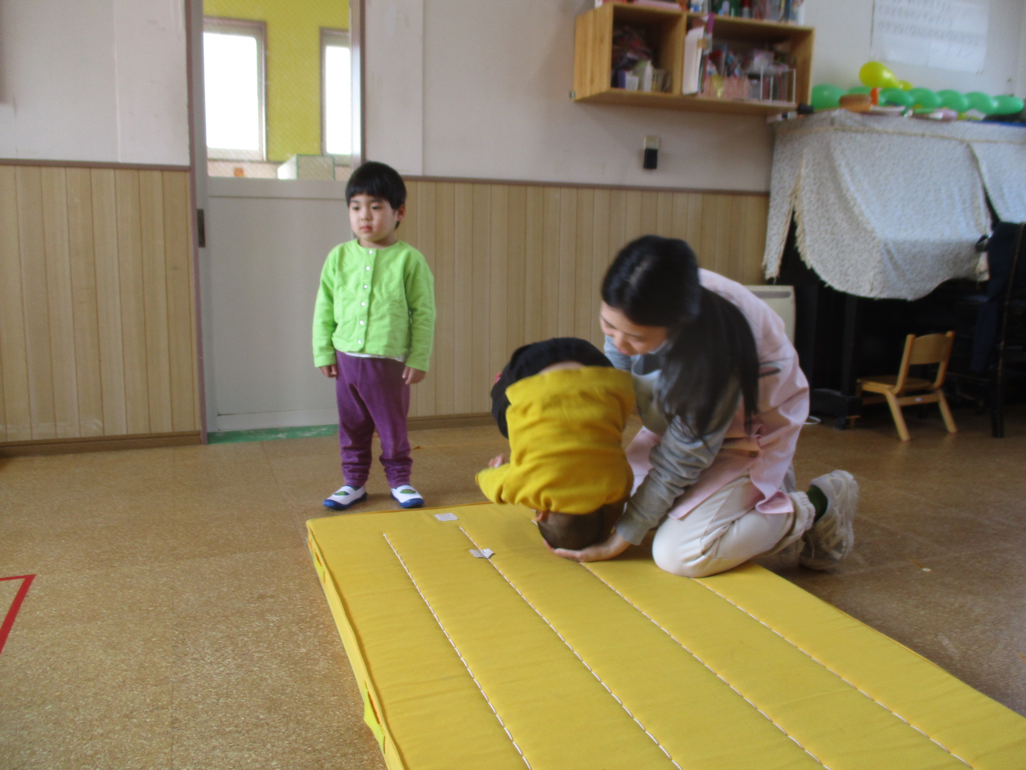 お部屋でマット遊びをしました。体育あそびでもしたお引越しやでんぐり返しをしてみました!でんぐり返しでは周り終わるとみんな笑っていました😊新鮮だったみたいで「もう一回!!」と楽しんでくれました。