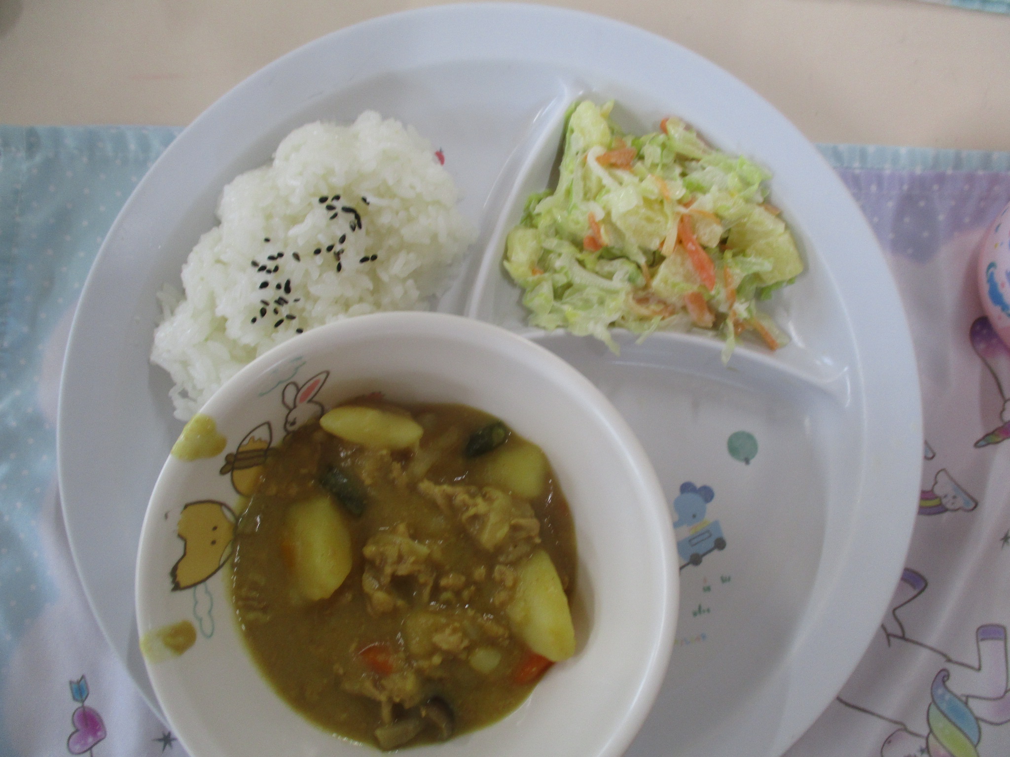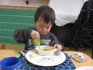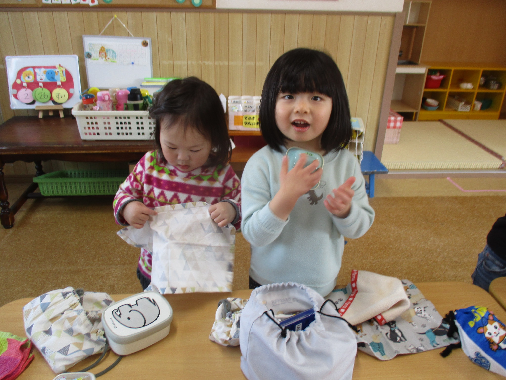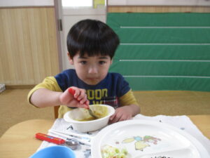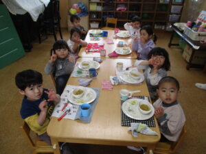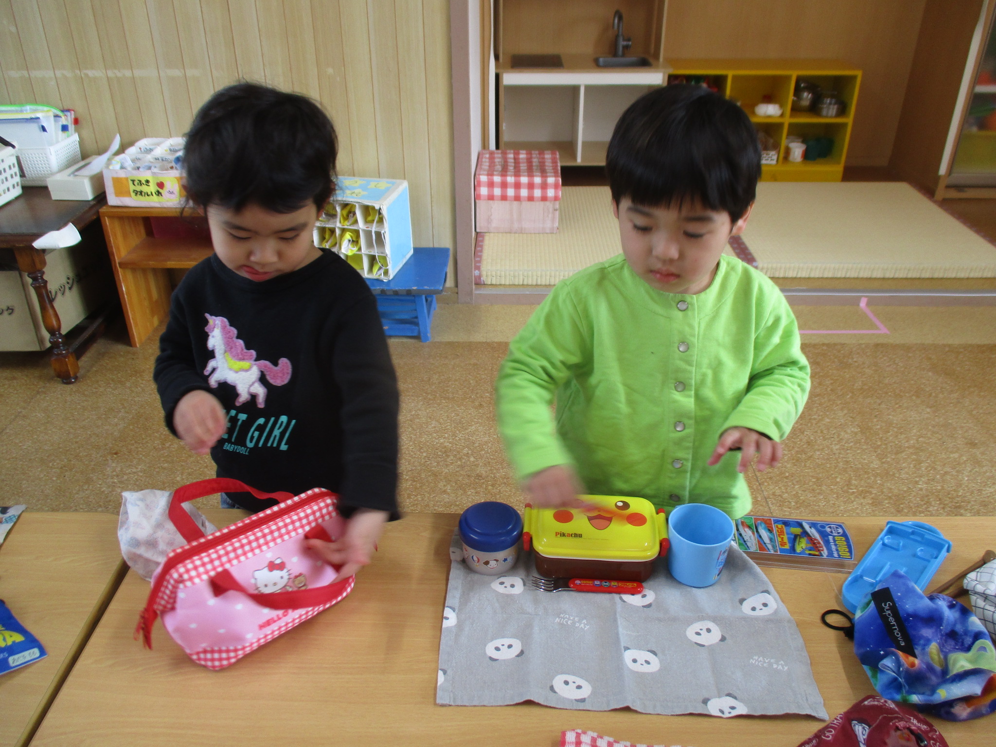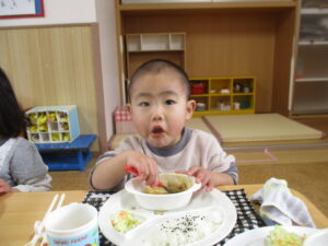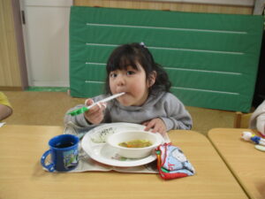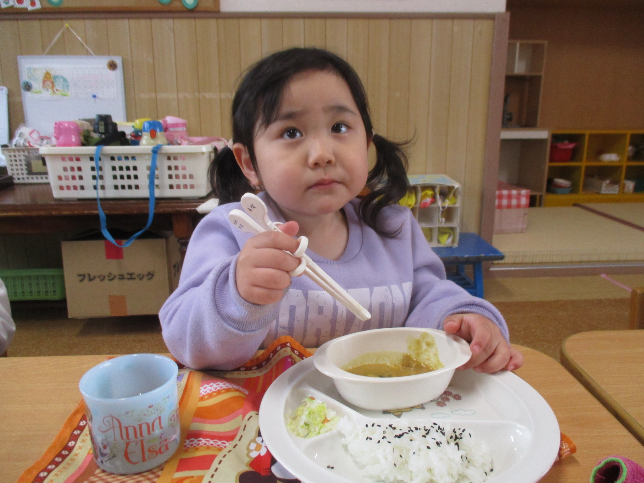 ご飯のご用意を1人でできるように練習しています!ランチョンマットをはじめに出し右にお箸とコップを置いて最後のイスまでできた子は「できたよ!」と報告してくれる姿は微笑ましかったです💕給食もたくさん食べれました!!