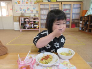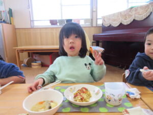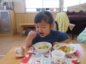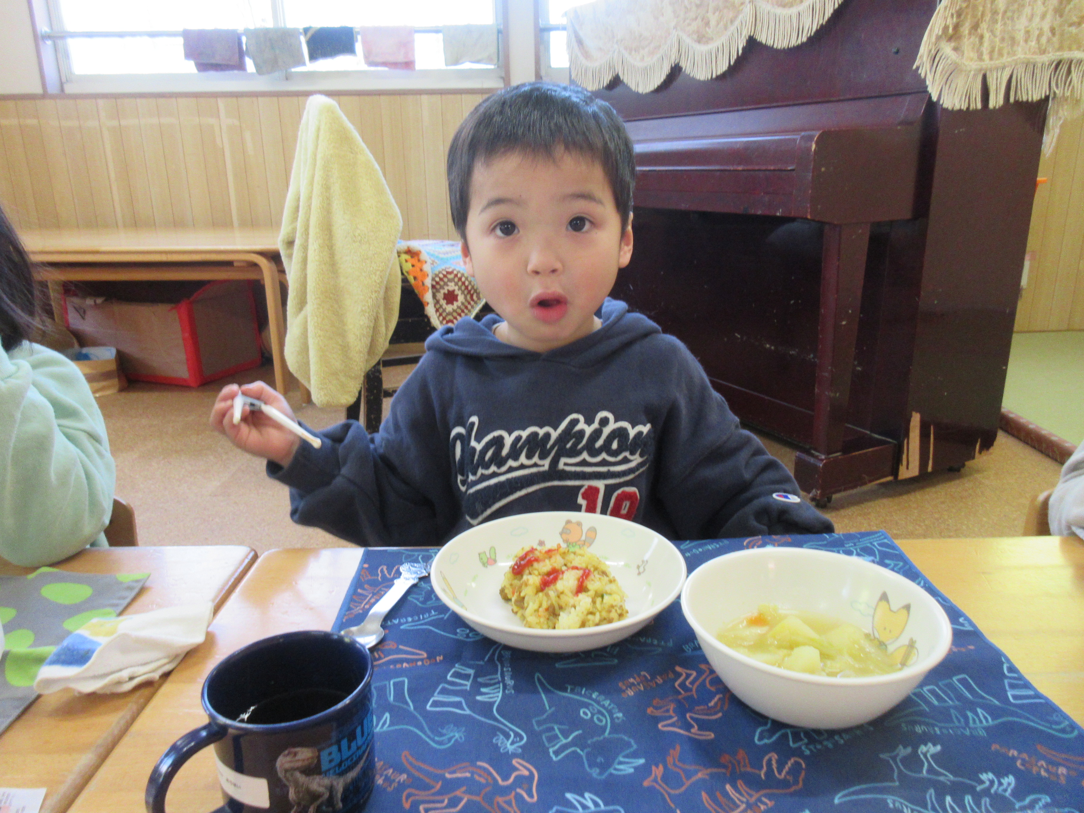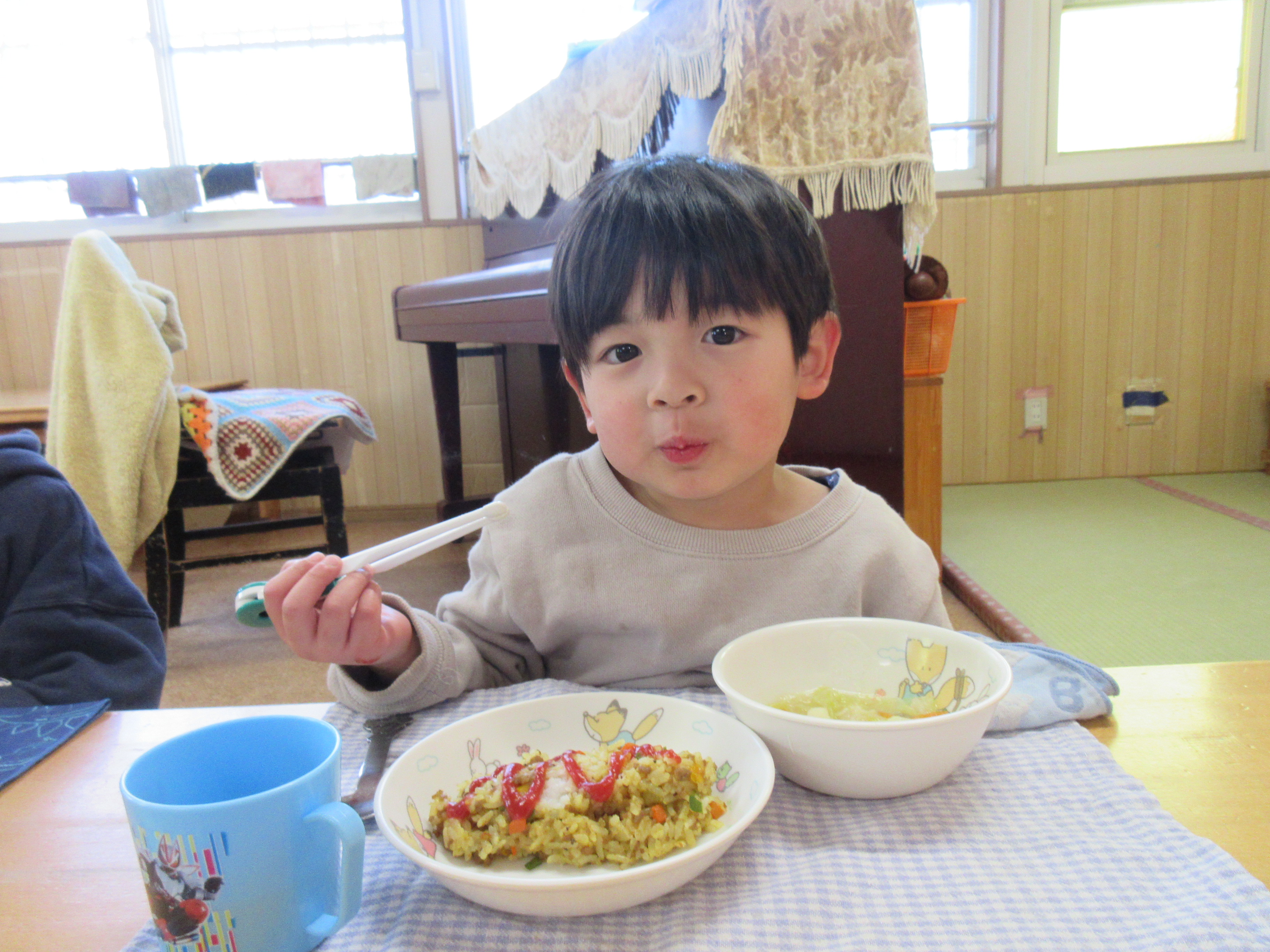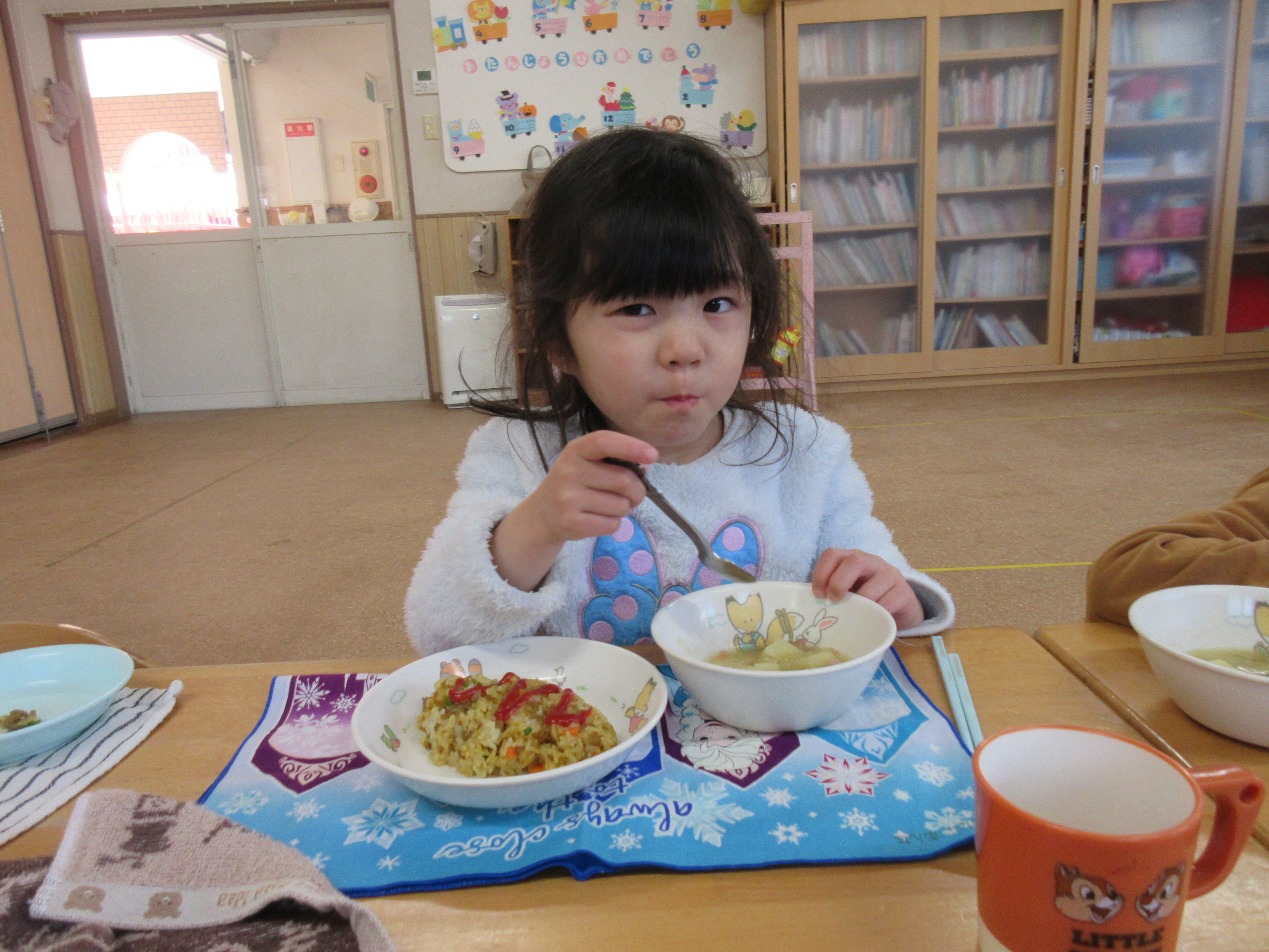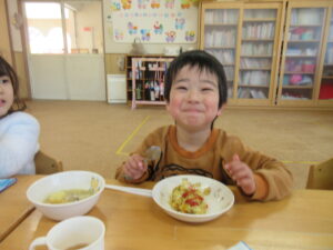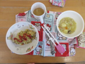 今日の給食は、カレーピラフと、野菜スープでした!美味しかったね♡
