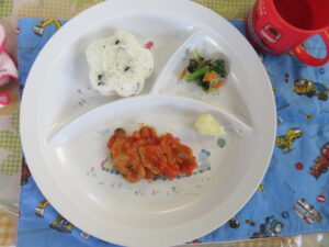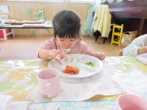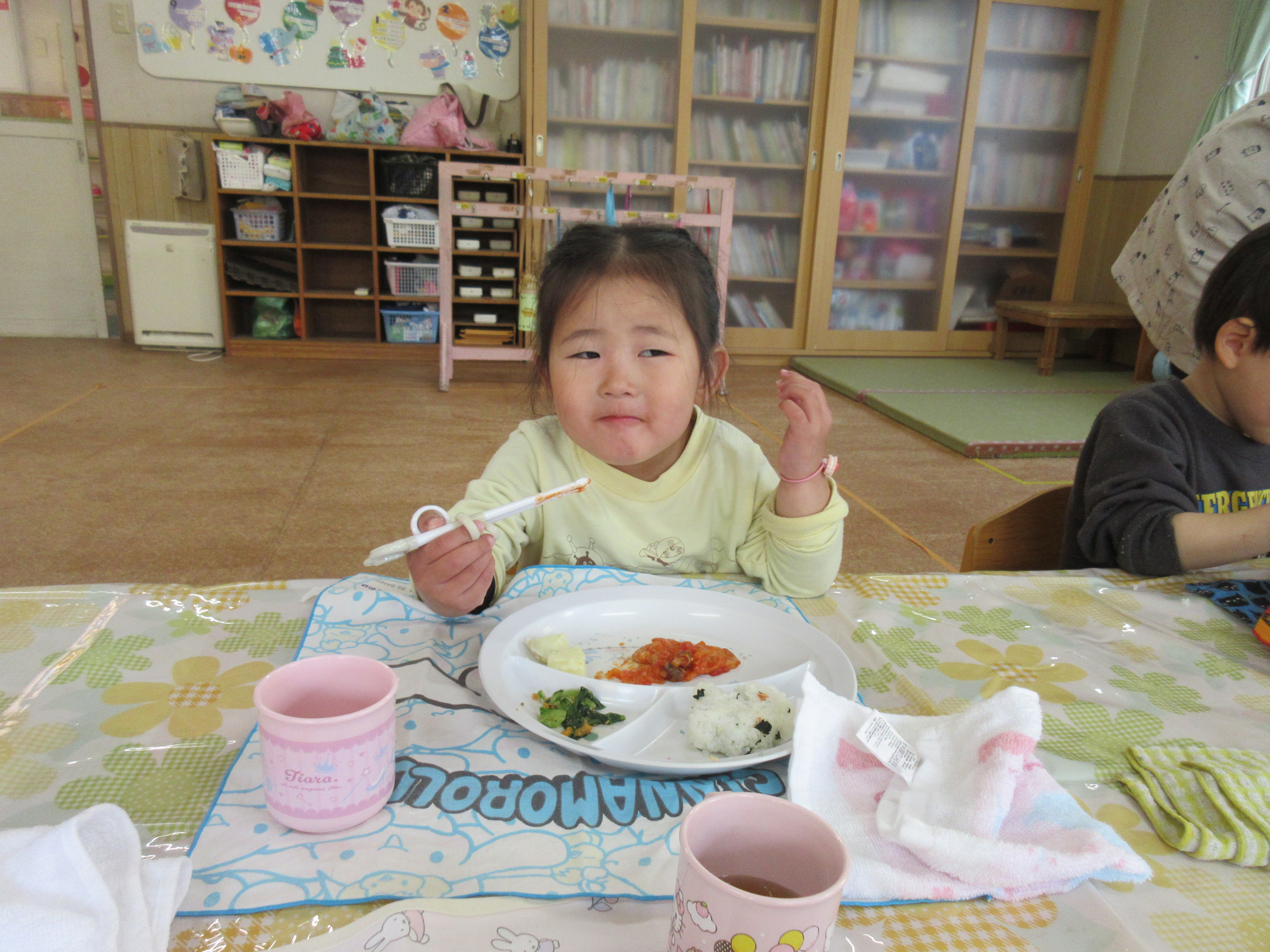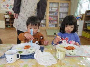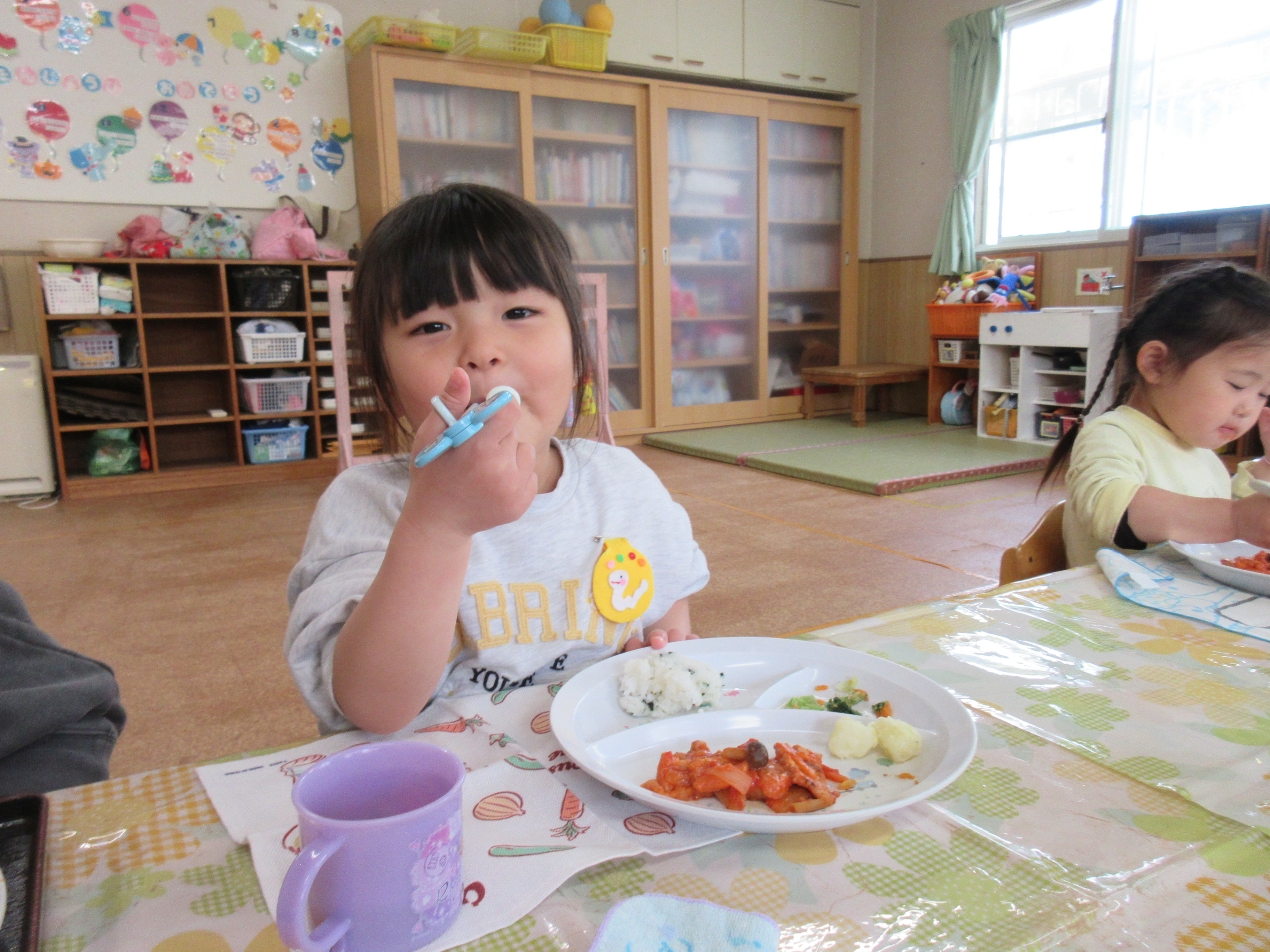 今日の給食です!たんぽぽ組になりお箸の練習も頑張っており、苦戦しながらも一生懸命頑張る子どもたちです♡