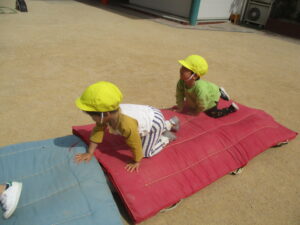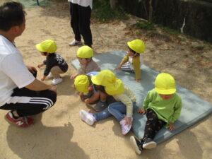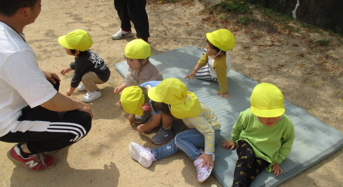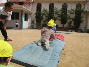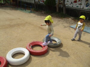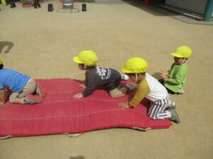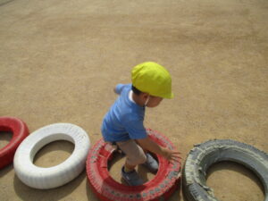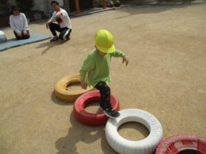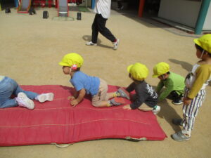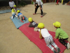 今日は、お外で体育あそびをしました!笛の合図で、別のマットに移動したり、タイヤに登ったり、マットの上をお馬さんで移動するなどみんな上手にできていました✨