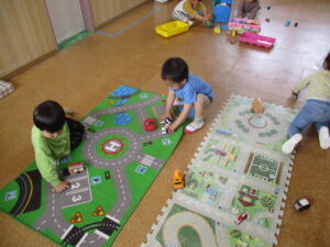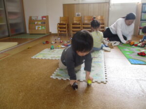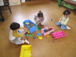 体育あそびの後はお部屋に戻り、水分補給をしっかりして、4月で3歳になったお友だちの誕生日会をしました(^^♪ 「何歳になったの?」「なんの食べ物が好き?」などとたくさん質問をしたり、お誕生日のお歌を歌ったり、みんなでお祝いしました🎉お部屋では、車のおもちゃやブロックなどでたくさん遊びました。だんだんお友だちとの会話も増え、お互いに名前を呼び合ったりとたくさんお話をしている姿がよく見られます😊
