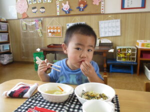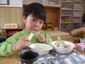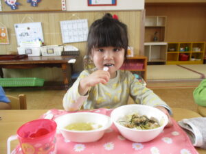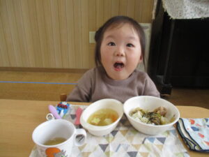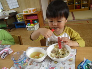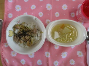 今日の給食は、焼き鳥ご飯とみそ汁でした。みんなで「美味しいね」と言い合いながら楽しく食べています!