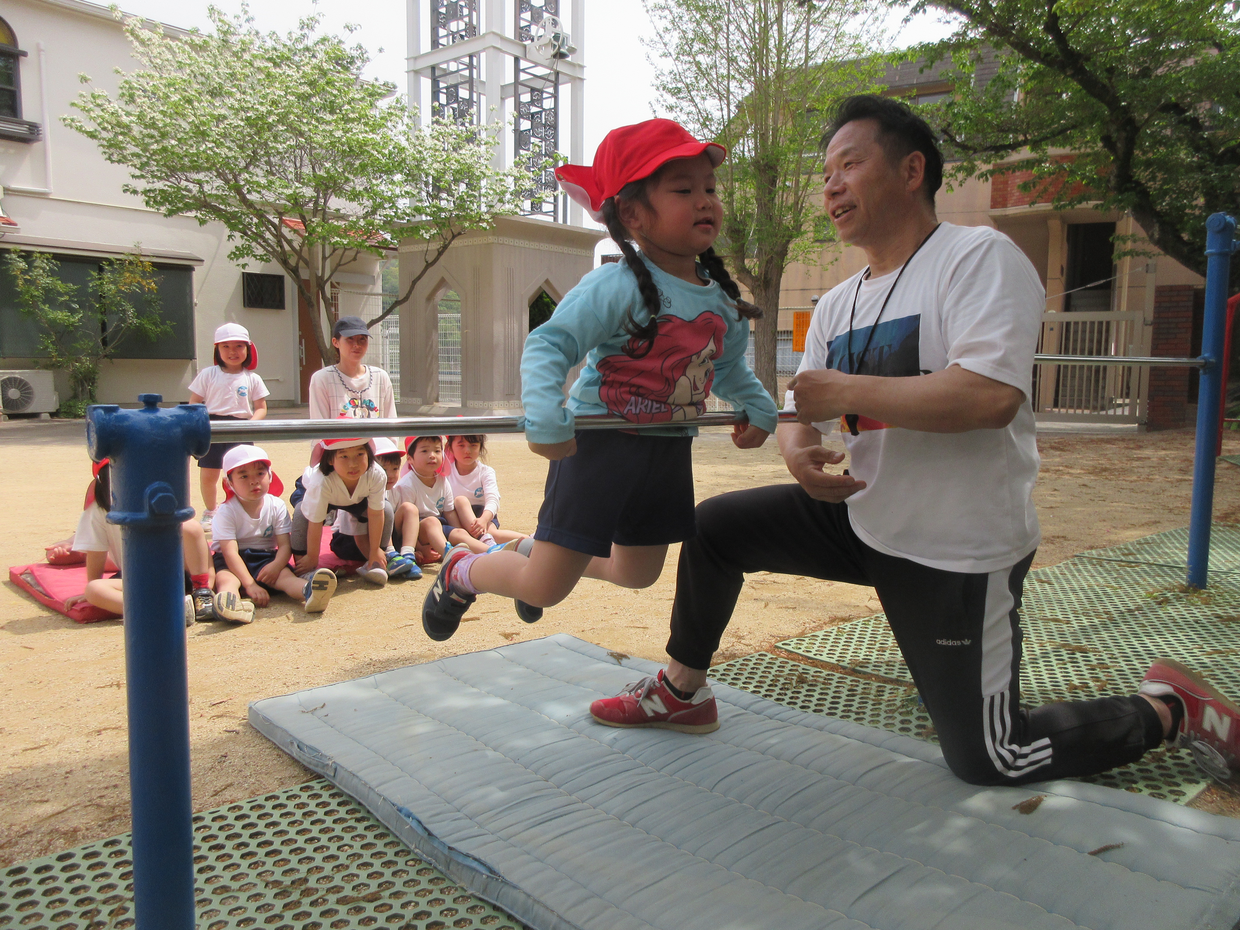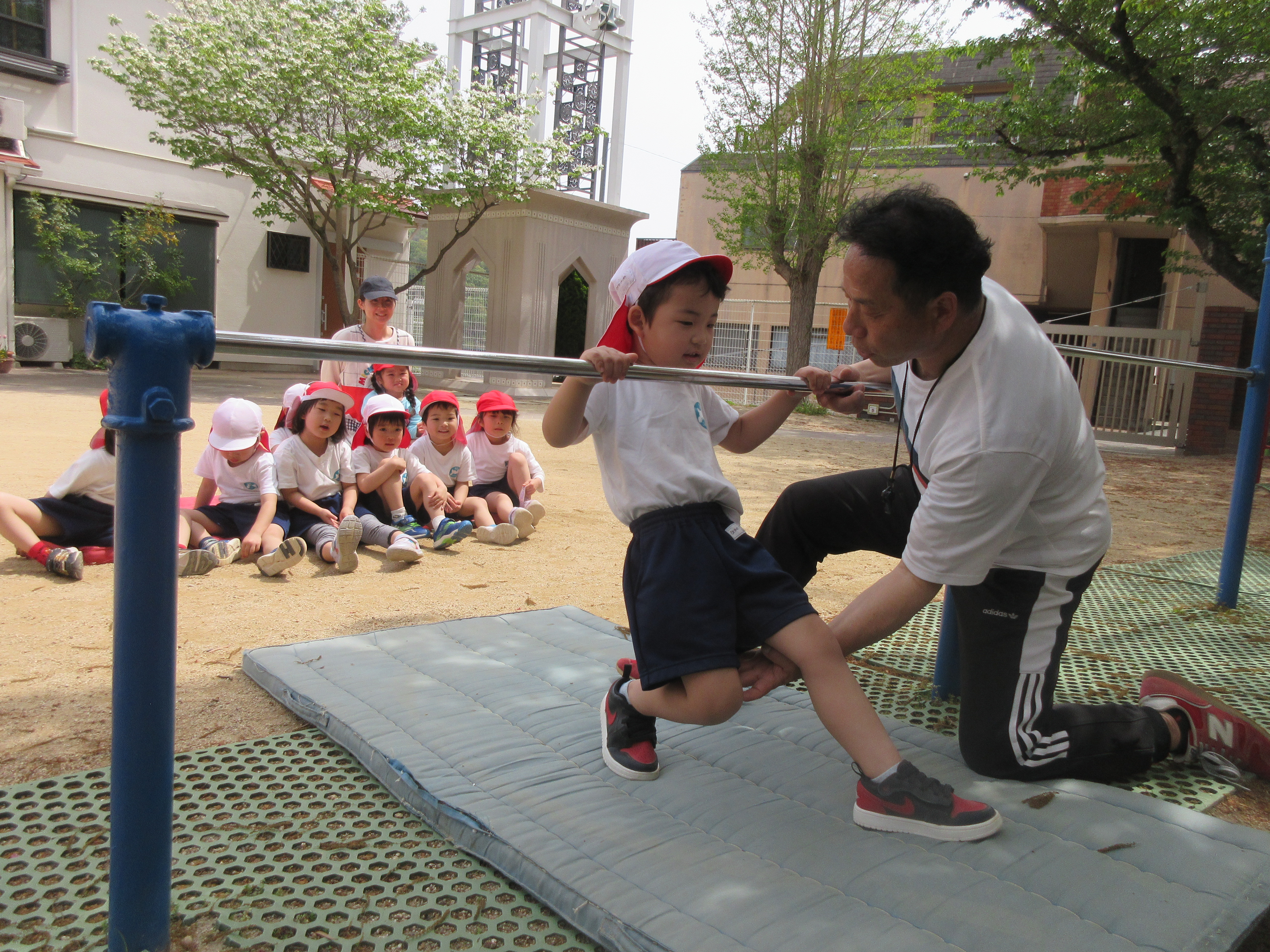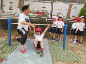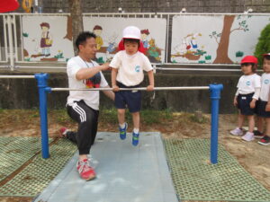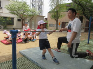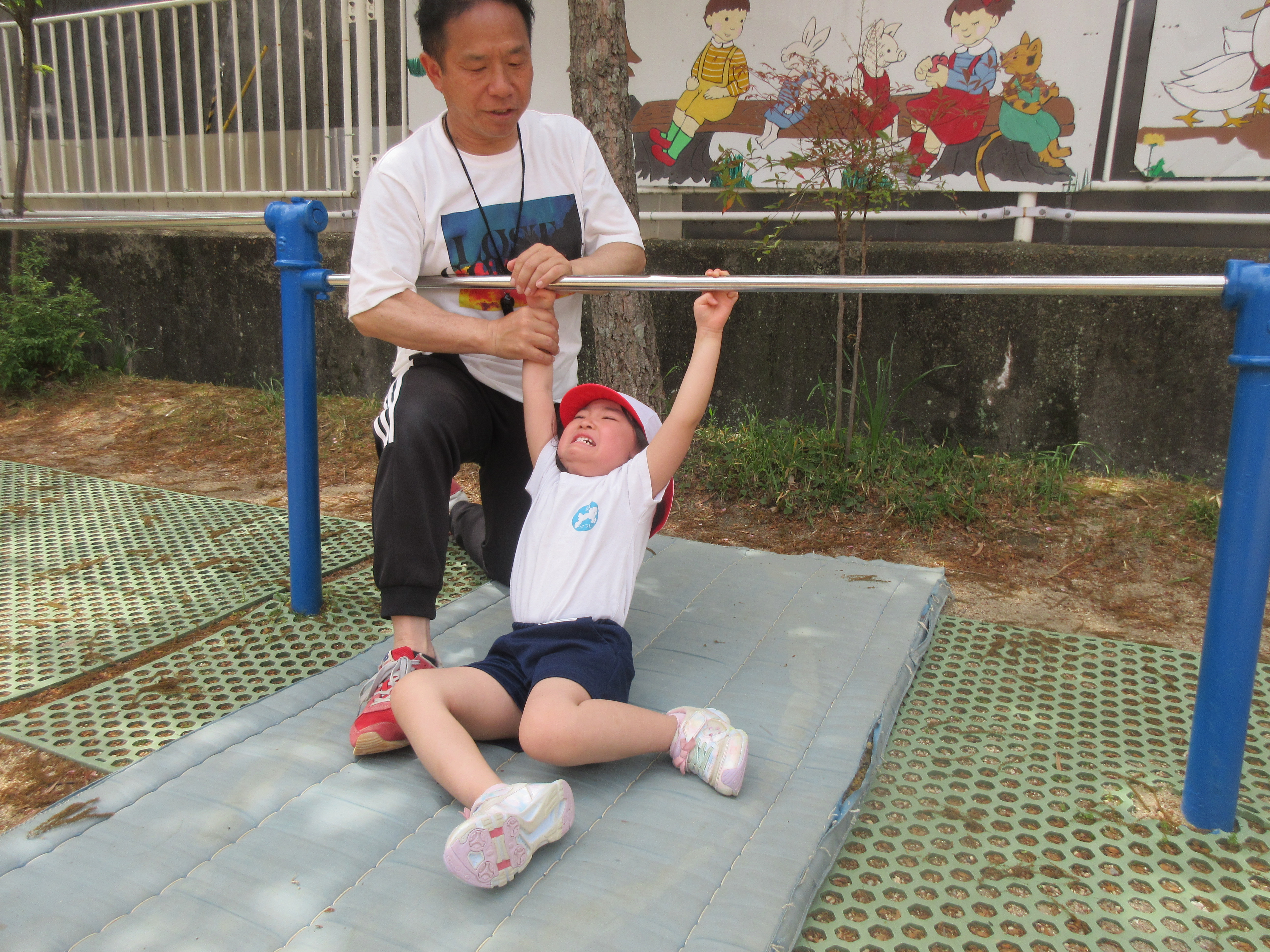 体育あそびが今週あり、並びっこの練習から鉄棒まで大西先生と一緒にしました!鉄棒では逆上がりにも挑戦中です!