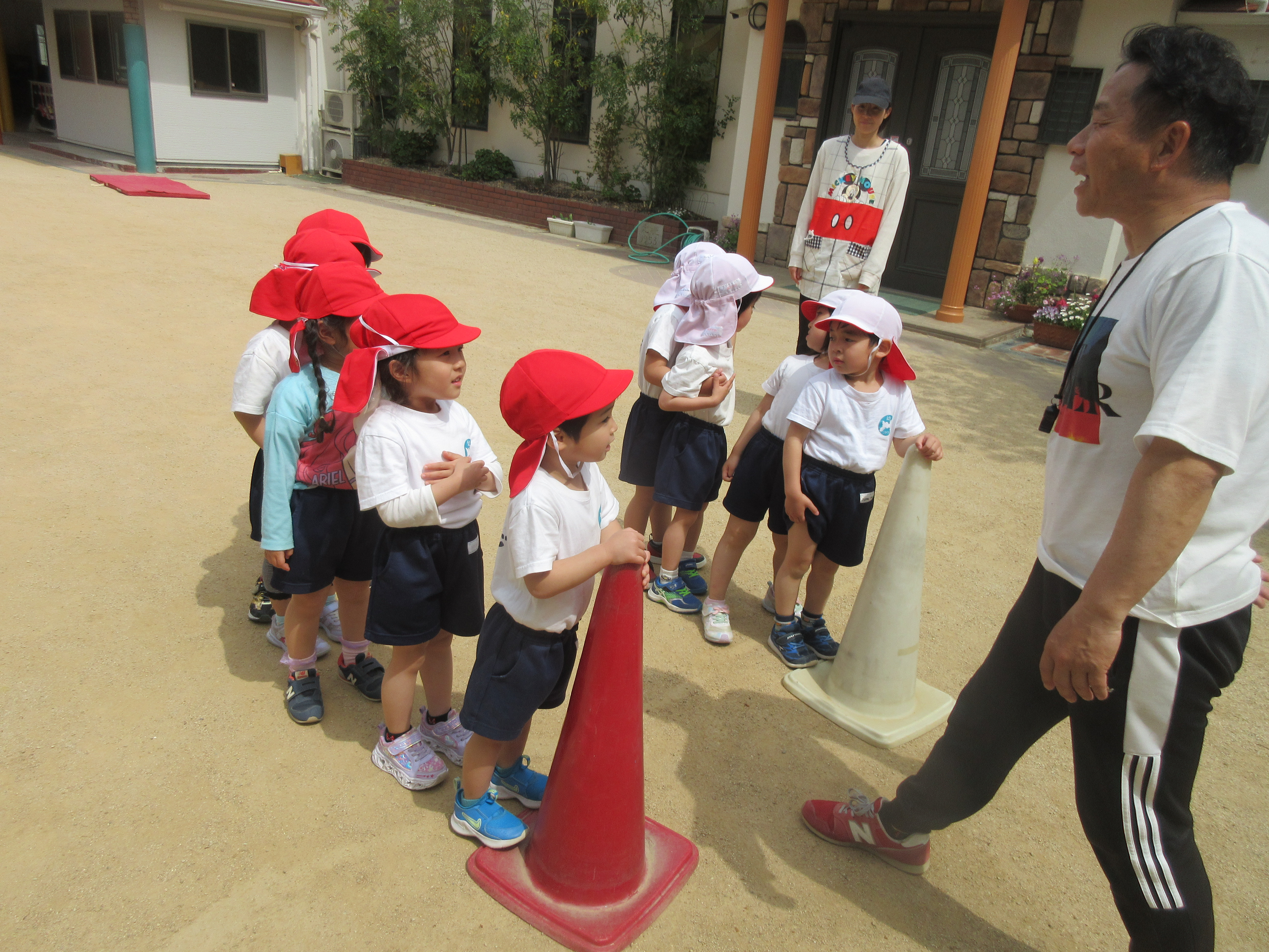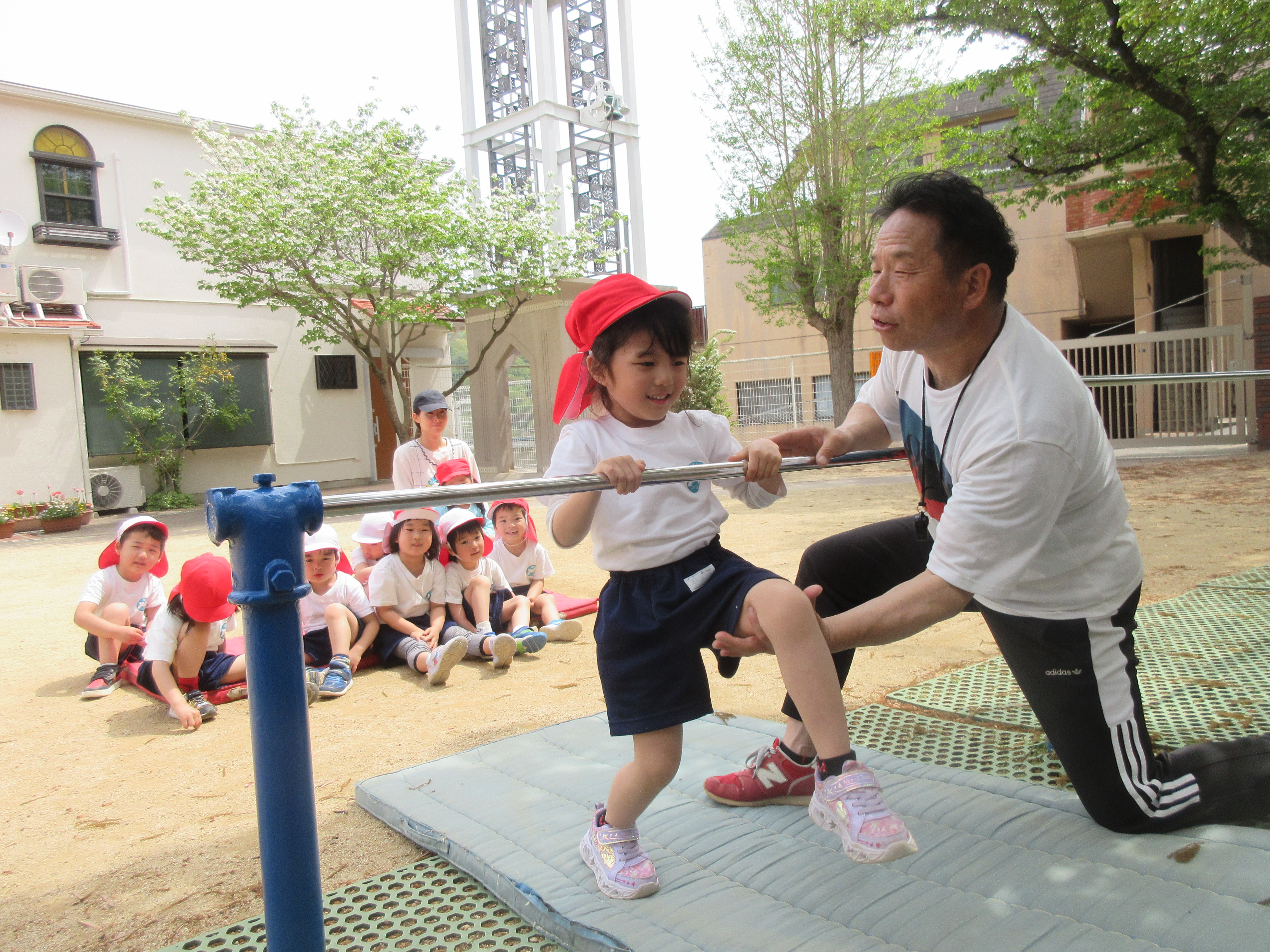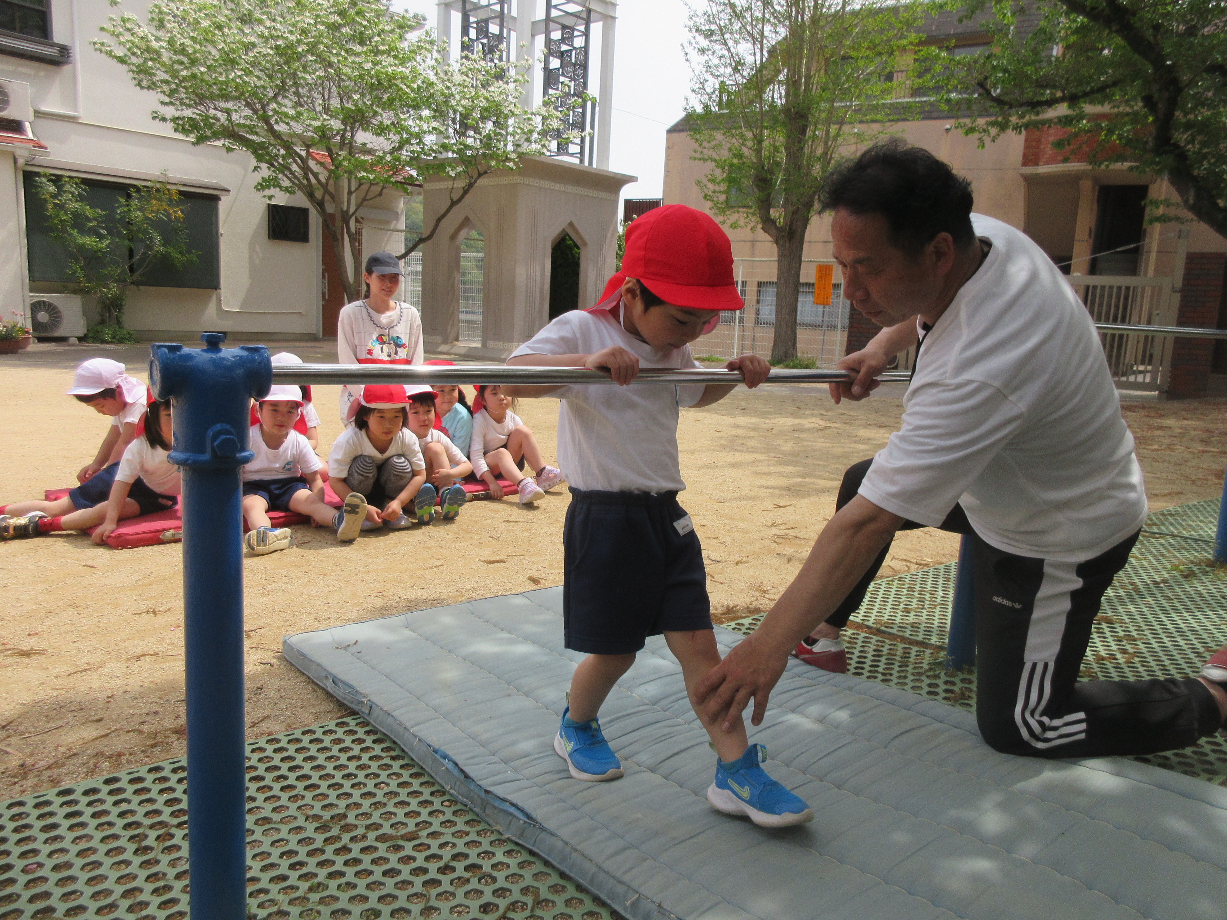 体育あそびが今週あり、並びっこの練習から鉄棒まで大西先生と一緒にしました!鉄棒では逆上がりにも挑戦中です!