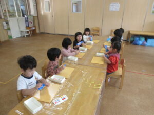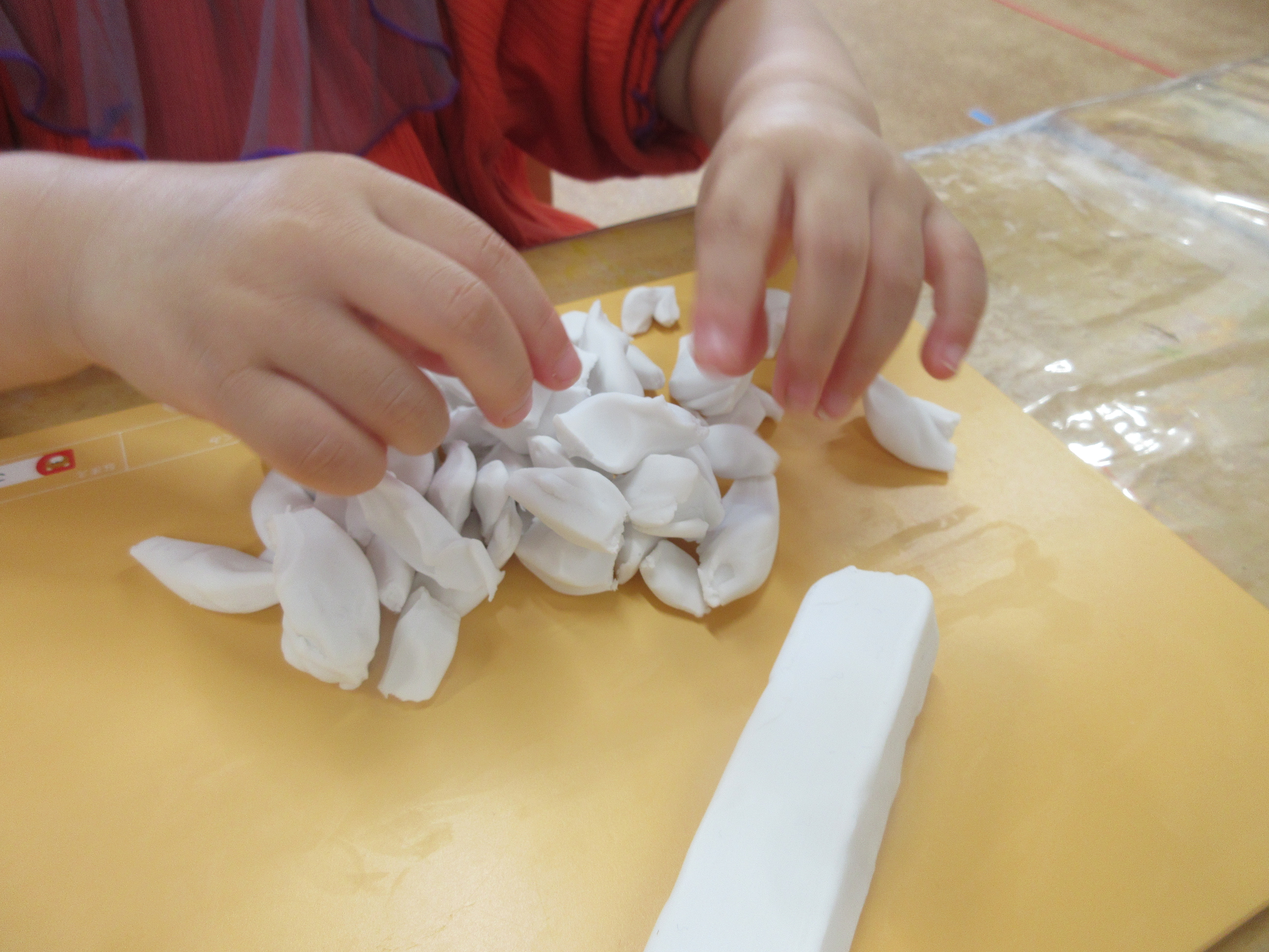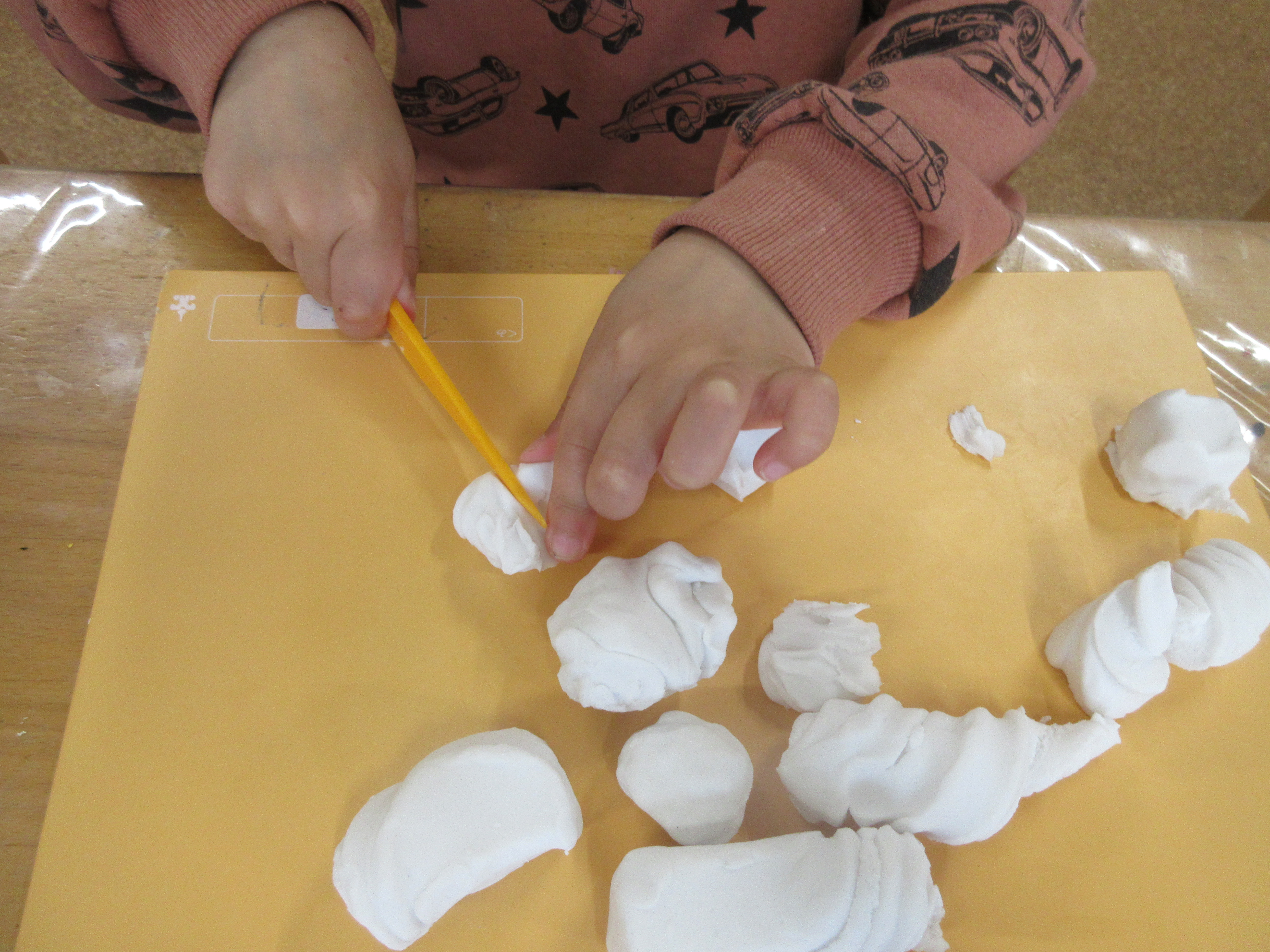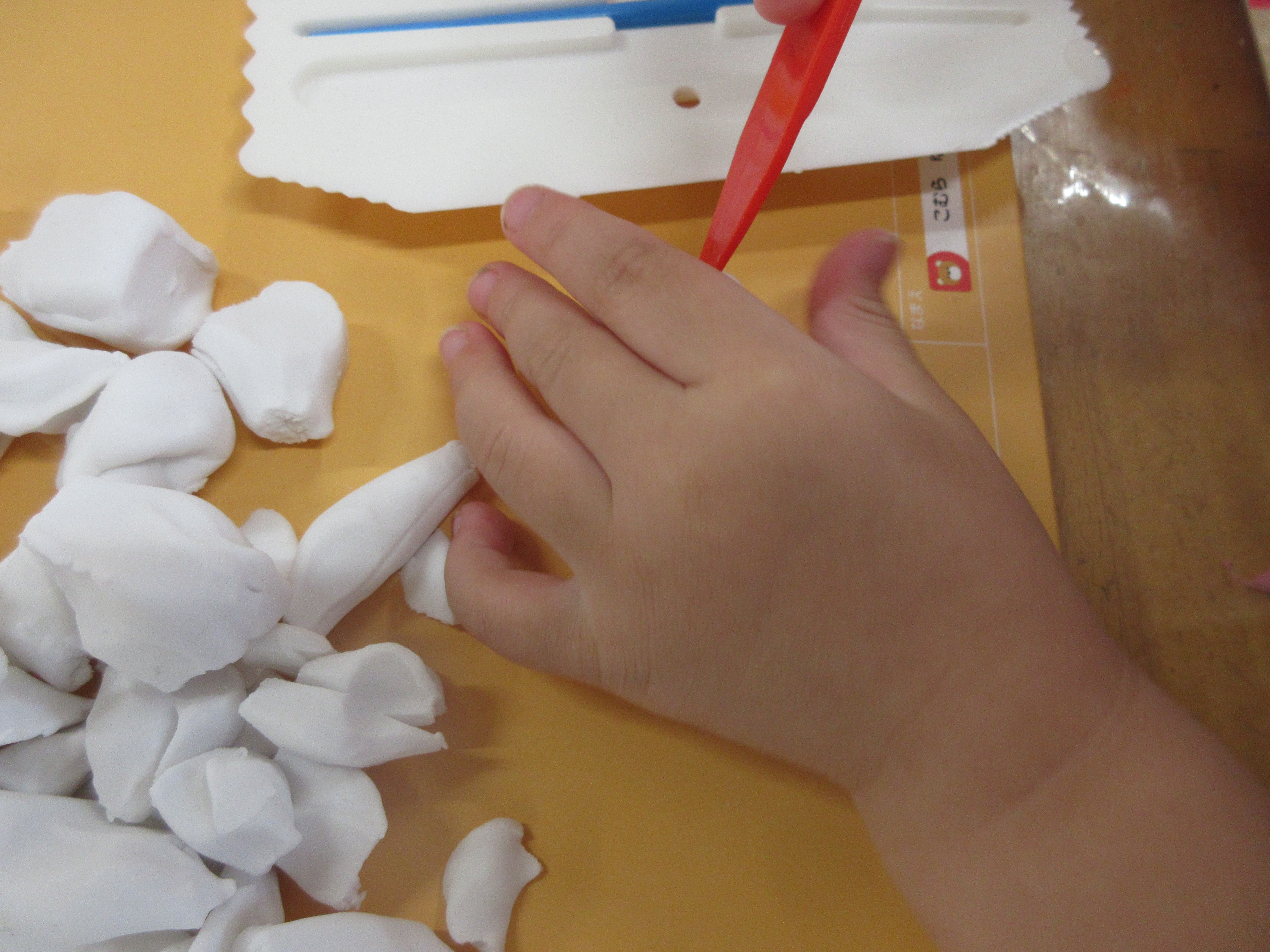 今日は粘土あそびをしました。新しい粘土をこねて柔らかくしてから、新しい粘土ベラを嬉しそうに使いながら形を作り遊びました。夢中になって遊ぶ姿は微笑ましかったです💕