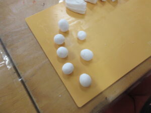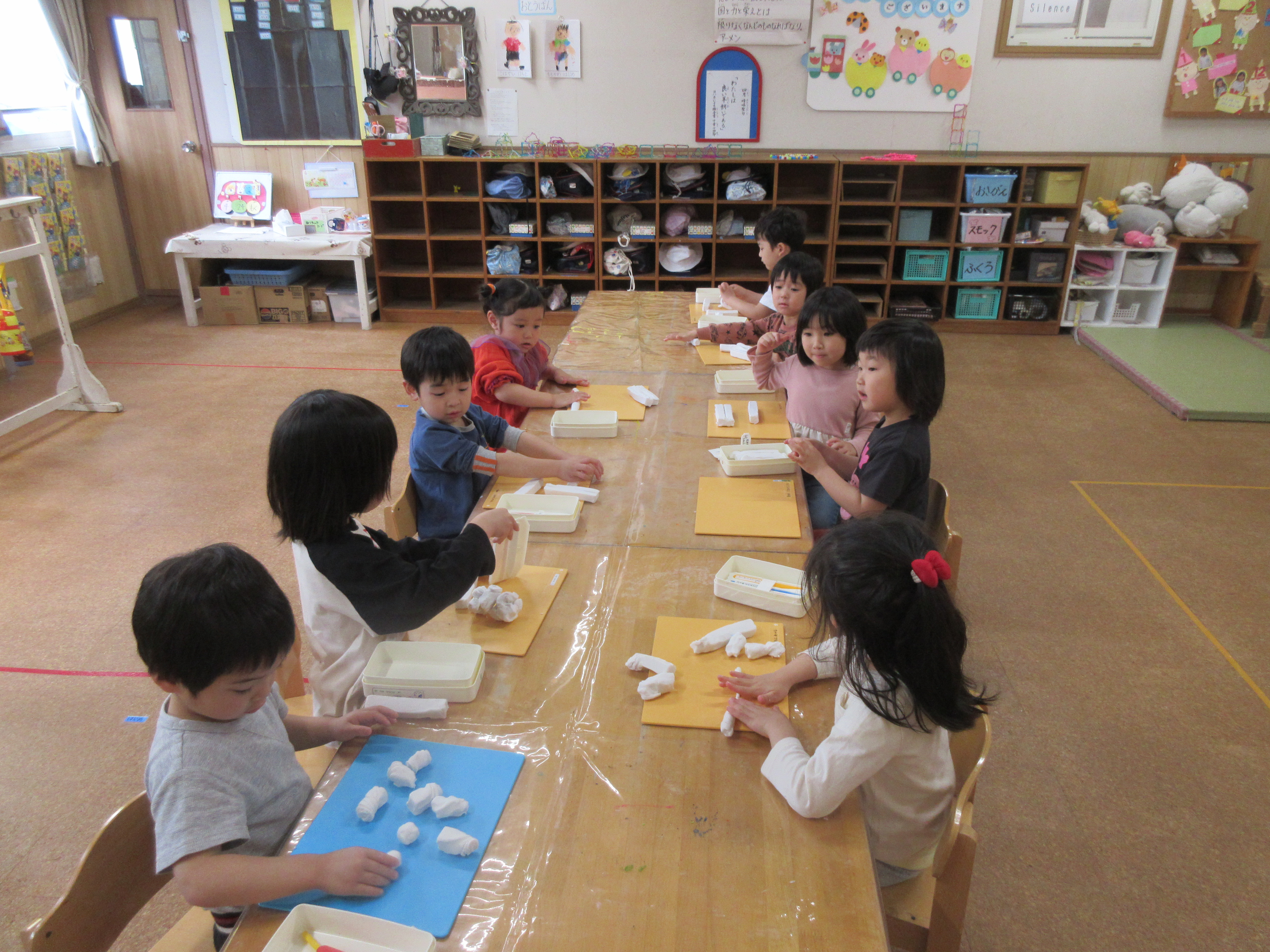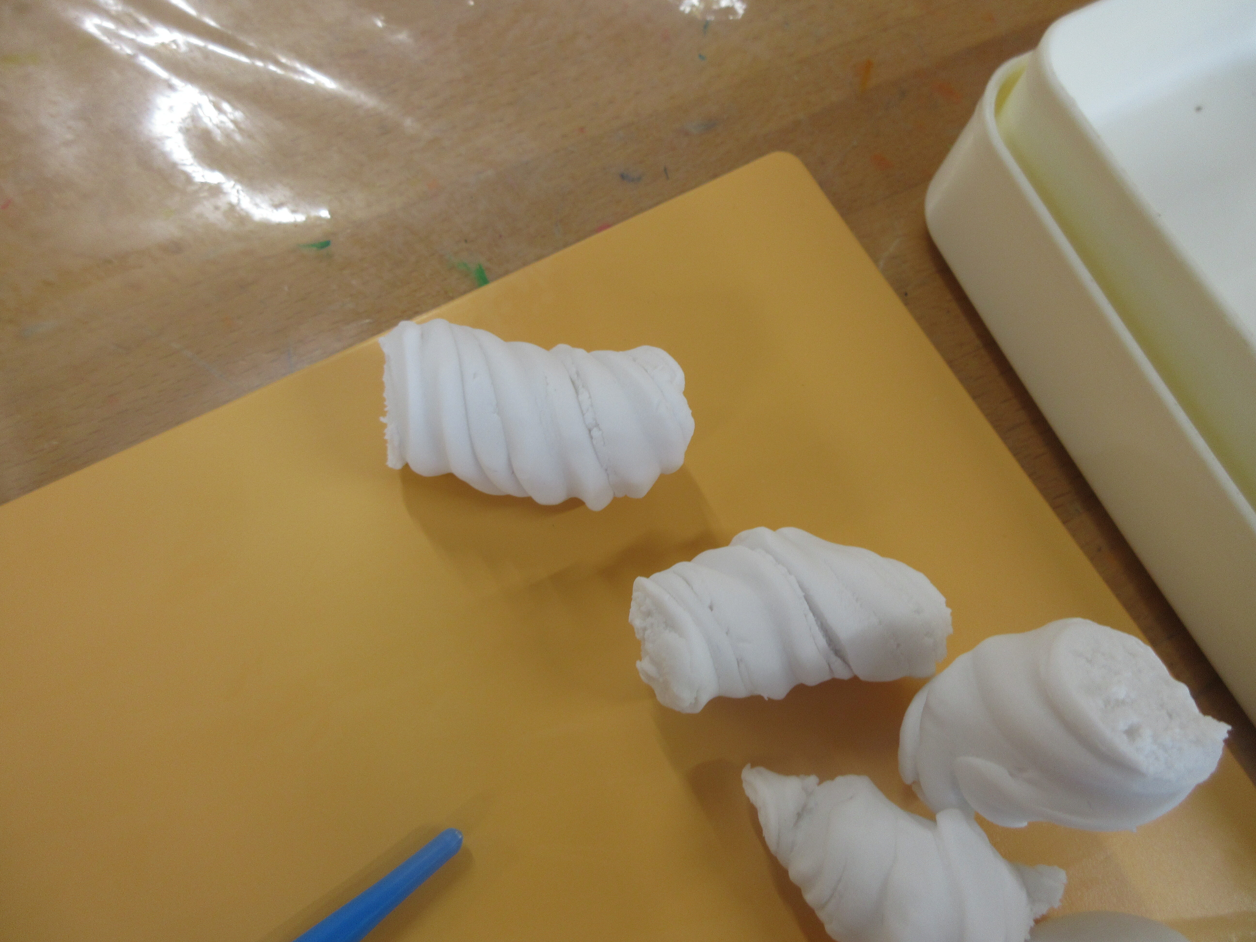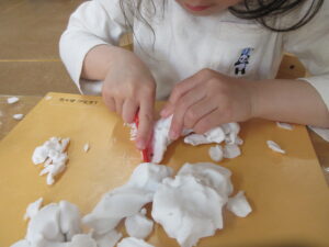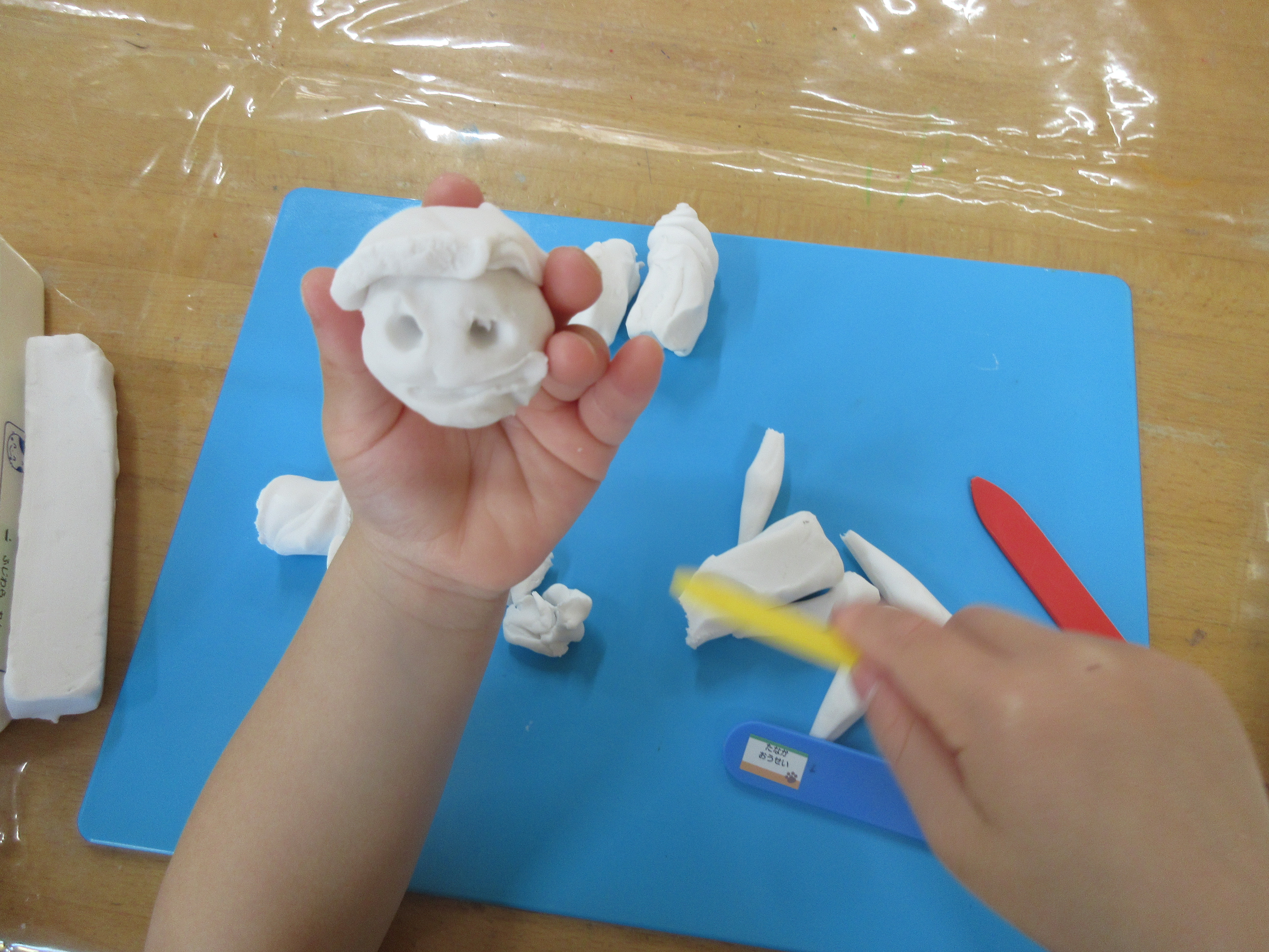 今日は粘土あそびをしました。新しい粘土をこねて柔らかくしてから、新しい粘土ベラを嬉しそうに使いながら形を作り遊びました。夢中になって遊ぶ姿は微笑ましかったです💕