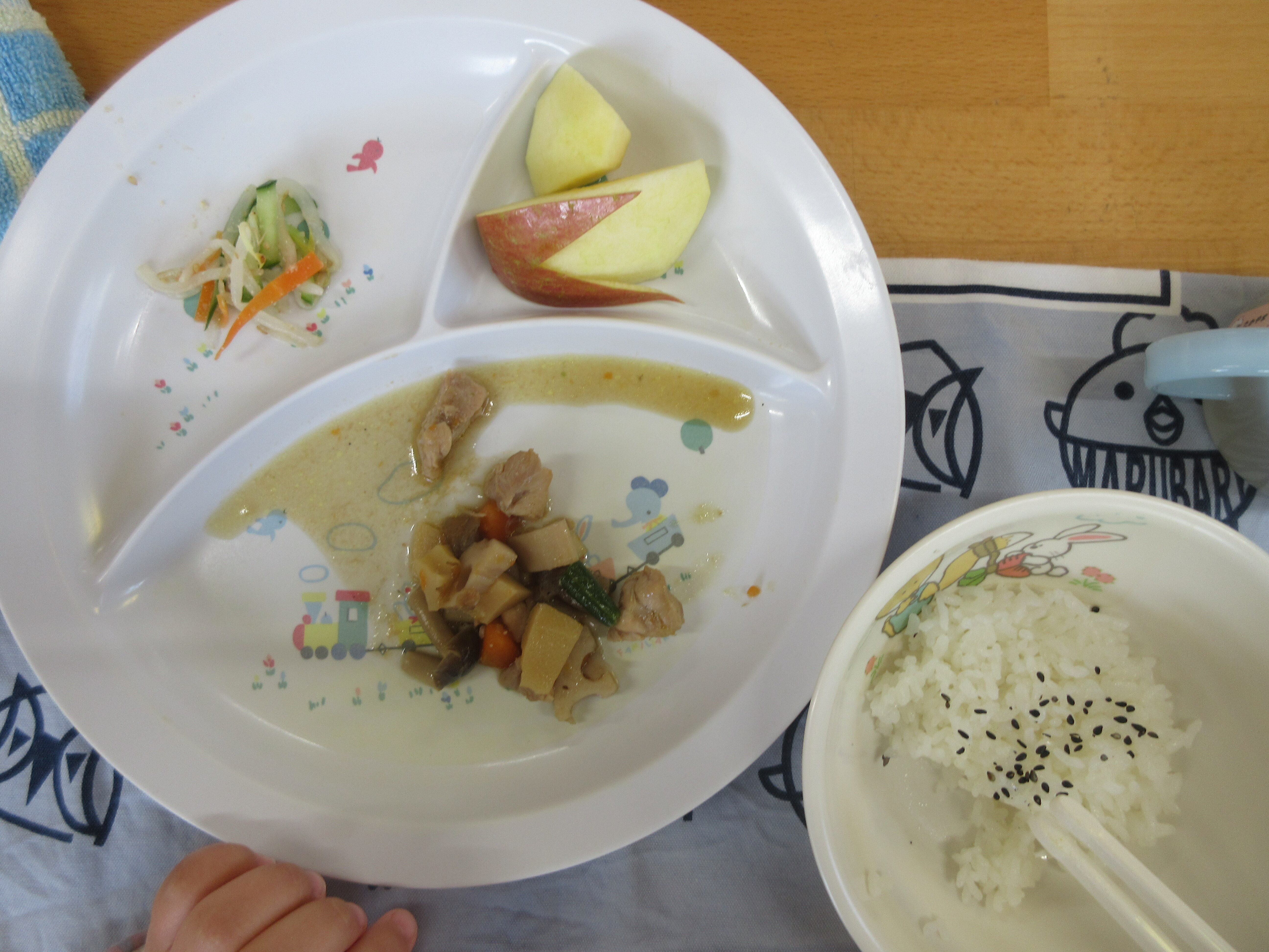 今日の給食は(2号認定のお友だち)ごはん・炒り鳥・胡麻酢和えでした。