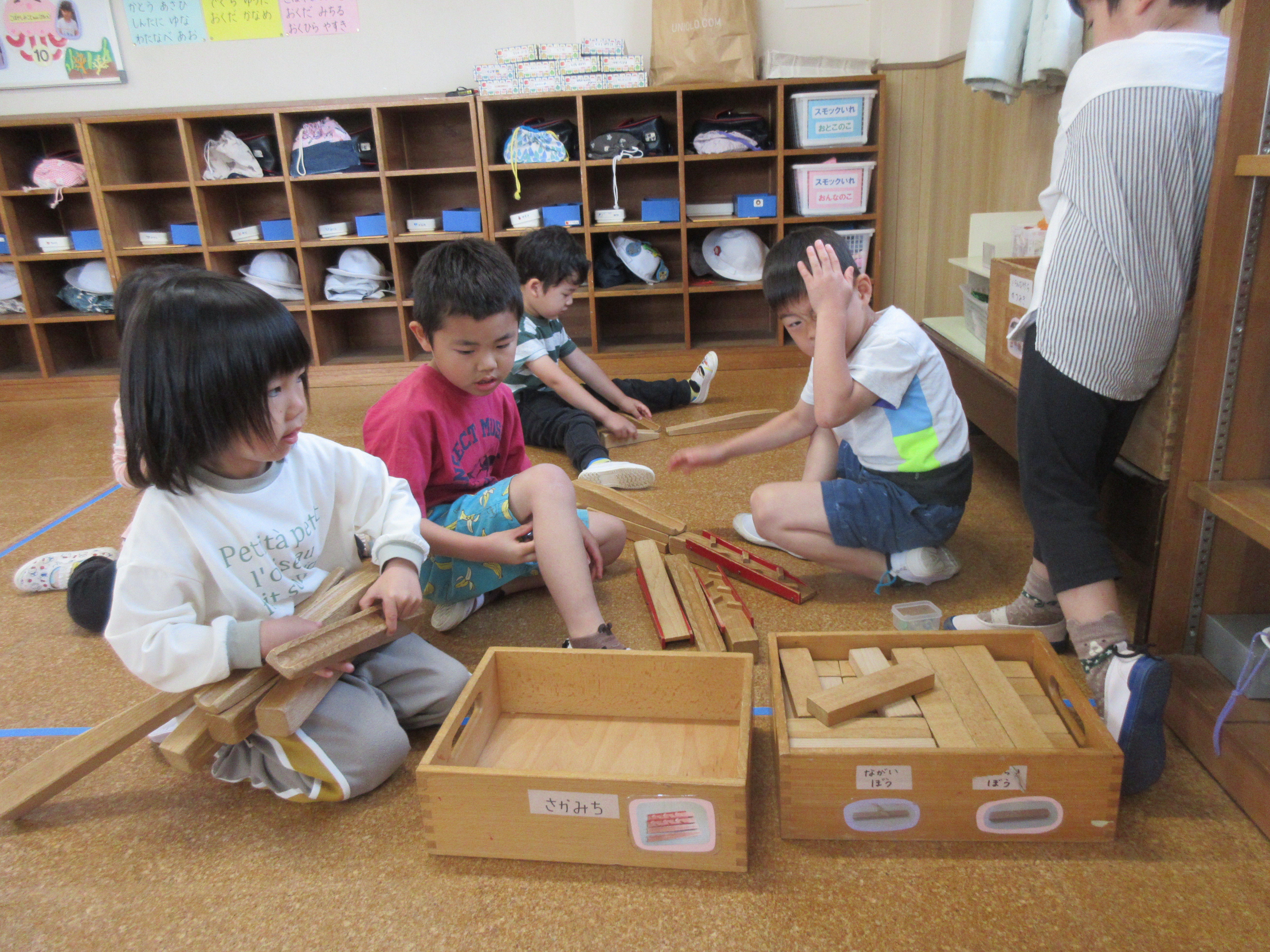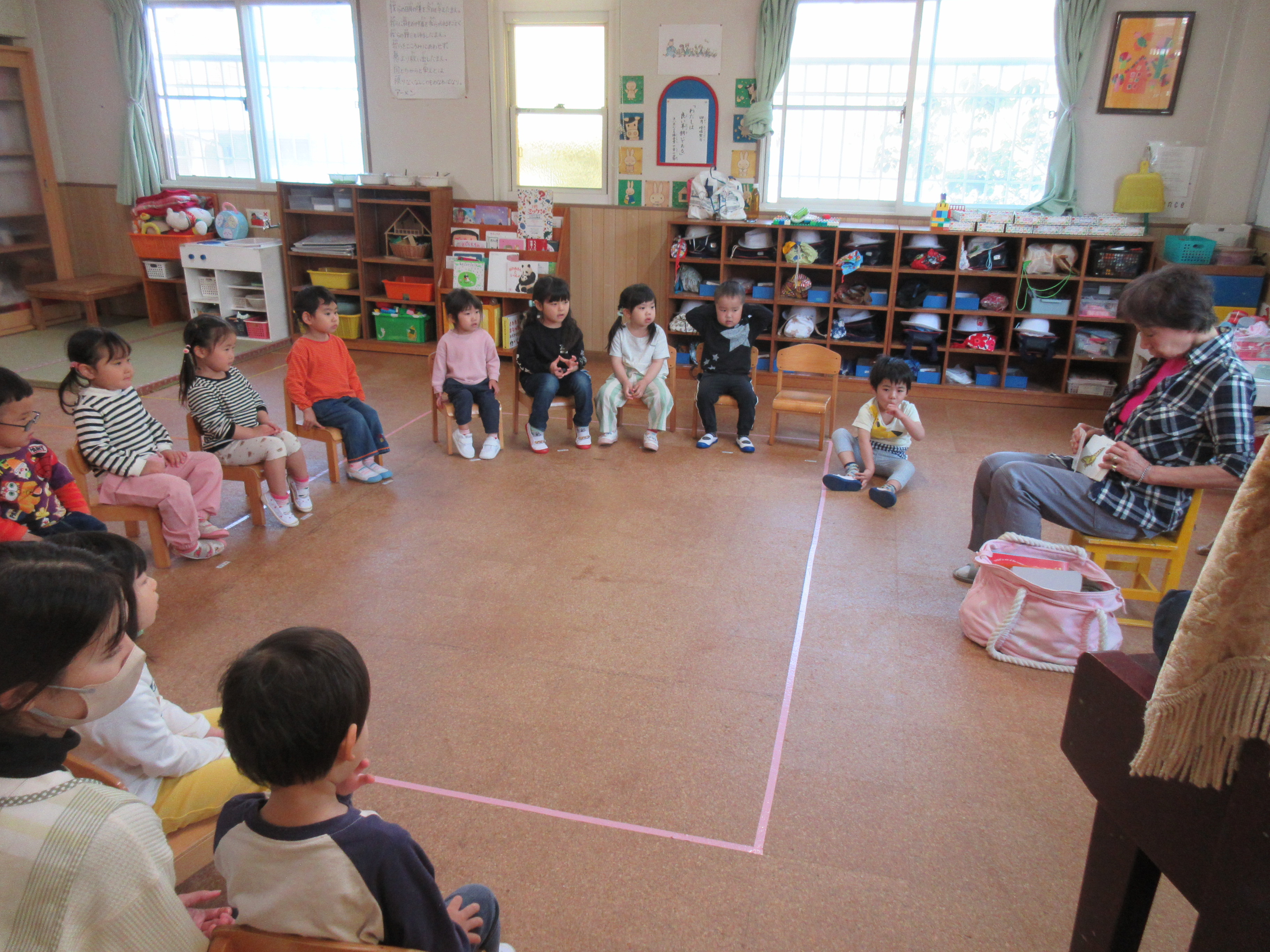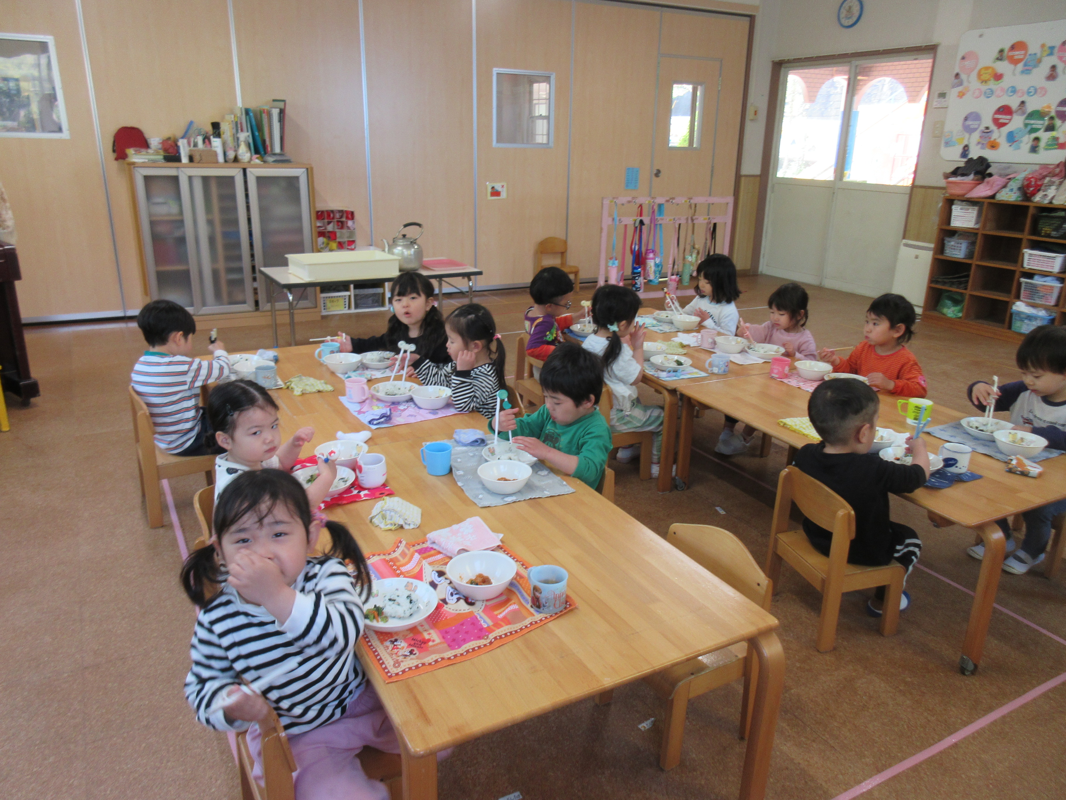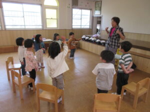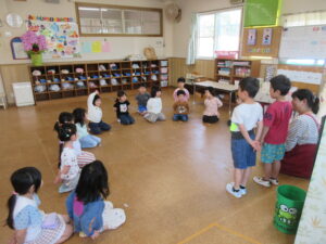 今日は今年度初めての英語遊びがありました。ABCや色、動物などを声に出している子どもたち!