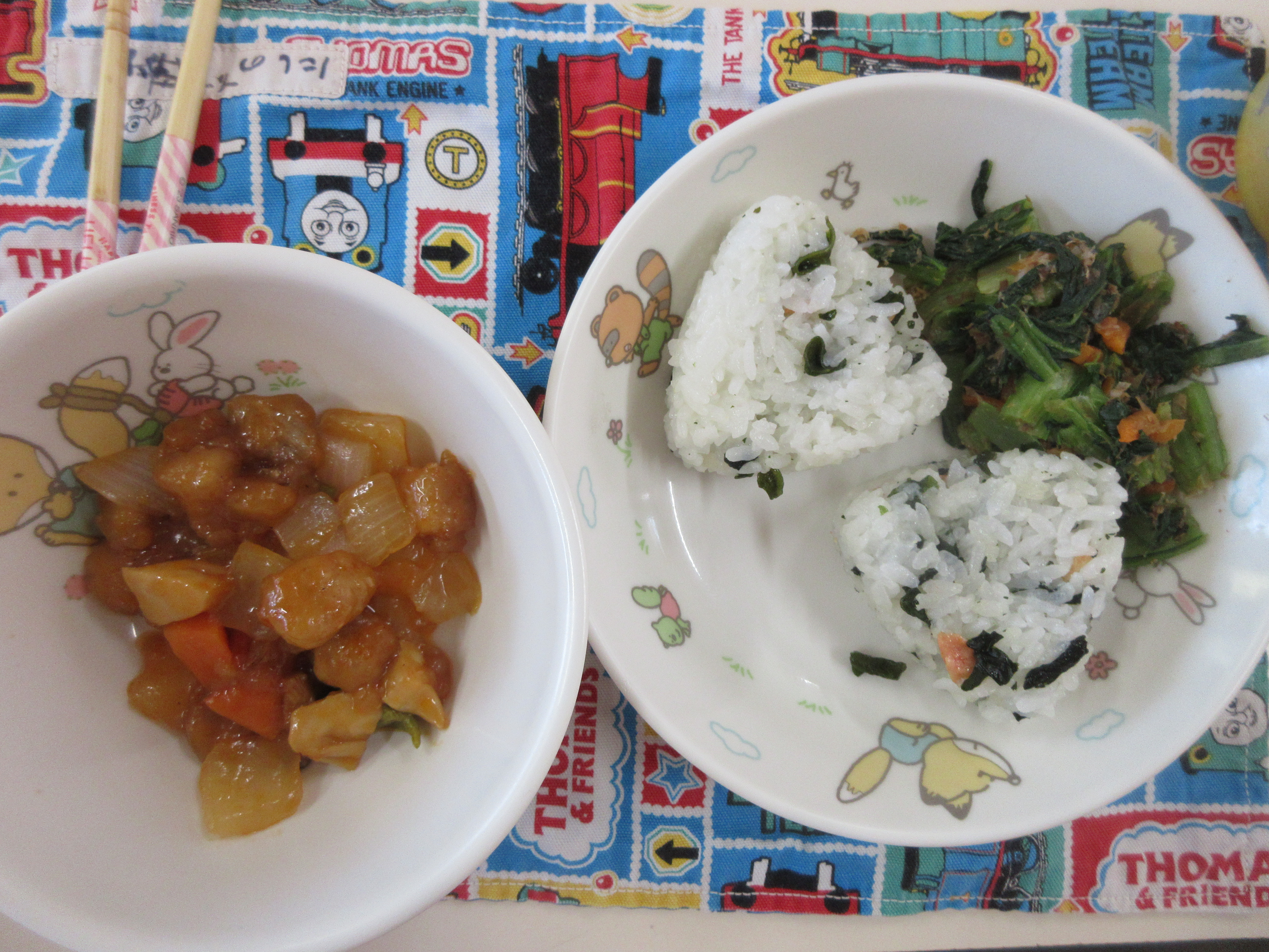 今日の給食は酢豚・ご飯・お浸しでした。