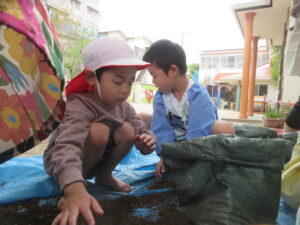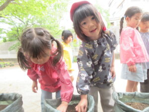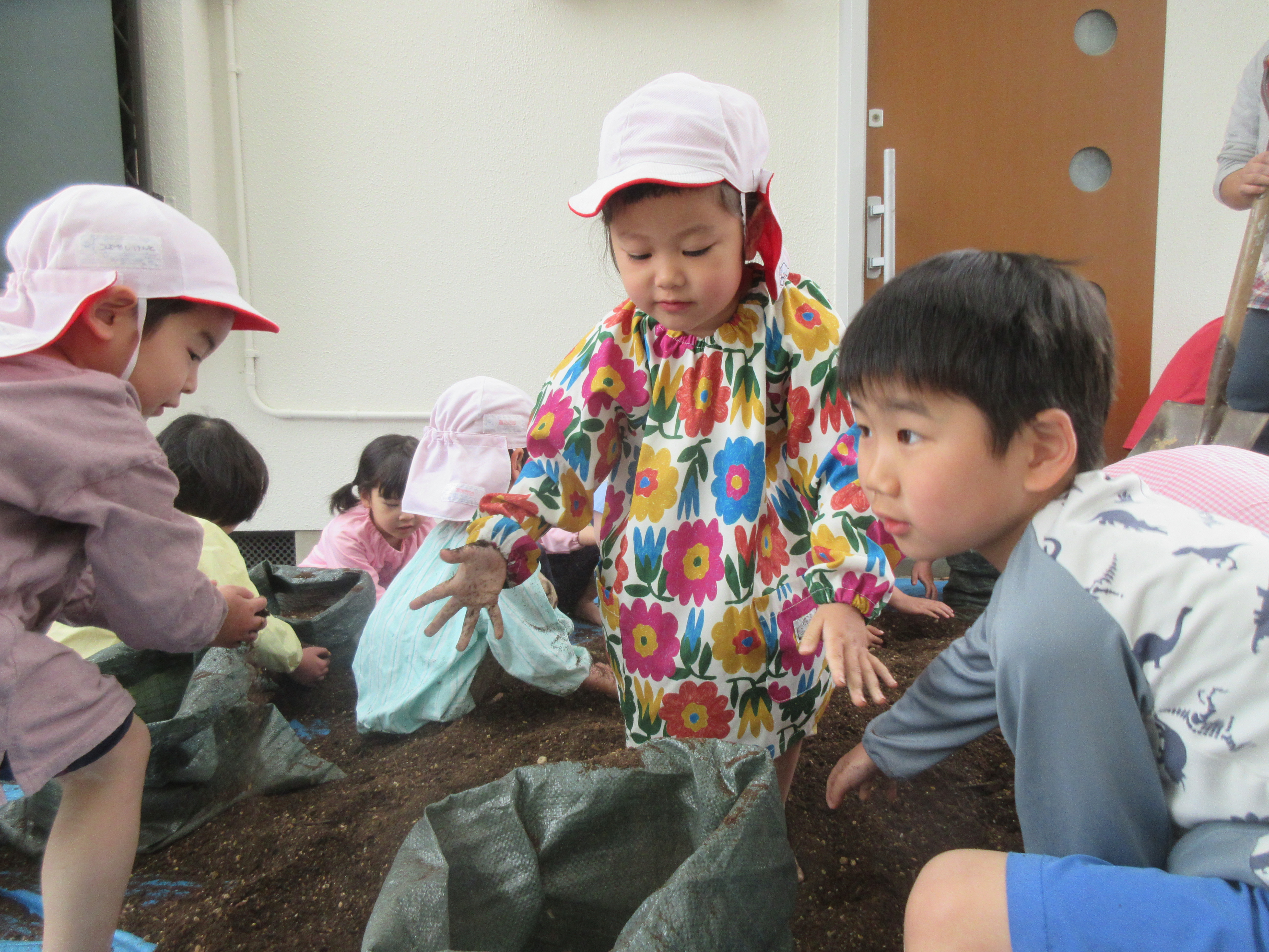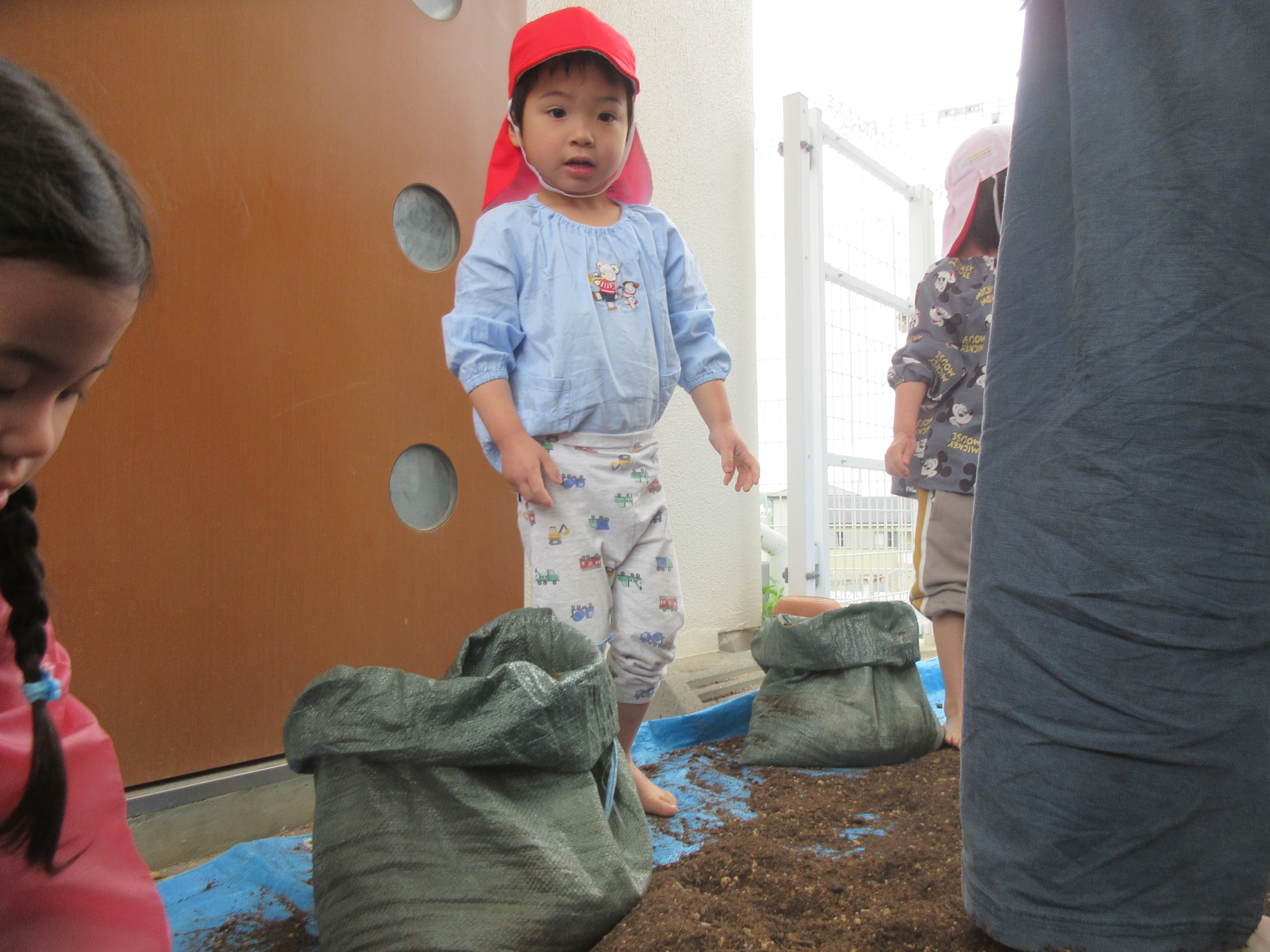 先週にゆり組さんとじゃが芋の種芋を植えました!!みんなでじゃが芋ができたら「ポテトにして食べる?」「ポテトチップスにする?」などと楽しそうな会話も聞こえてきました。みんなで大きくなることを願いながら育てていきたいと思います。