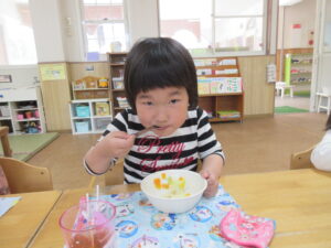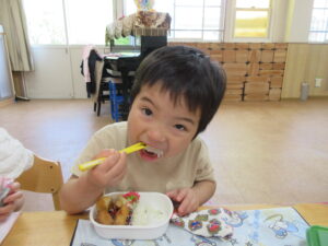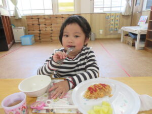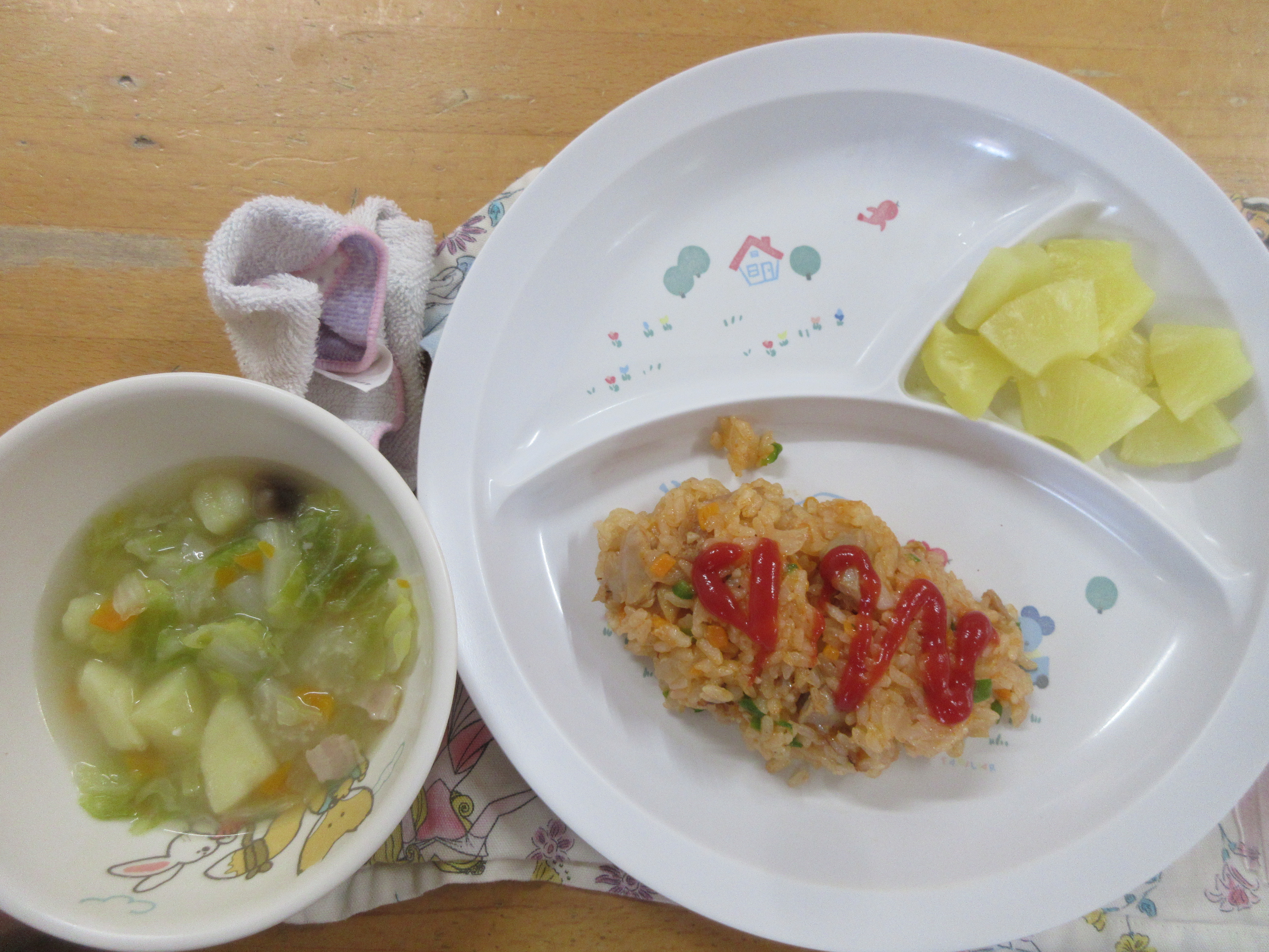 今日の(2号認定の)給食はチキンライス・野菜スープ・パイン缶でした。