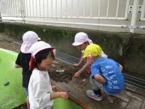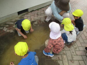 お集まりのあとは、お外で遊びました♪ 水たまりをチャプチャプしたり、絵を描いたり、虫を探したり、遊具で遊んだり・・・とても楽しい時間を過ごすことができました!