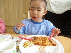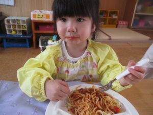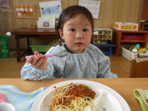今日の給食は、ミートスパゲティとツナサラダでした!みんな嬉しそうにモグモグたくさん食べていました💕