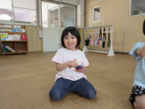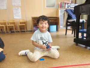お部屋に入ってからはカスタネットで遊びました。「先生の真似っこをできるかな」と声をかけるとみんな見本をよく見て叩いていました。また、クラスのお友だちの名前にリズムを付けて叩くのは楽しそうな様子でした♪
