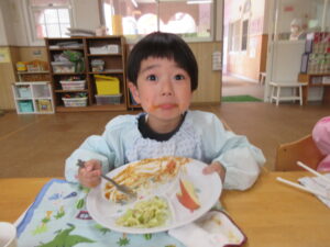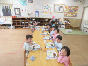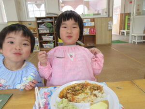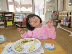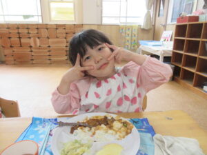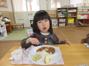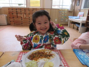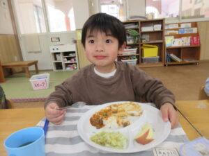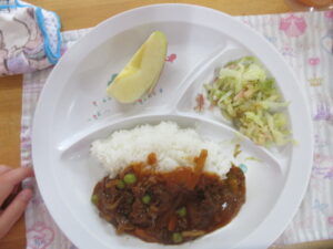 今日の給食はハヤシライス・蒸しキャベツ・リンゴでした。