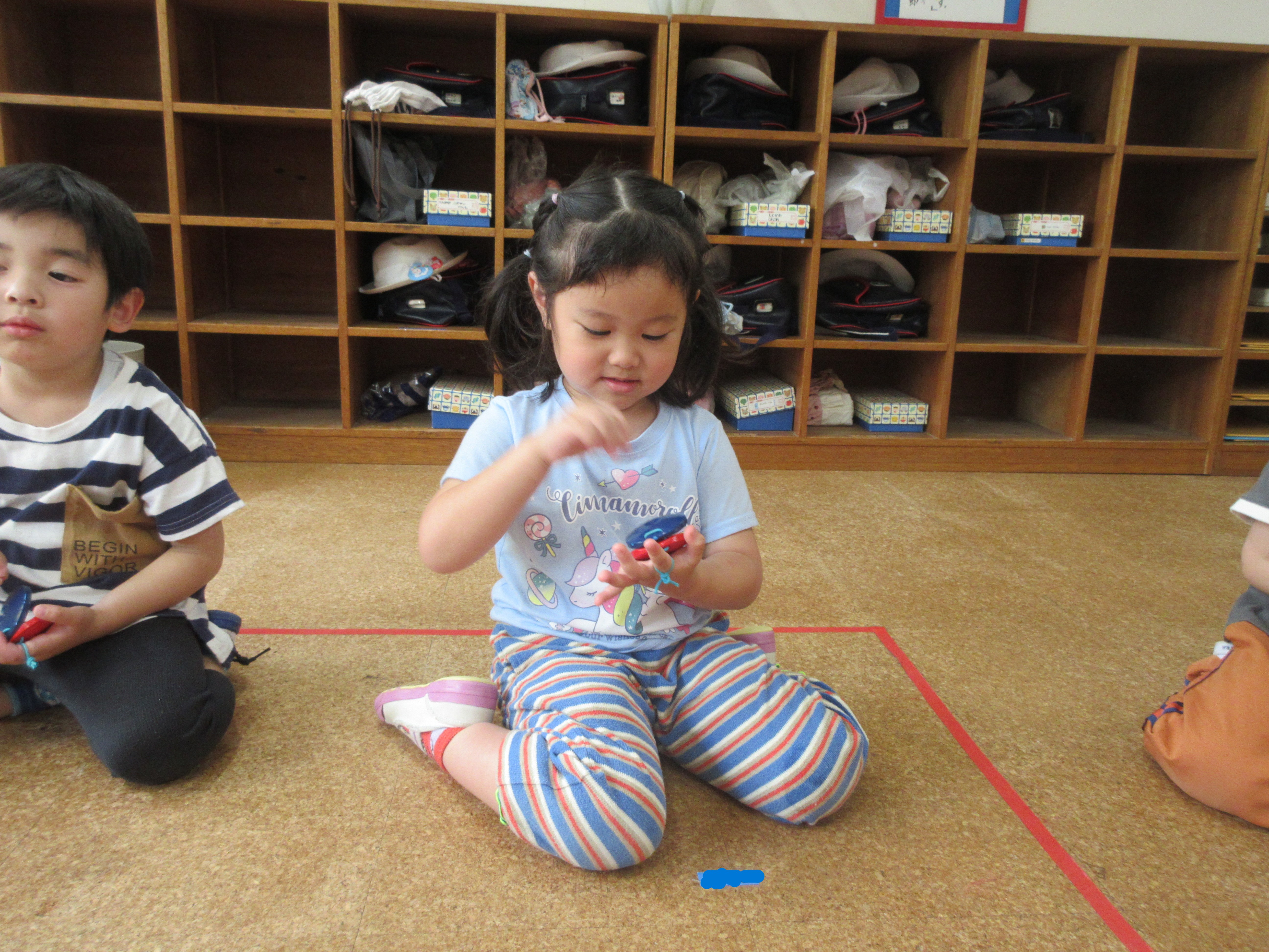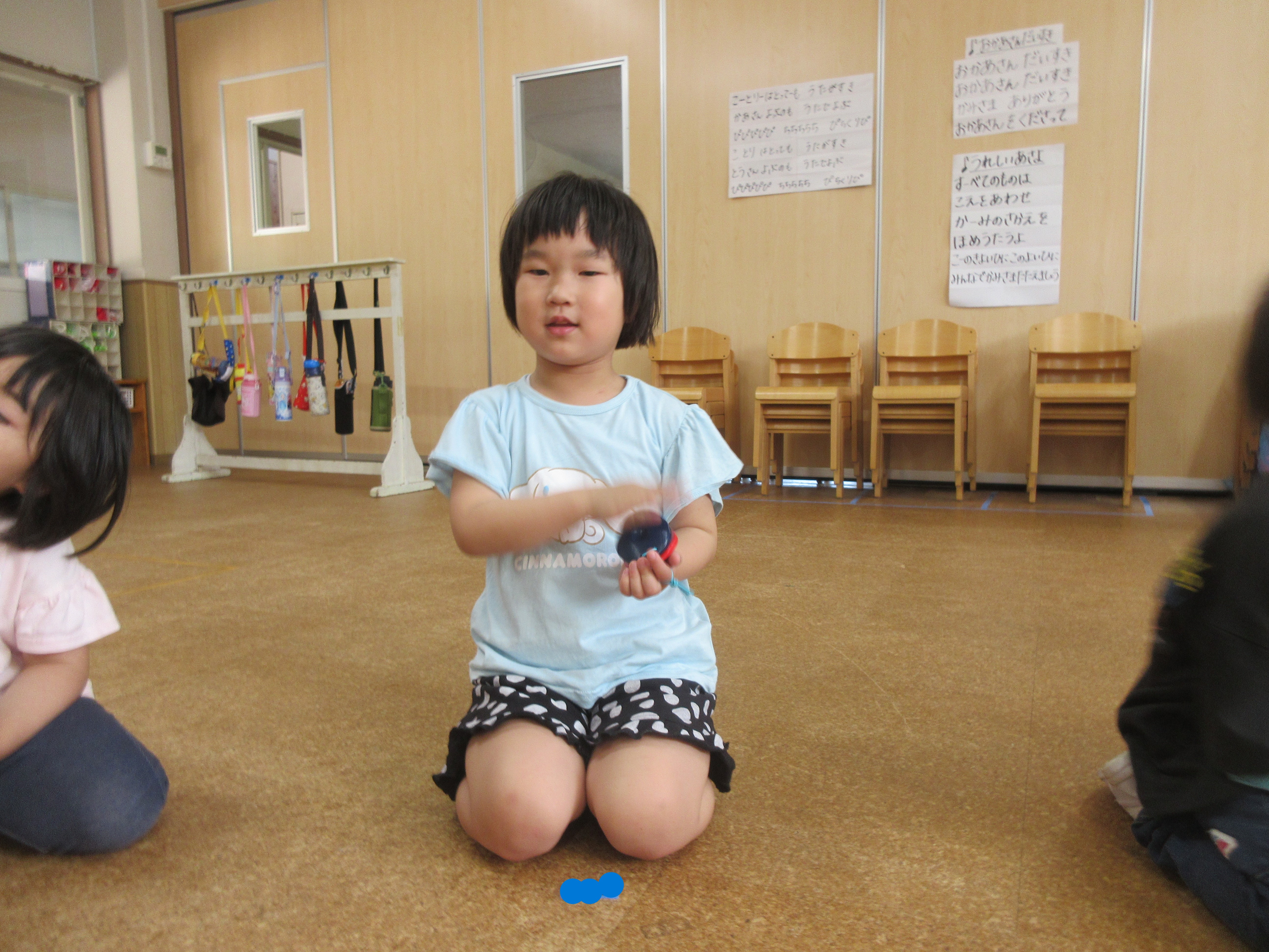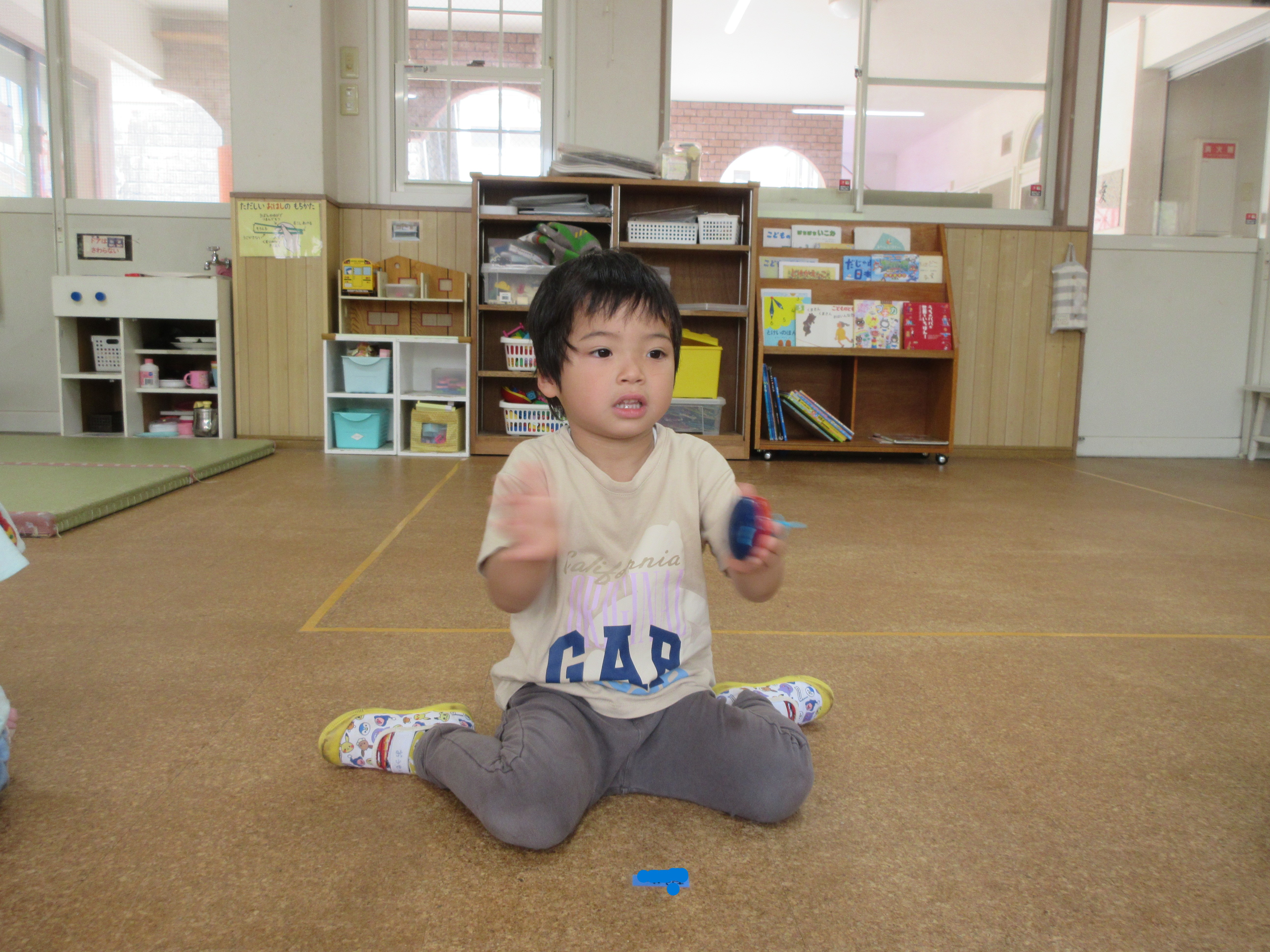 お部屋に入ってからはカスタネットで遊びました。「先生の真似っこをできるかな」と声をかけるとみんな見本をよく見て叩いていました。また、クラスのお友だちの名前にリズムを付けて叩くのは楽しそうな様子でした♪