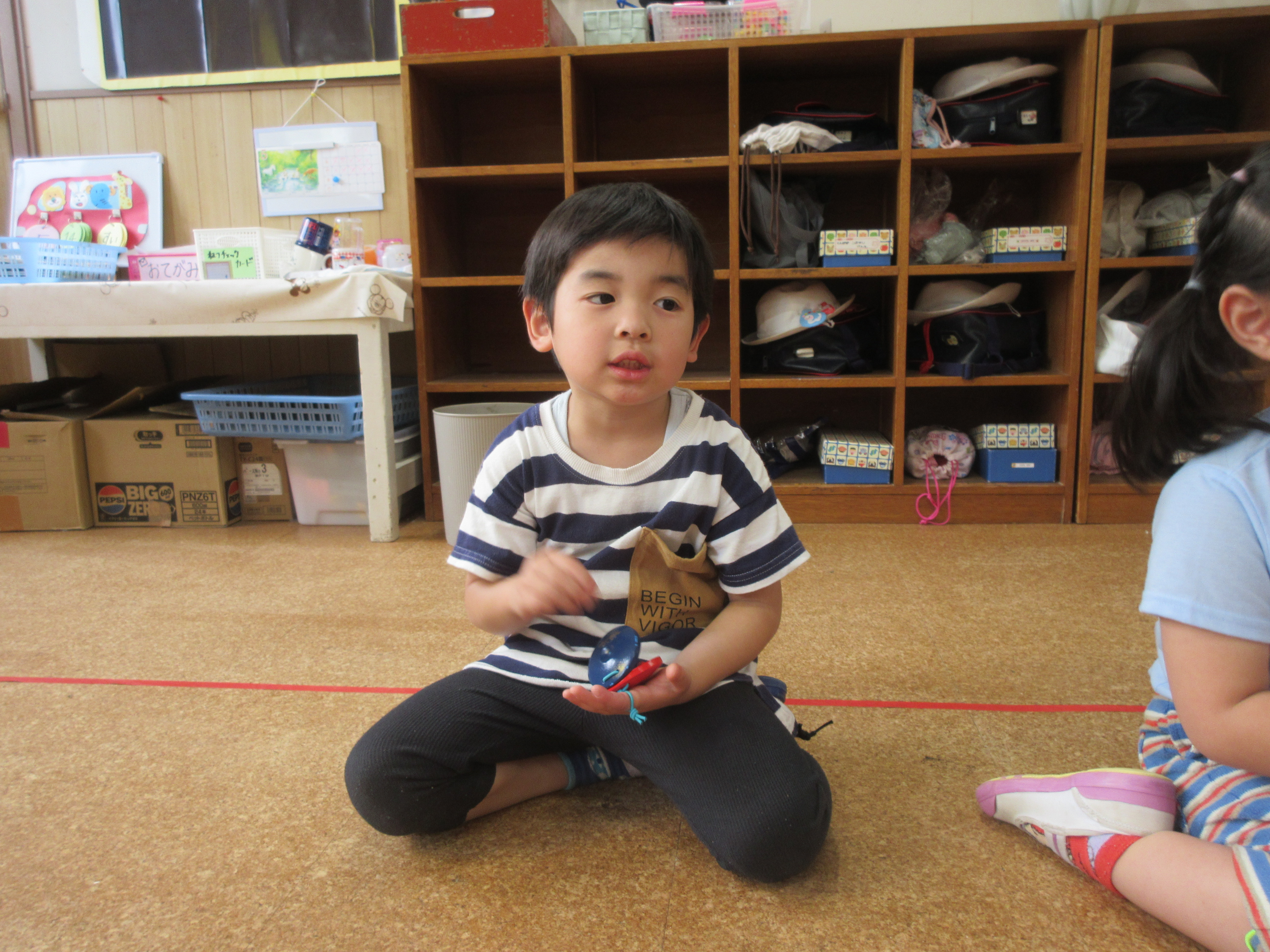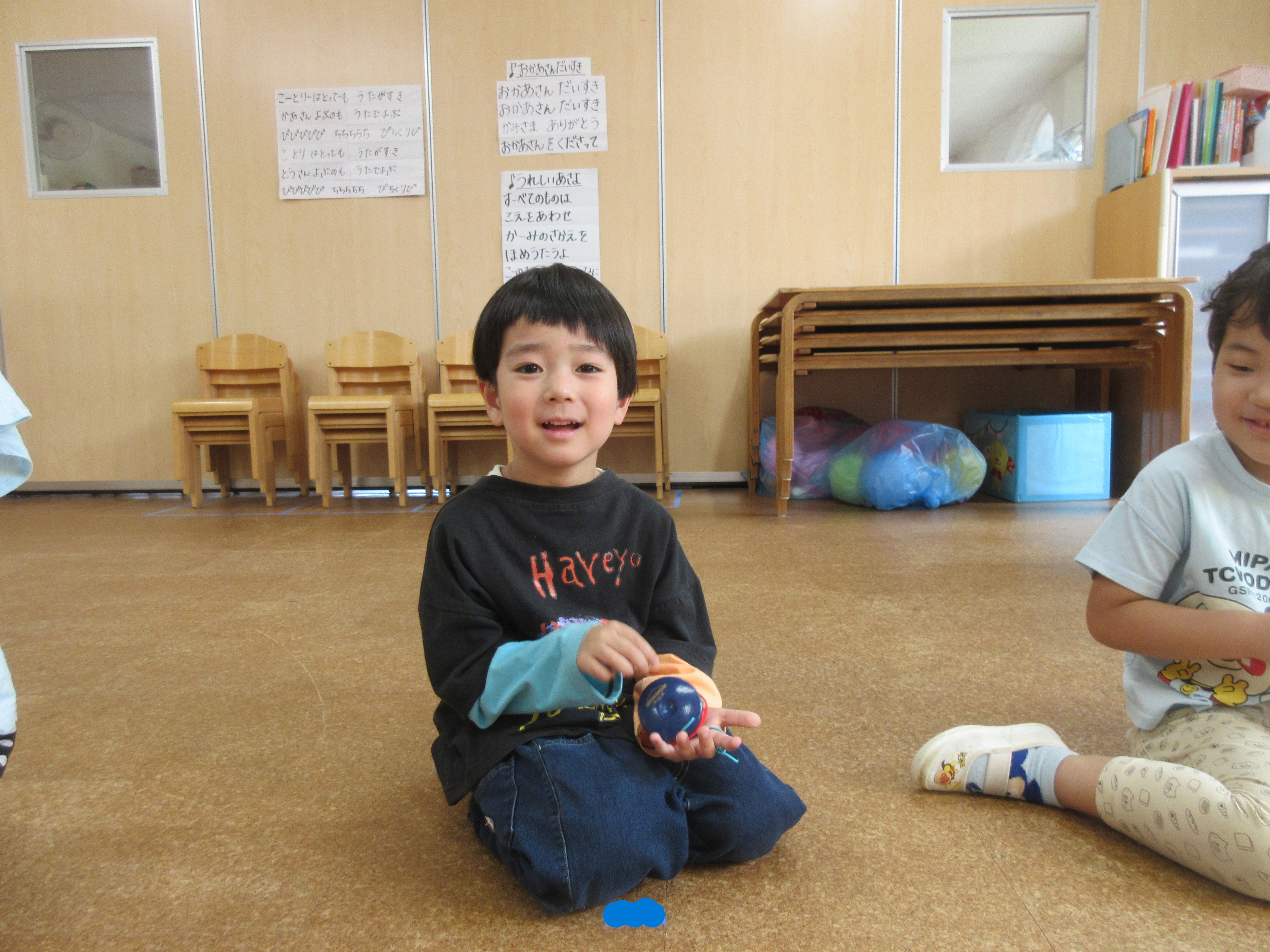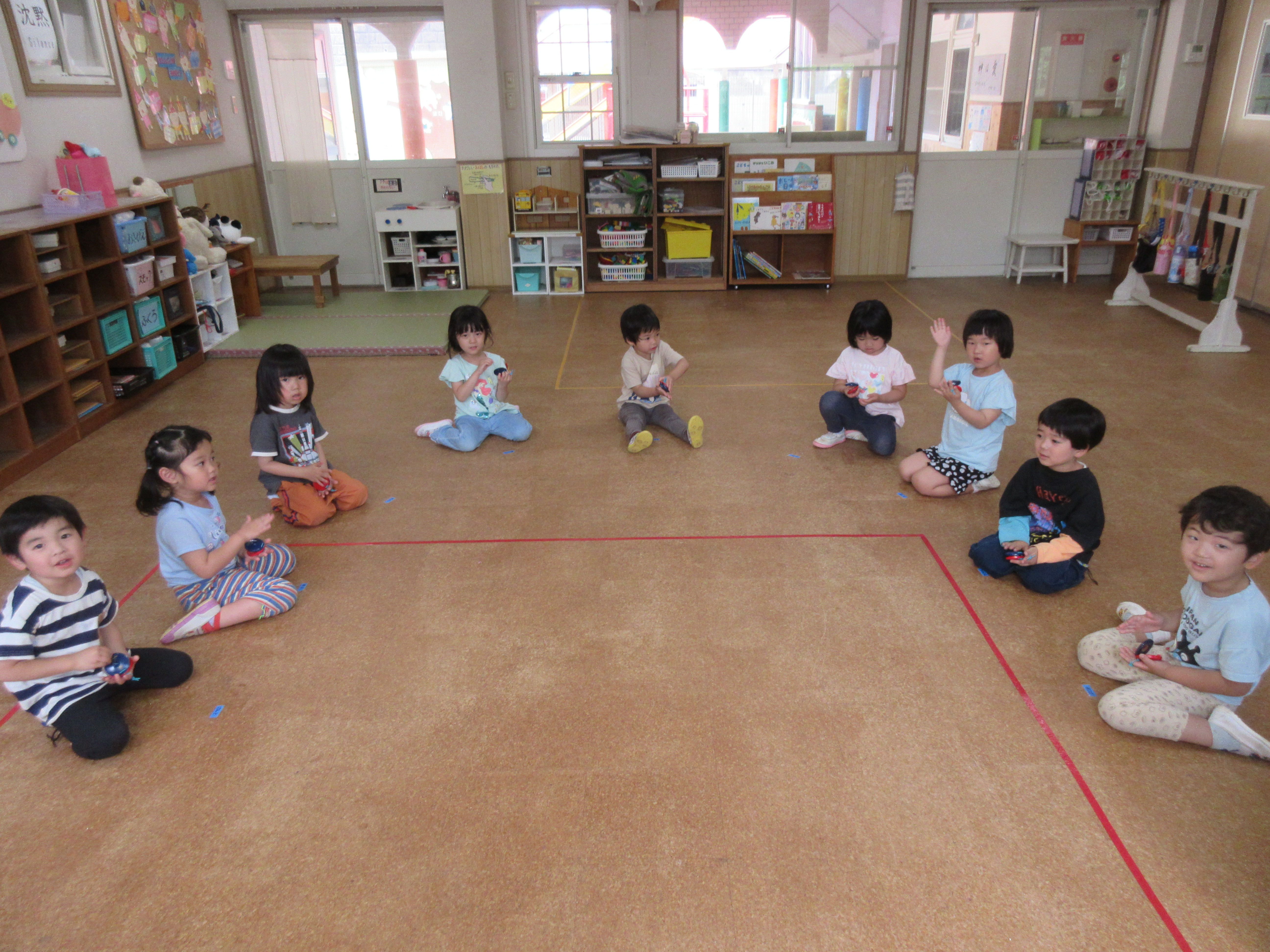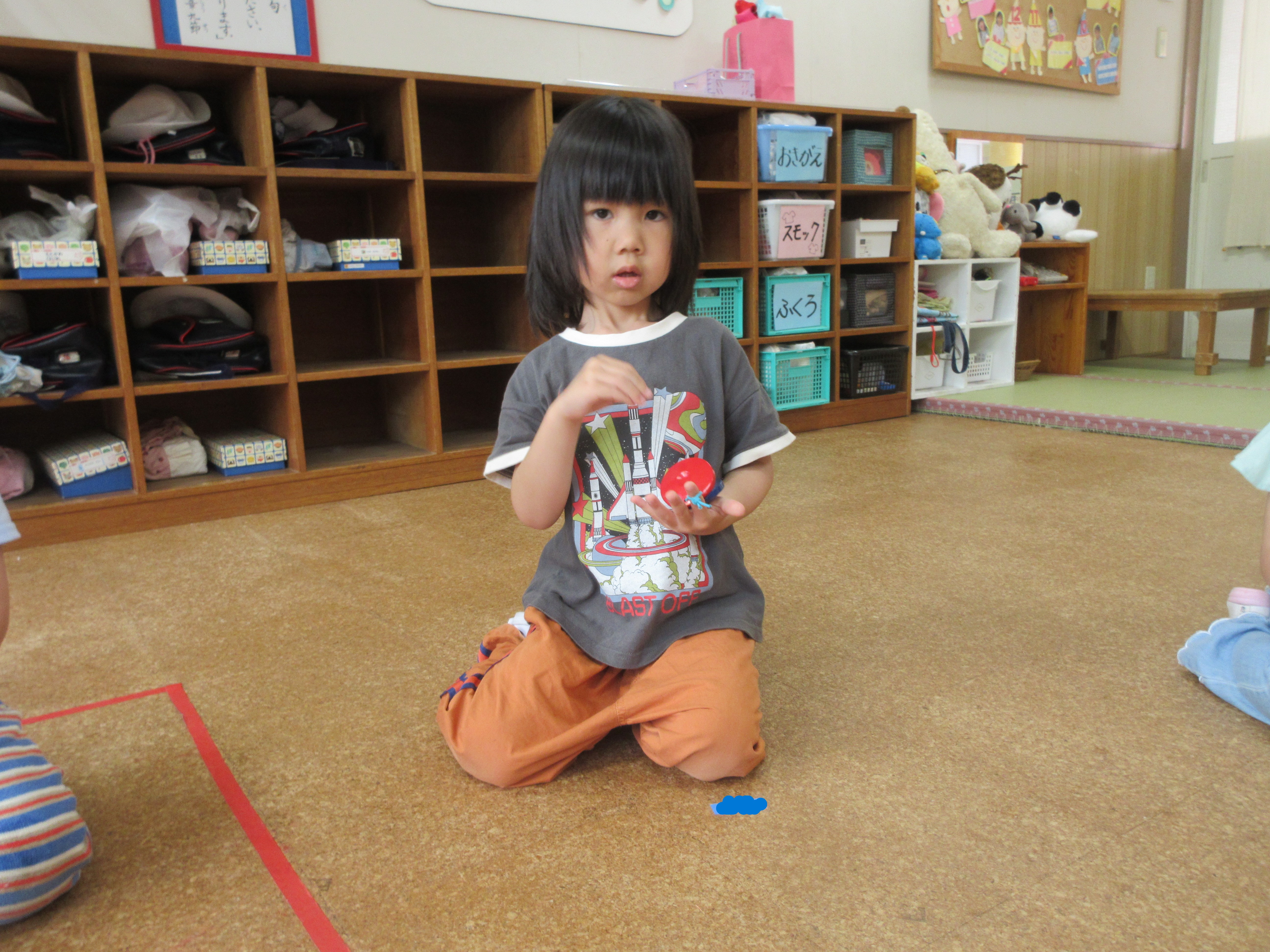 お部屋に入ってからはカスタネットで遊びました。「先生の真似っこをできるかな」と声をかけるとみんな見本をよく見て叩いていました。また、クラスのお友だちの名前にリズムを付けて叩くのは楽しそうな様子でした♪