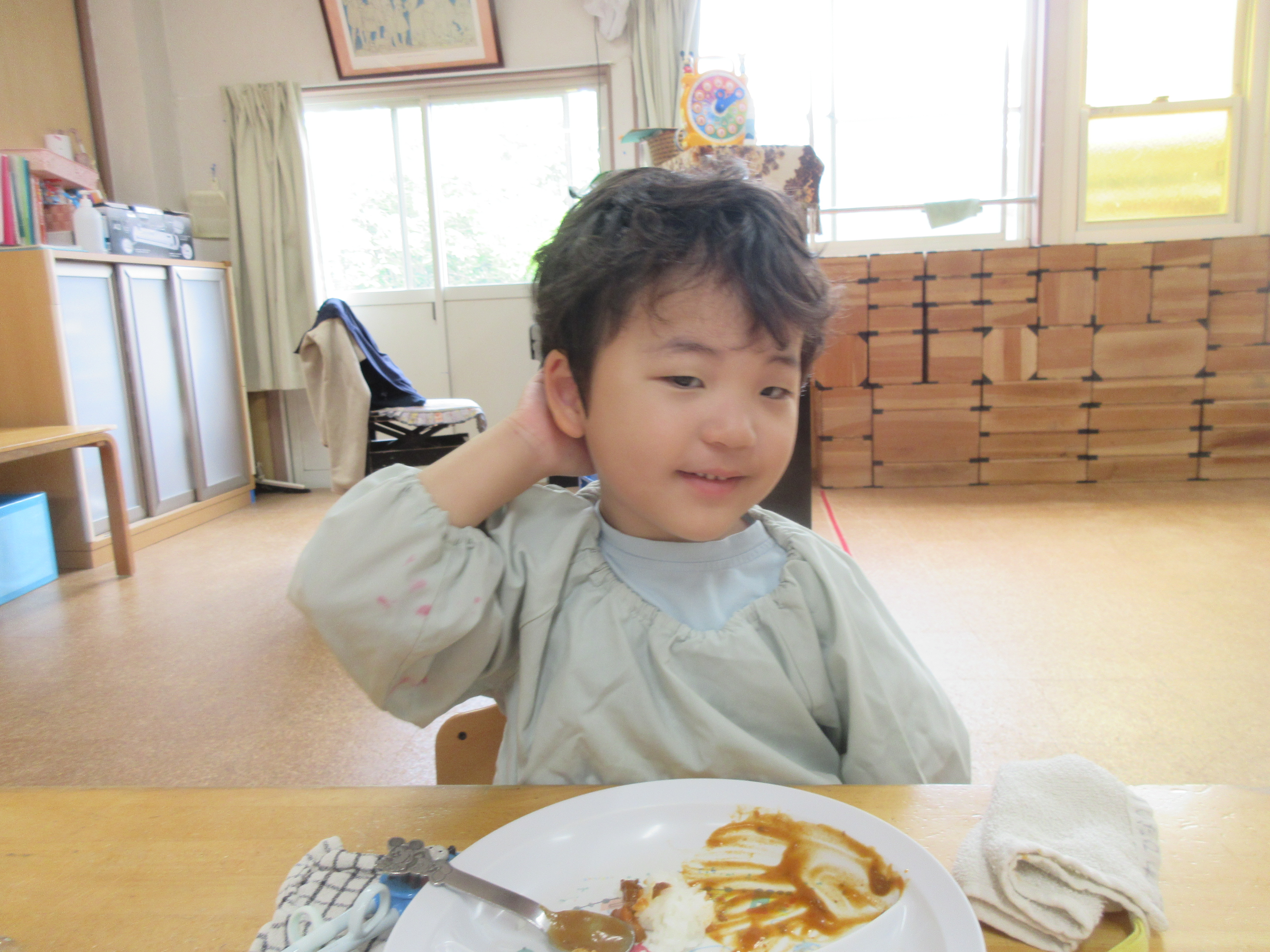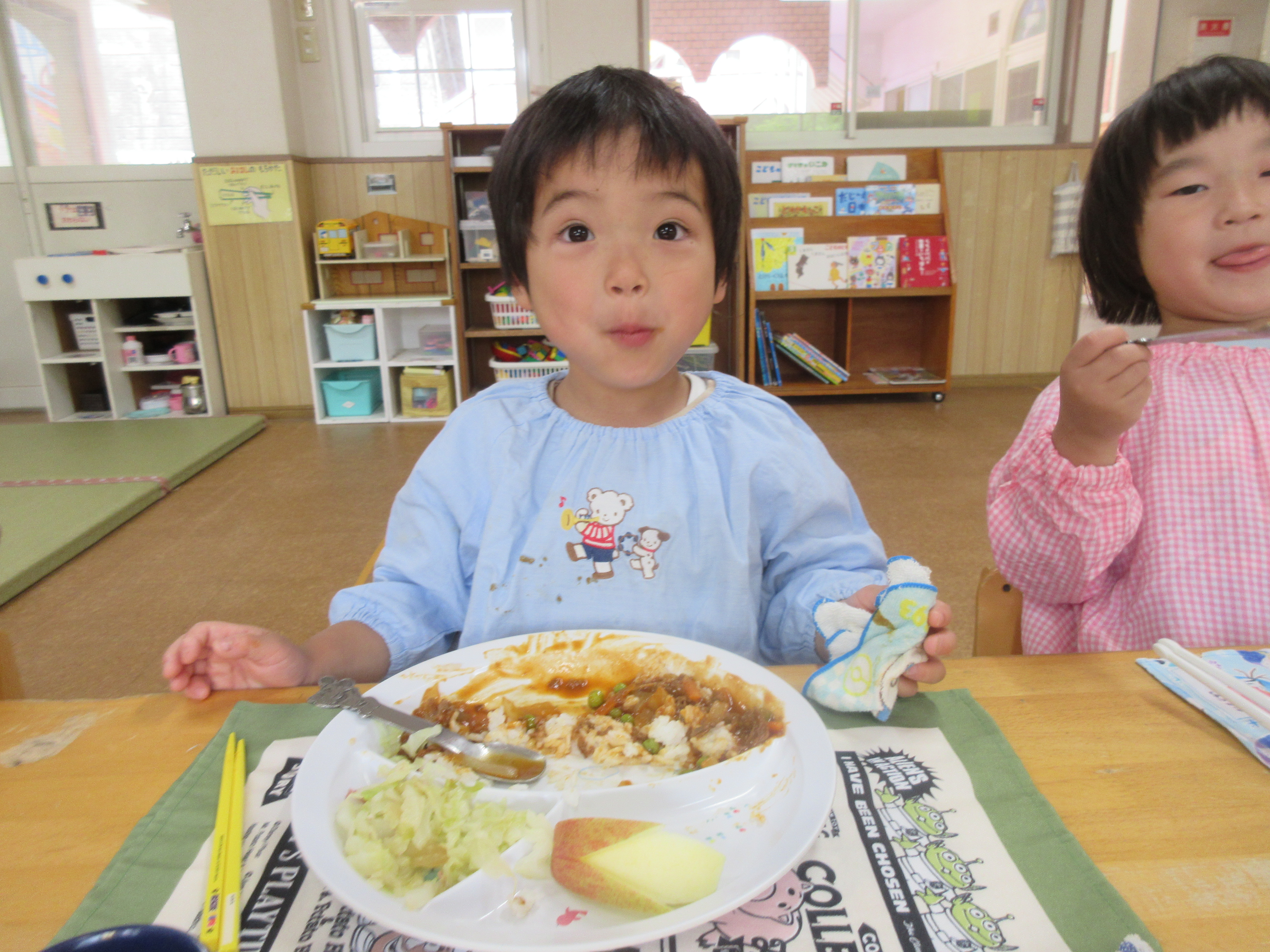 今日の給食はハヤシライス・蒸しキャベツ・リンゴでした。