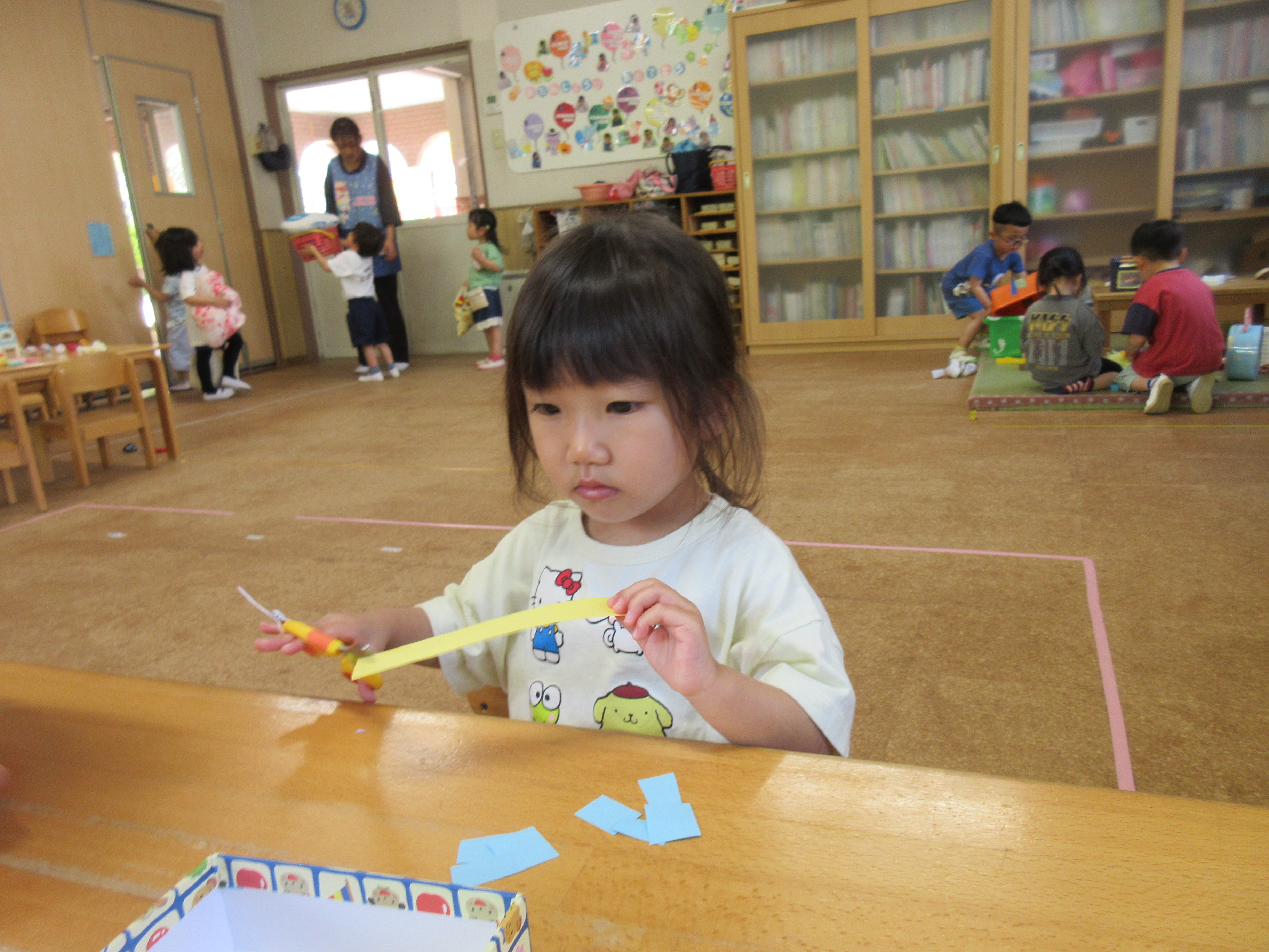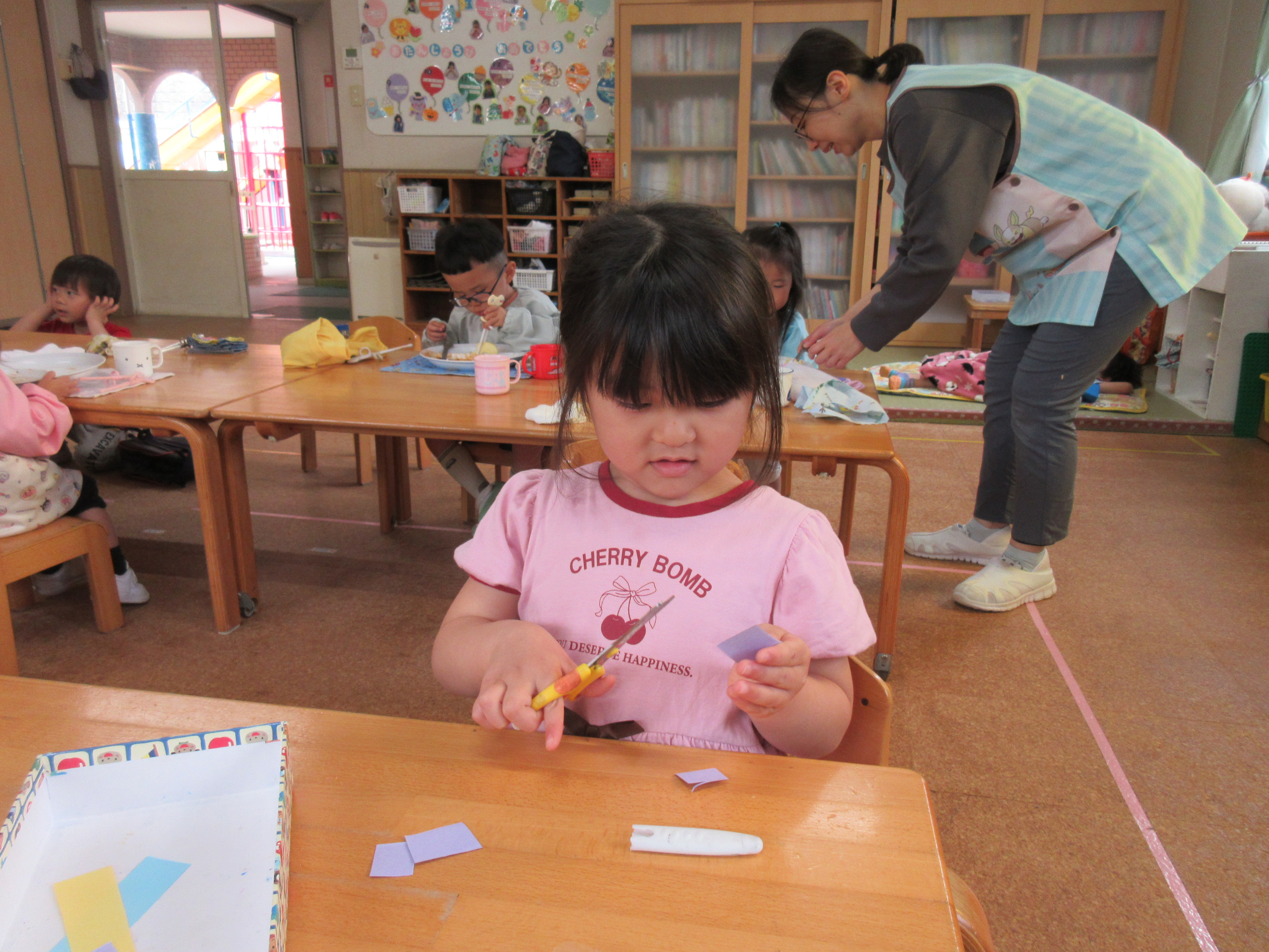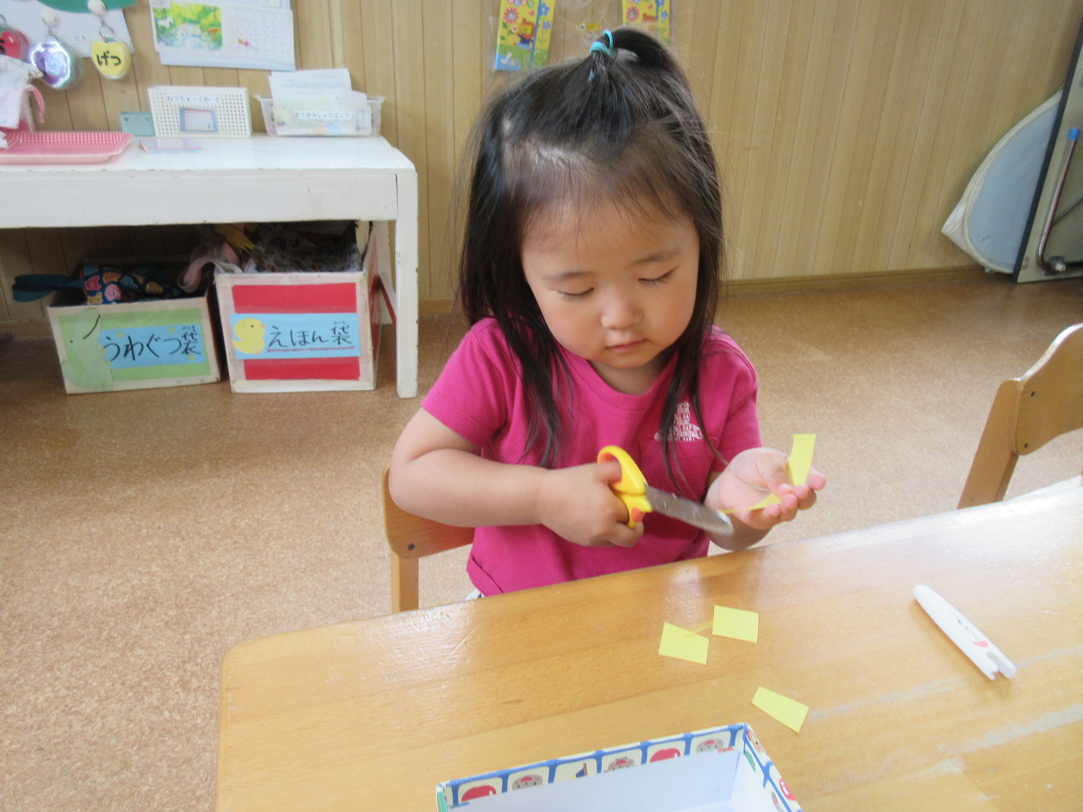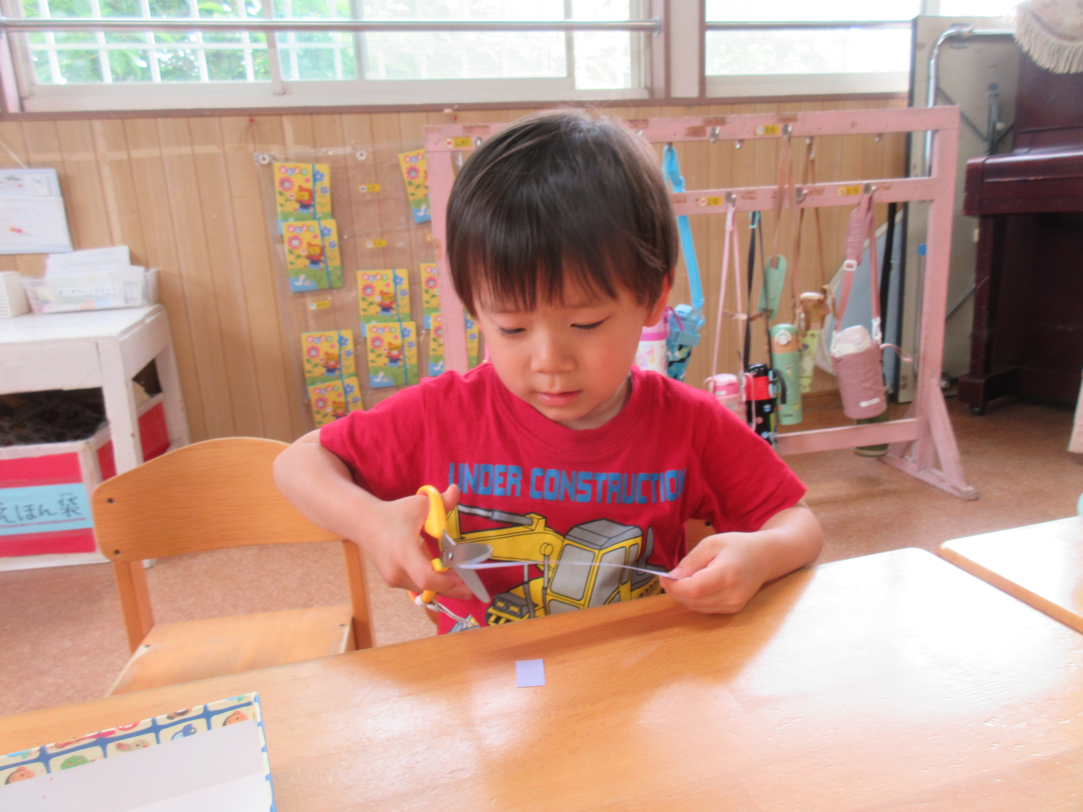 たんぽぽ組ではハサミの練習をスタートしました🎶初めてハサミを持つ子多く初めに約束事を伝え安全に持てるようにお話ししました!(^^)!まずは一回切りの練習をしました✄「むずかしいなぁ~」と苦戦しながらも頑張って取り組む子どもたちでした!
