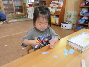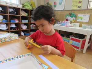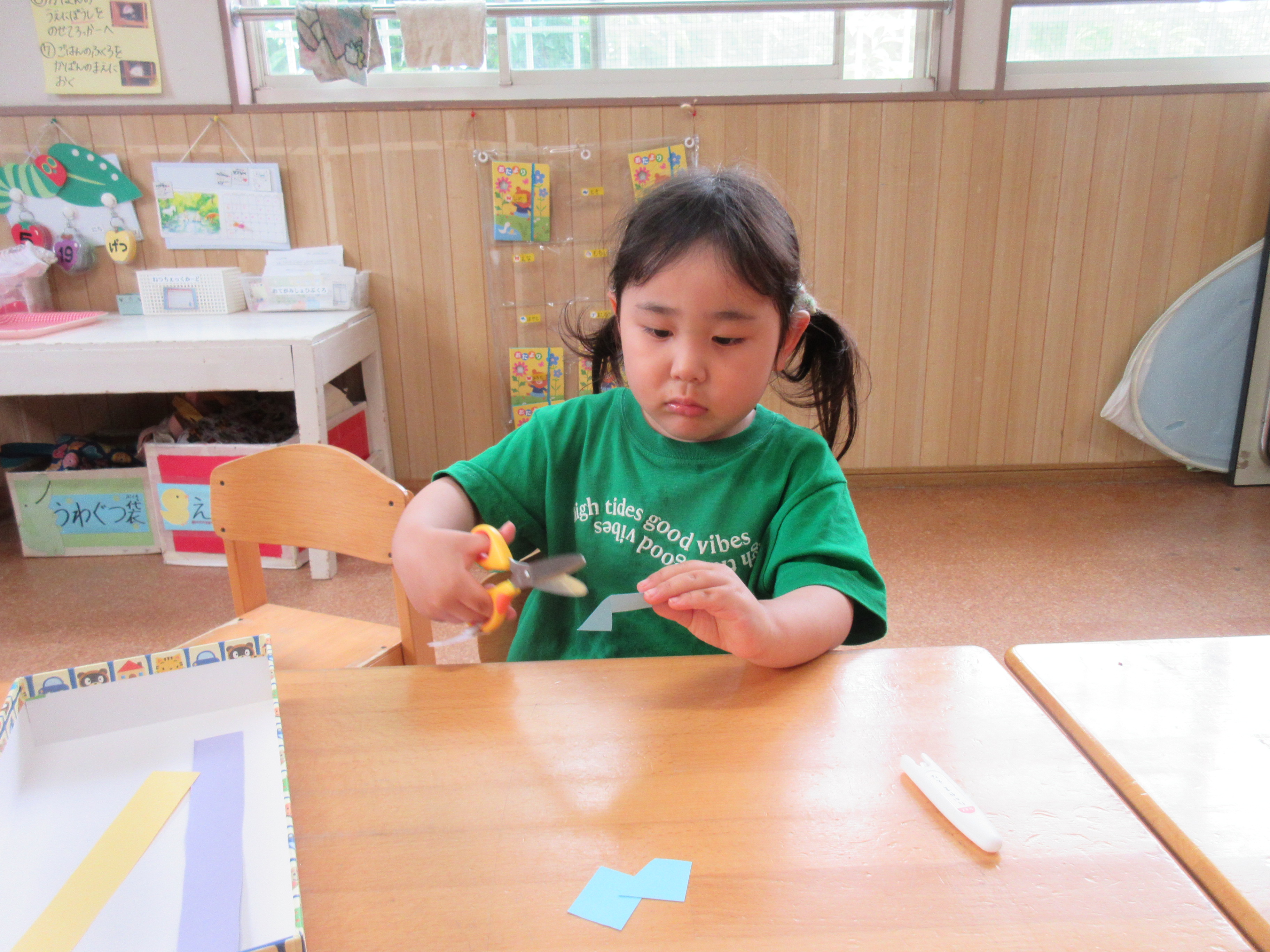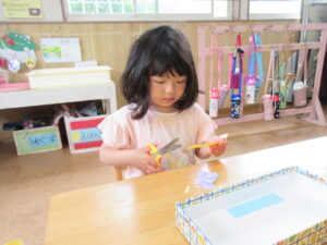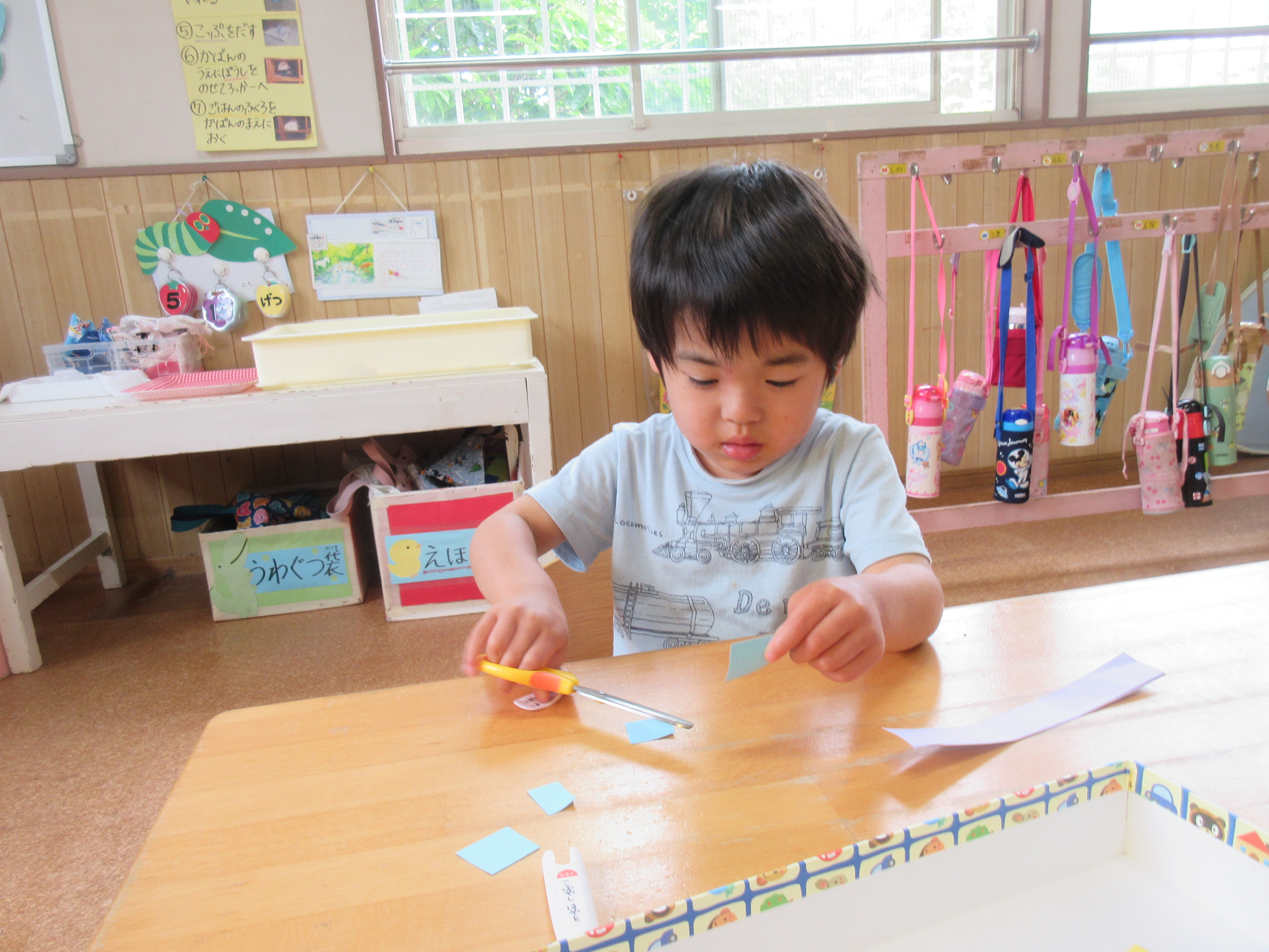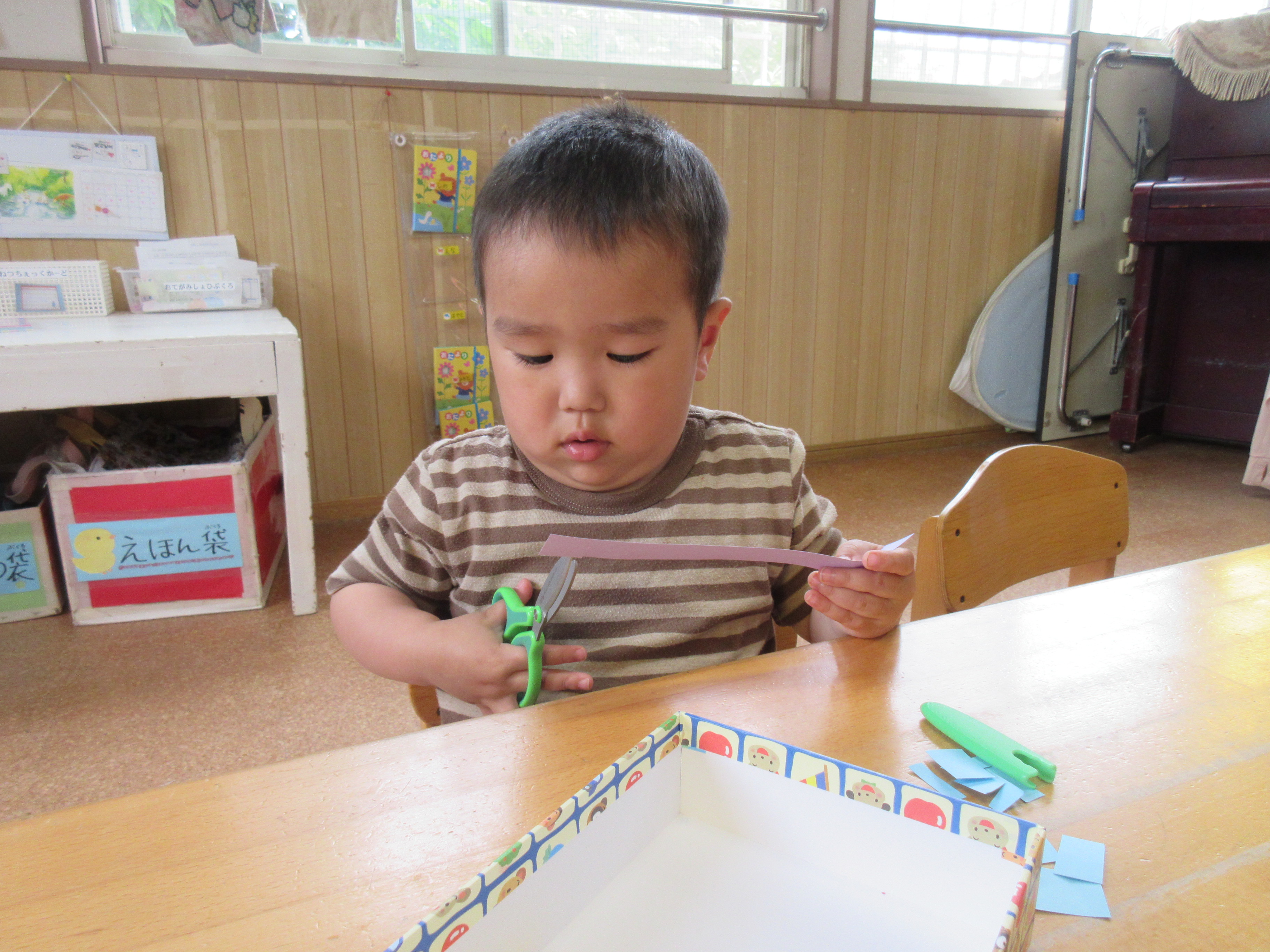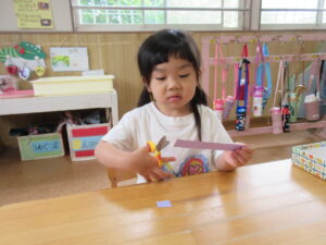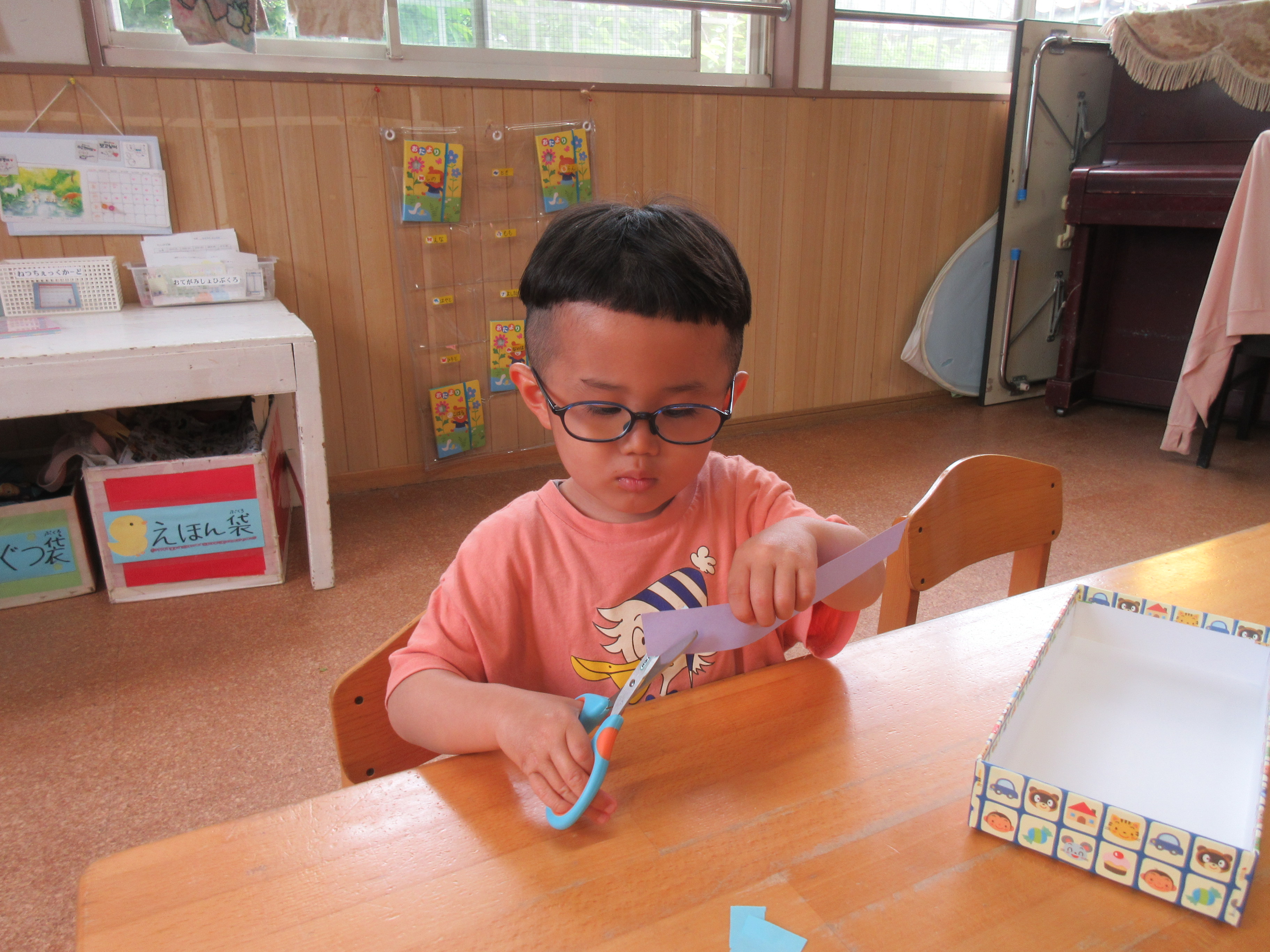 たんぽぽ組ではハサミの練習をスタートしました🎶初めてハサミを持つ子多く初めに約束事を伝え安全に持てるようにお話ししました!(^^)!まずは一回切りの練習をしました✄「むずかしいなぁ~」と苦戦しながらも頑張って取り組む子どもたちでした!