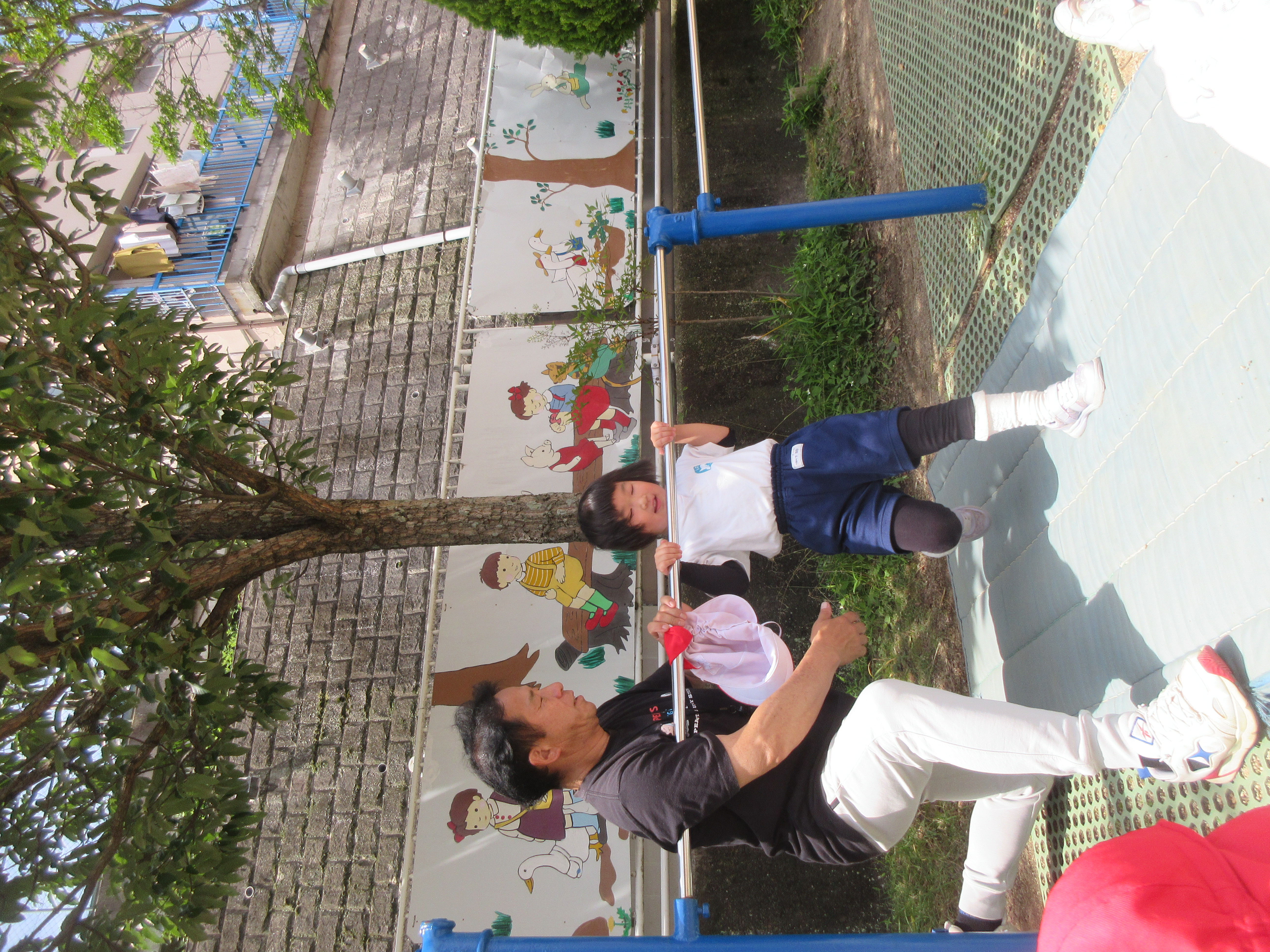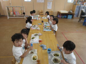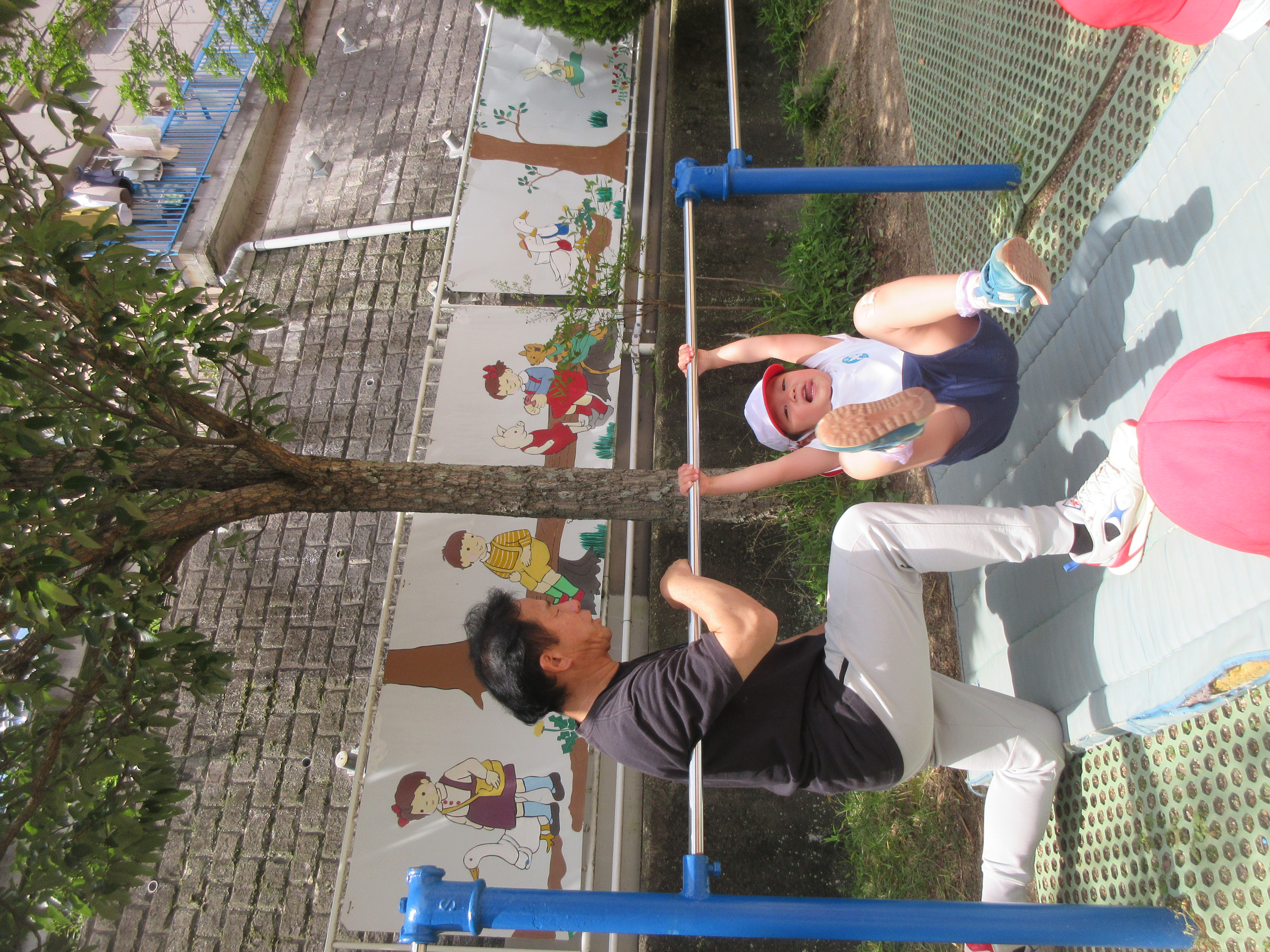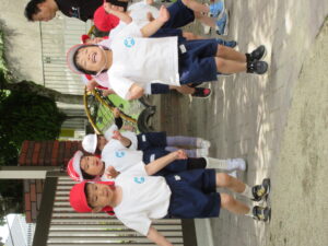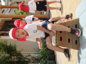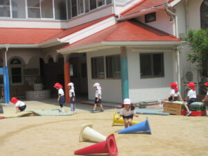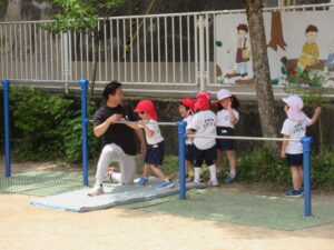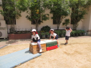 今日は体育あそびがありました。サーキットの中にある跳び箱でみんな列になって頑張る姿は可愛かったです♡また、鉄棒や縄跳びのジャンプの練習をしました!暑い中ではありましたが、最後まで頑張っている子どもたちでした。