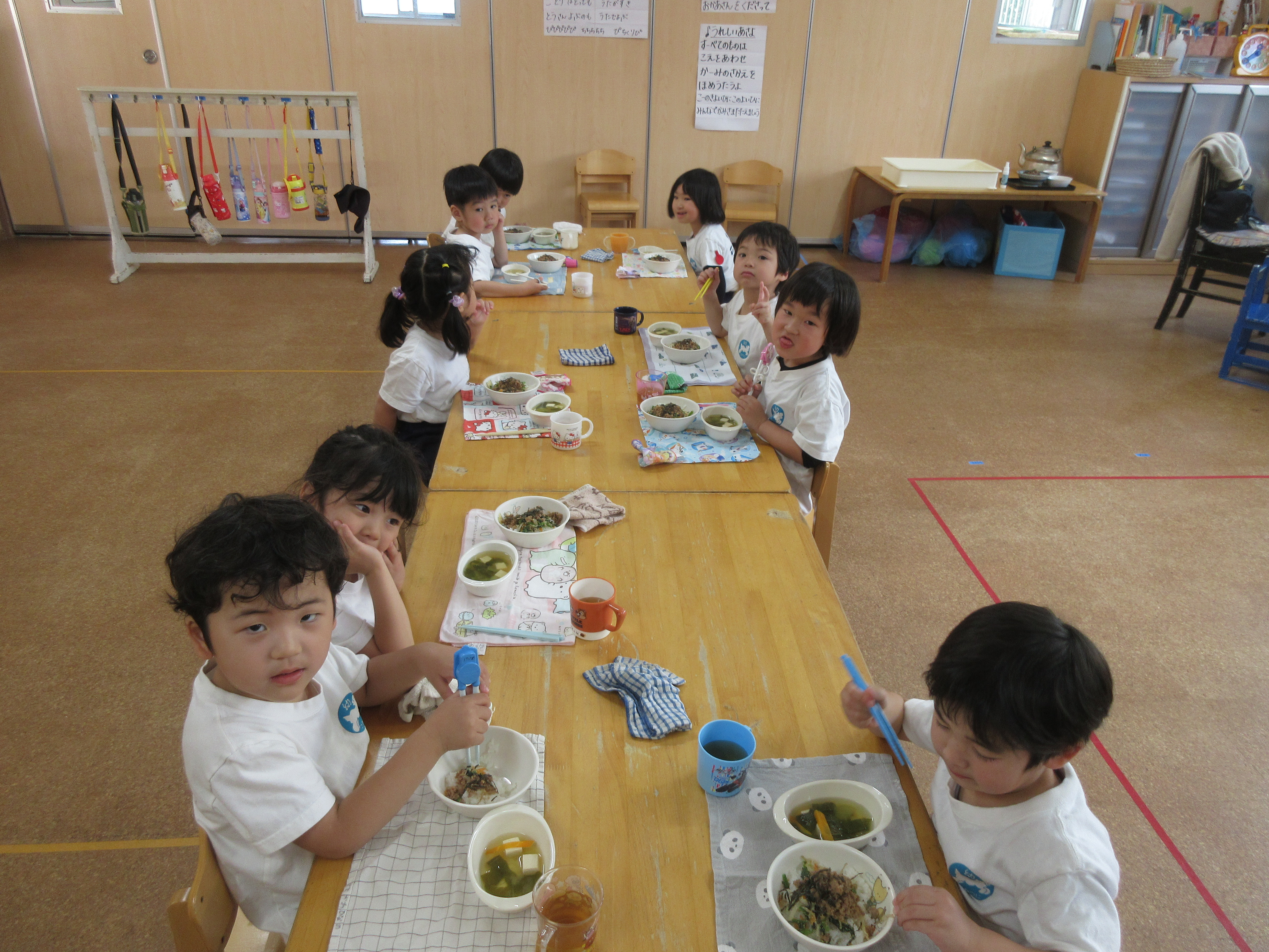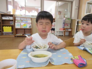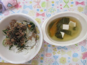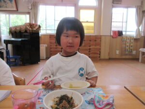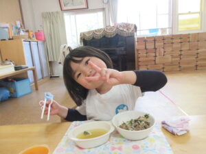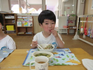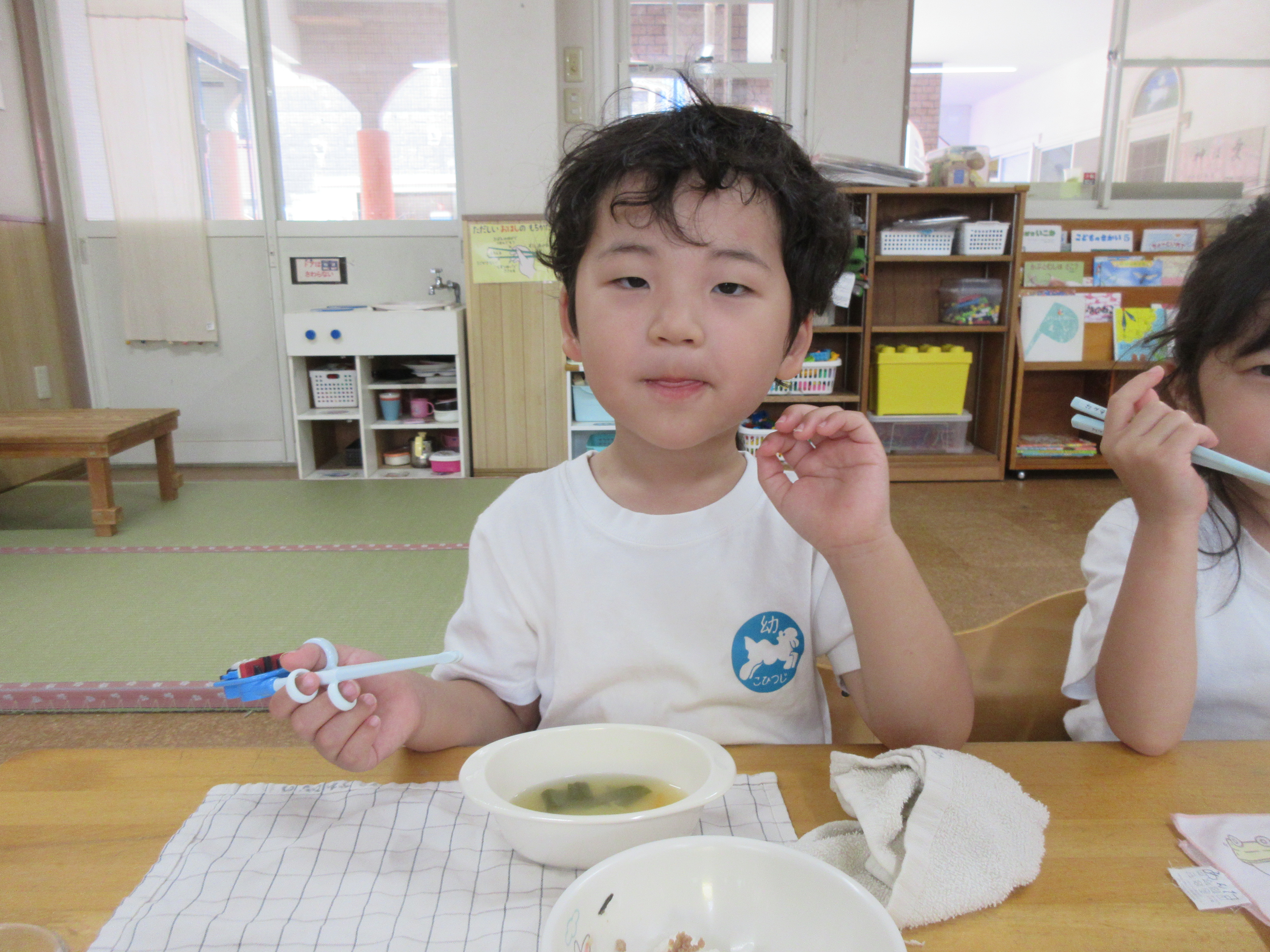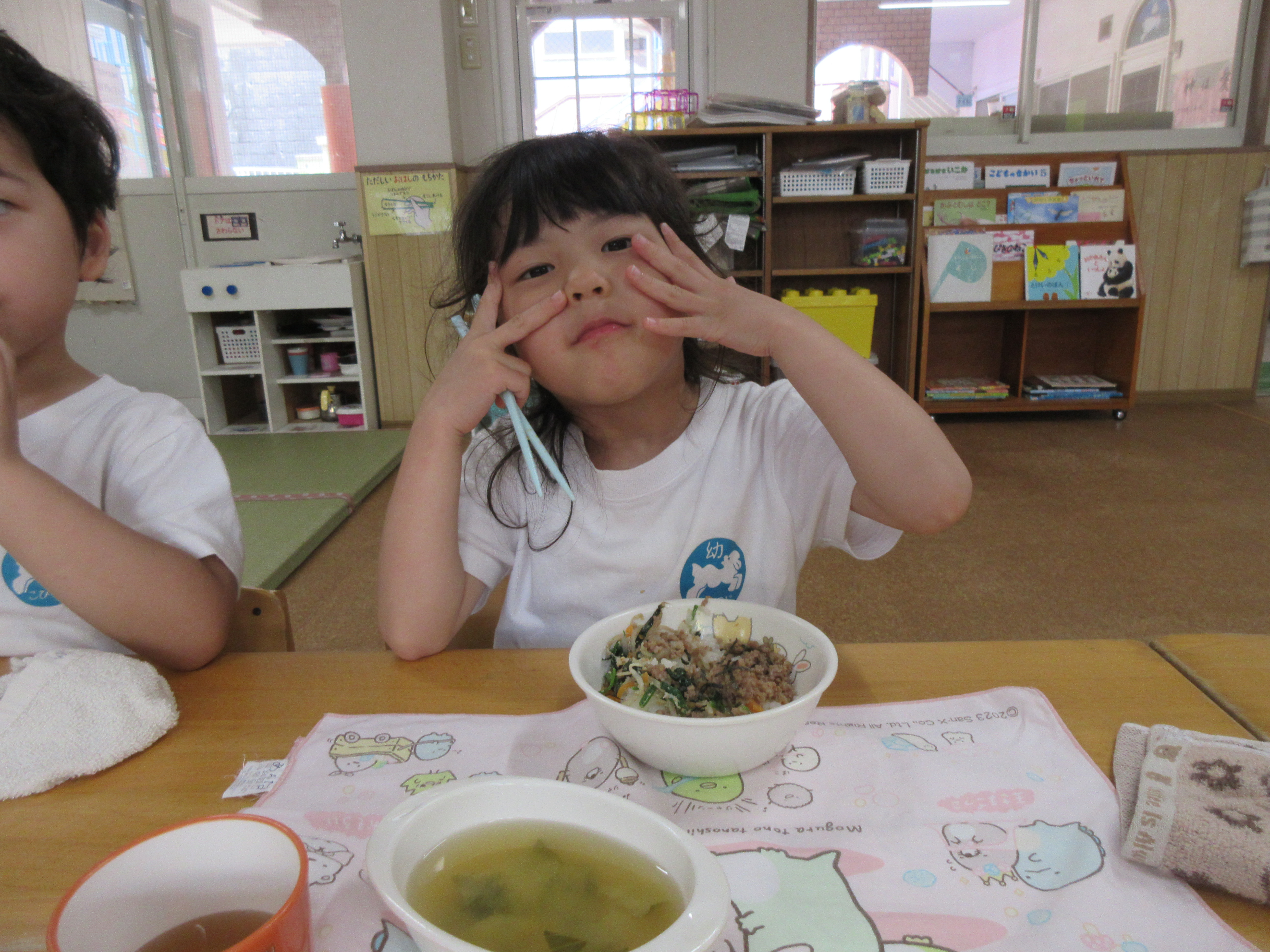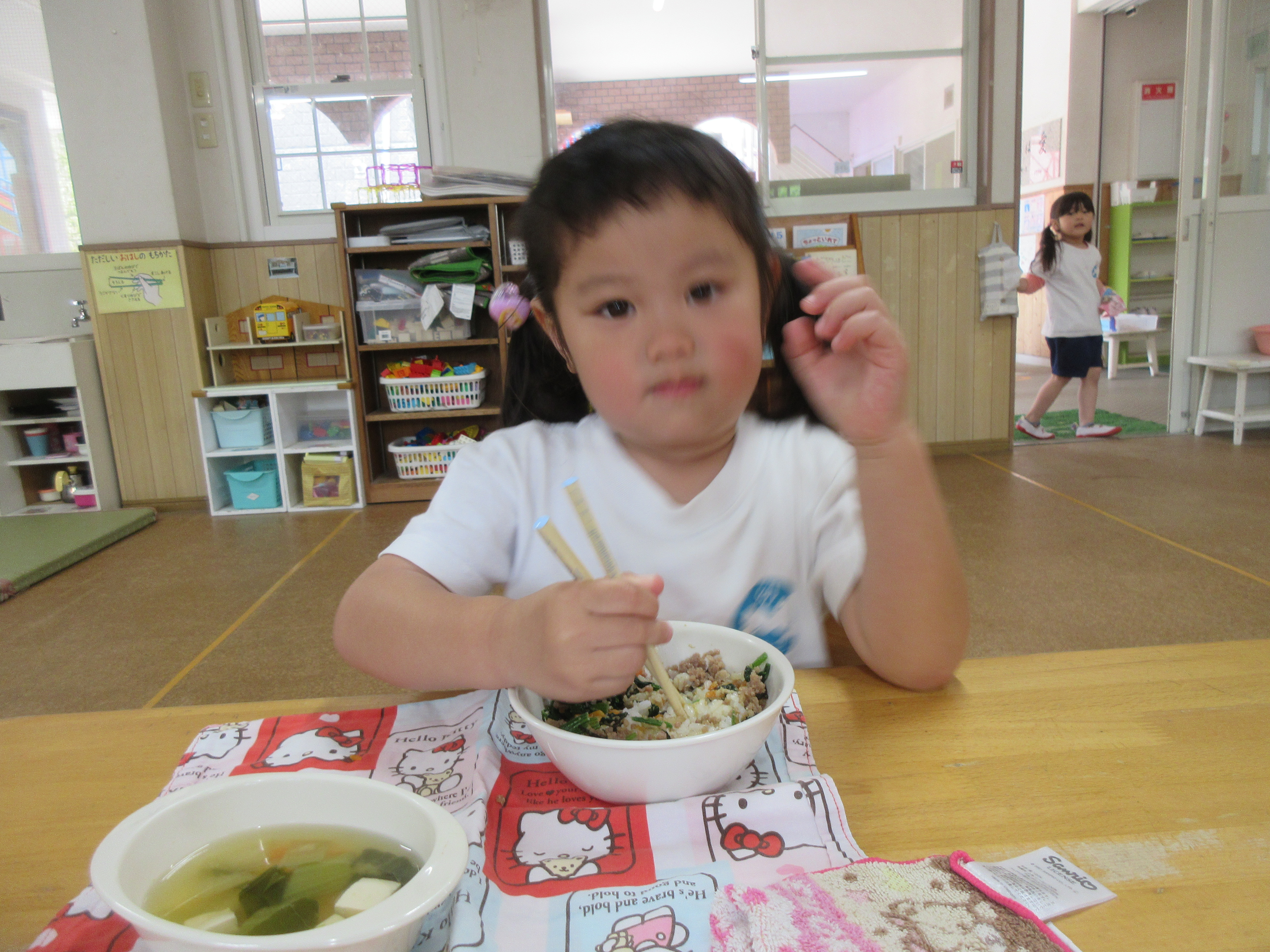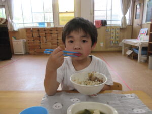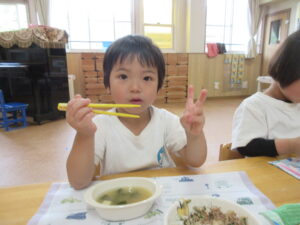 今日の給食はビビンバ丼・お味噌汁でした。お箸で食べる練習を頑張っています!!!