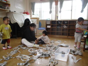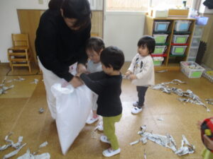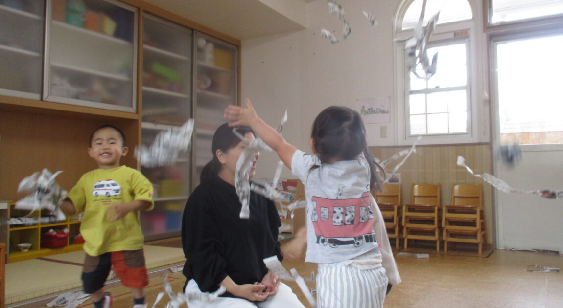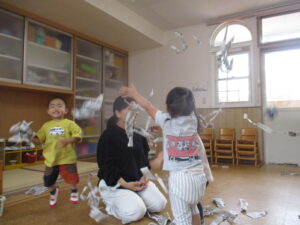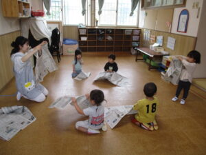 木曜日は、お部屋で新聞遊びをしました📰 新聞紙を破って丸めたり、お布団代わりにしてみたり、細長く破ってシャワーにしてみたり・・・みんなとても楽しそうに遊んでいました!子どもたちの発想がとても面白かったです🎵