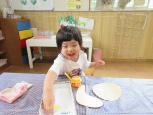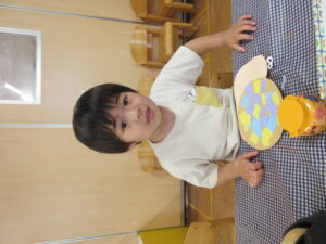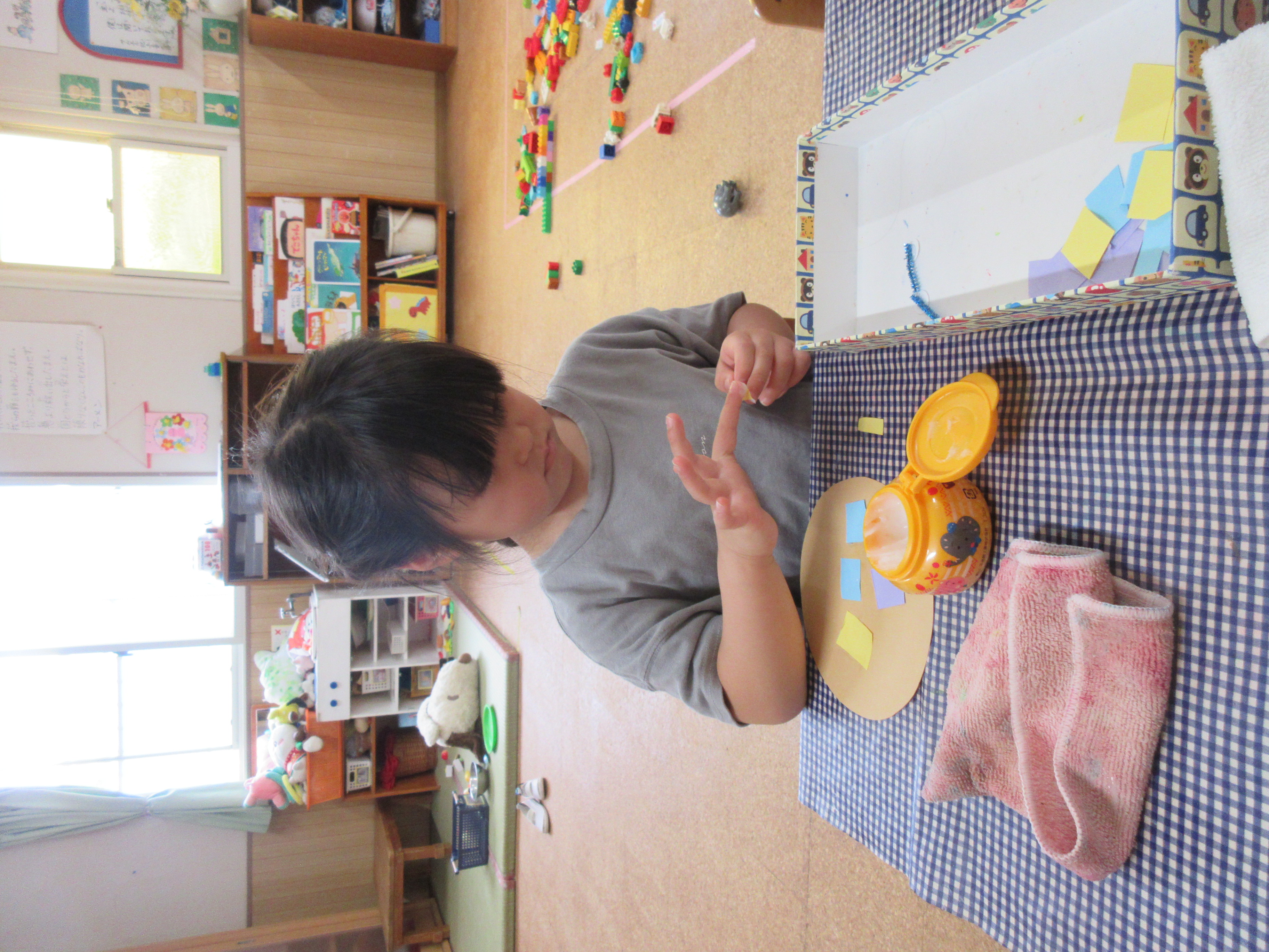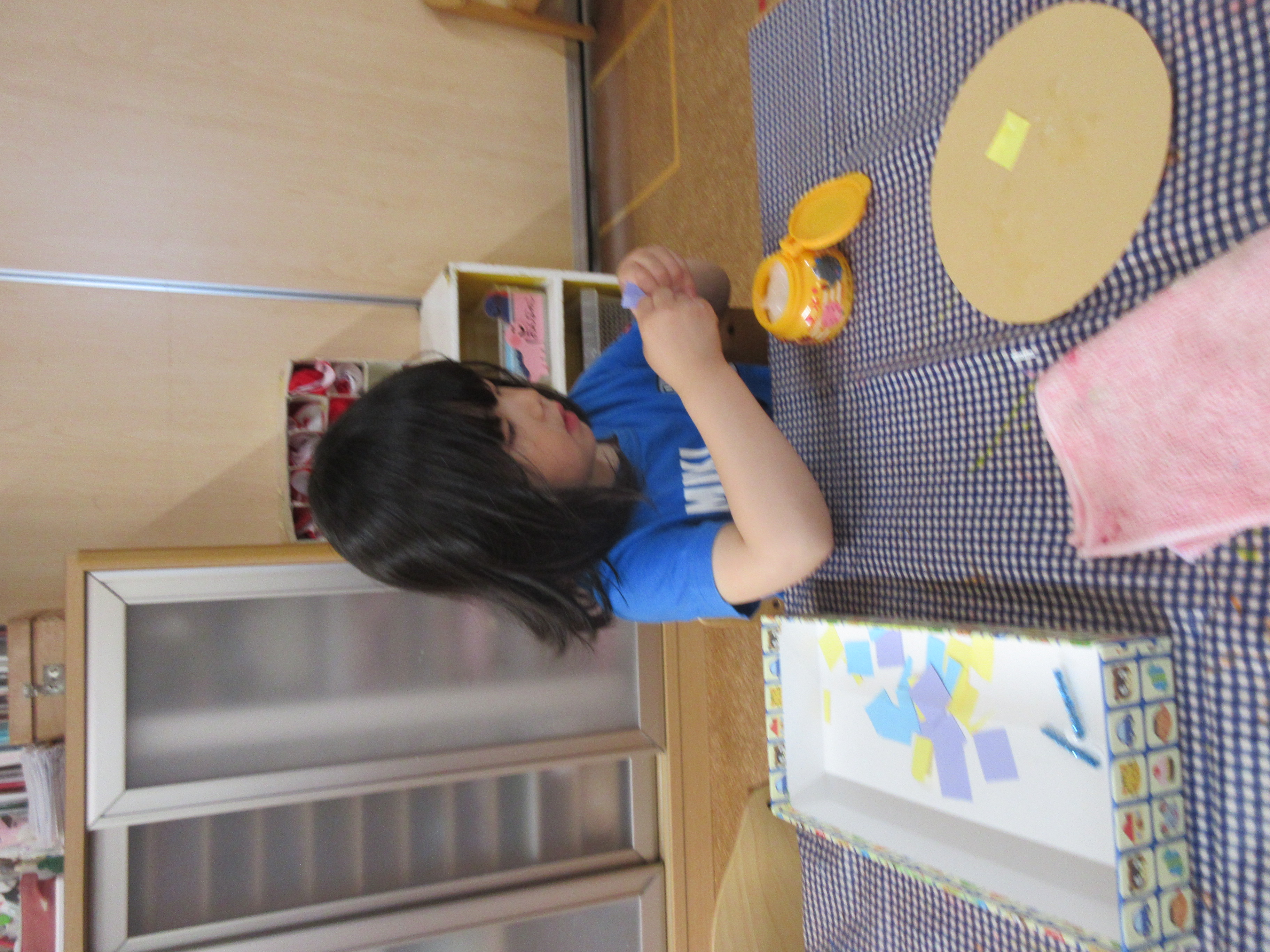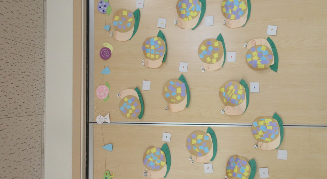 先日、ハサミで一回切りした画用紙を糊で貼り付けをしてカタツムリの模様を付けました♪「ぬりぬり~」と糊を塗る姿はとっても可愛らしかったです♡出来上がった作品はお部屋に飾り自分のカタツムリを探す子どもたちでした!